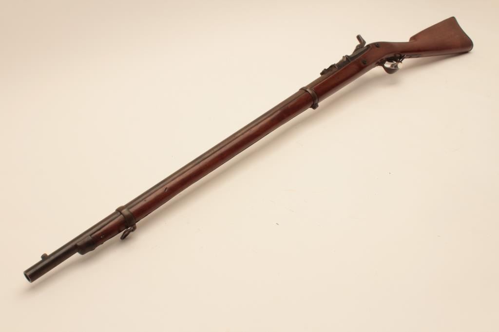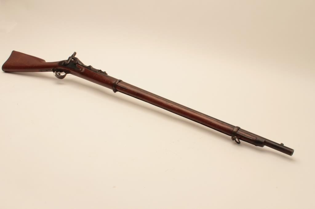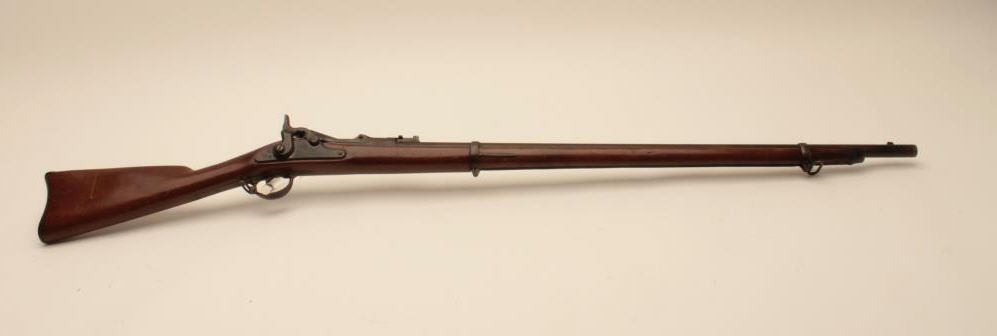 17MJ-7 SPRINGFIELD #NSNVU.S. Springfield Model 1870 trapdoor rifle, .50 caliber, 33” barrel, dark patina mixed with old re-blue, wood stock, missing ramrod, S/N 33645, in overall fair + condition with a good bore, crisp action, stock repaired atwrist and re-finished. (Antique). Est.: $150-$300.U.S. Springfield Model 1870 trapdoor rifle, .50 caliber, 33” barrel, dark patina mixed with old re-blue, wood stock, missing ramrod, S/N 33645, in overall fair + condition with a good bore, crisp action, stock repaired atwrist and re-finished. (Antique). Est.: $150-$300.