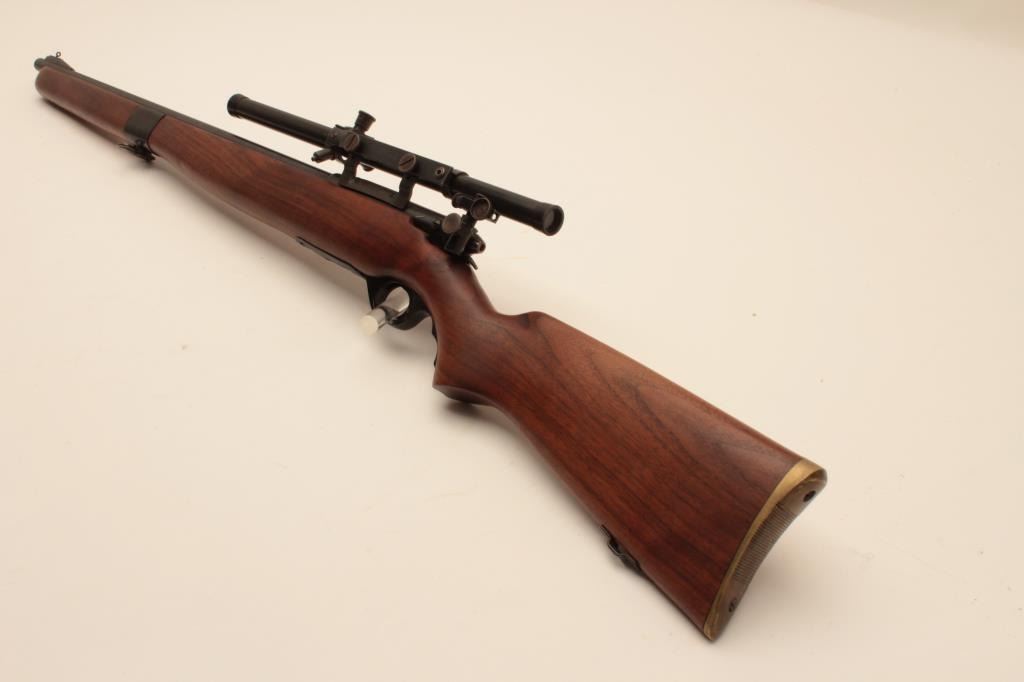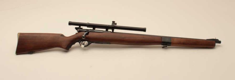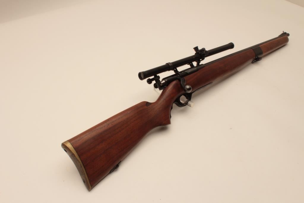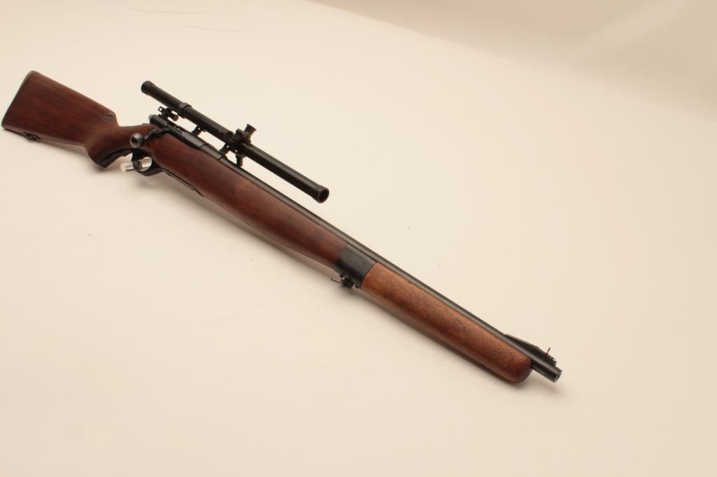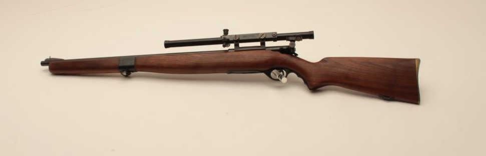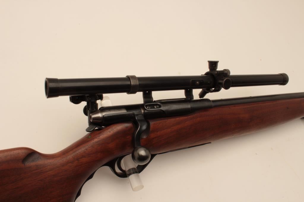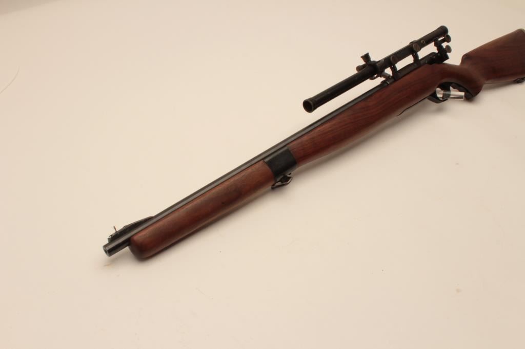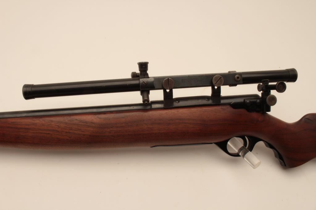 17KH-574 MOSSBERGU.S. Property-marked Mossberg Model 42M-B bolt action rifle, .22LR caliber, blued finish, wood stock, no visible S/N, mounted with an un-marked tube scope and Wards Model 20 base displaying good optics; rifle is inoverall good + condition with a good bore, crisp action and good wood stock. (Modern/PPT). Est.: $200-$400.U.S. Property-marked Mossberg Model 42M-B bolt action rifle, .22LR caliber, blued finish, wood stock, no visible S/N, mounted with an un-marked tube scope and Wards Model 20 base displaying good optics; rifle is inoverall good + condition with a good bore, crisp action and good wood stock. (Modern/PPT). Est.: $200-$400.