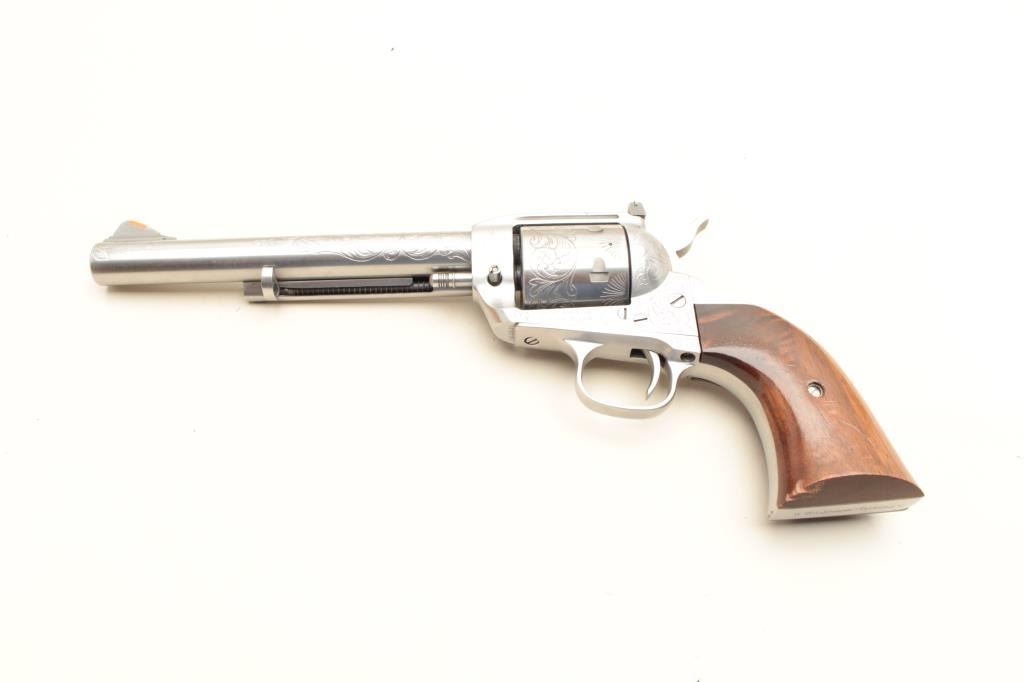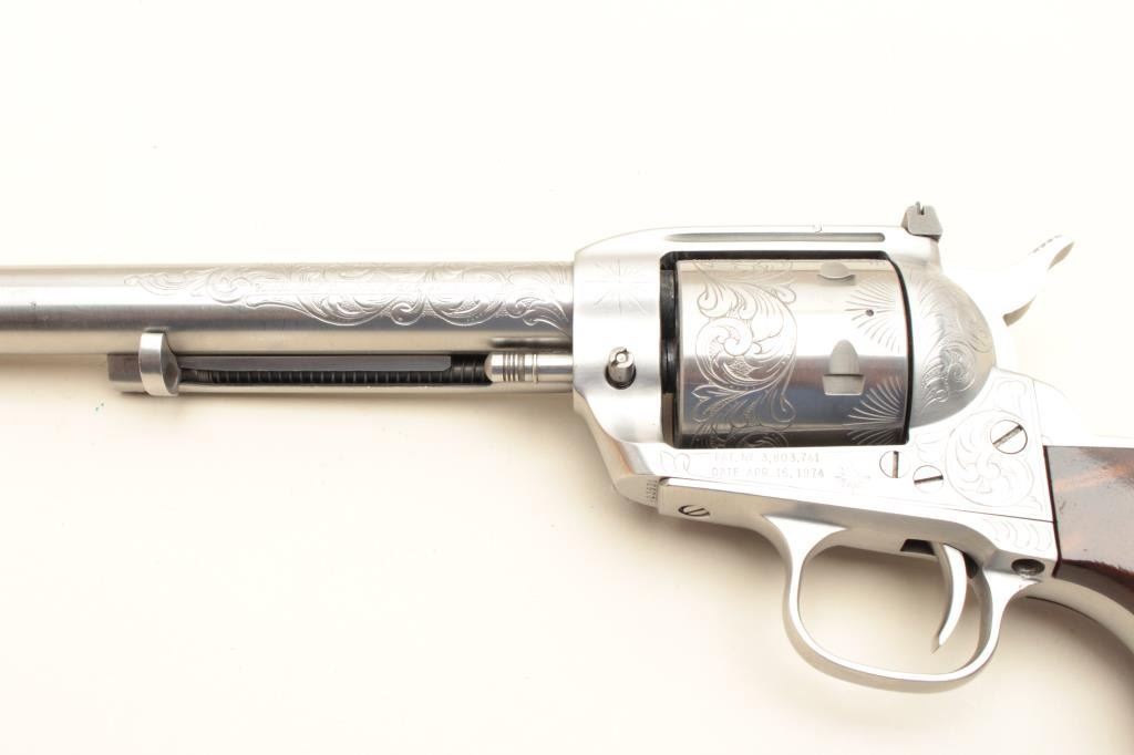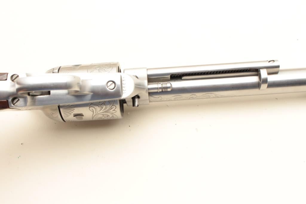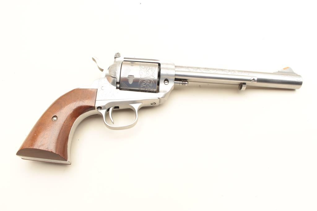 17KH-229 DRAGOONVirginia Dragoon/Interarms single action revolver, .44 magnum caliber, 7.5” barrel, engraved, stainless, wood grips, S/N S13931, in overall very good to near fine condition with a crisp action, tasteful engraving, very good markings and bore, good grips with a couple small dings to the bottom of the left grip. (Modern/PPT). Est.: $300-600Virginia Dragoon/Interarms single action revolver, .44 magnum caliber, 7.5” barrel, engraved, stainless, wood grips, S/N S13931, in overall very good to near fine condition with a crisp action, tasteful engraving, very good markings and bore, good grips with a couple small dings to the bottom of the left grip. (Modern/PPT). Est.: $300-600