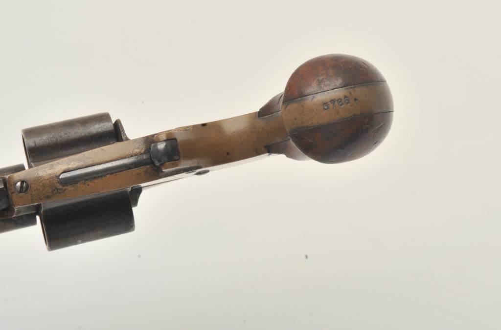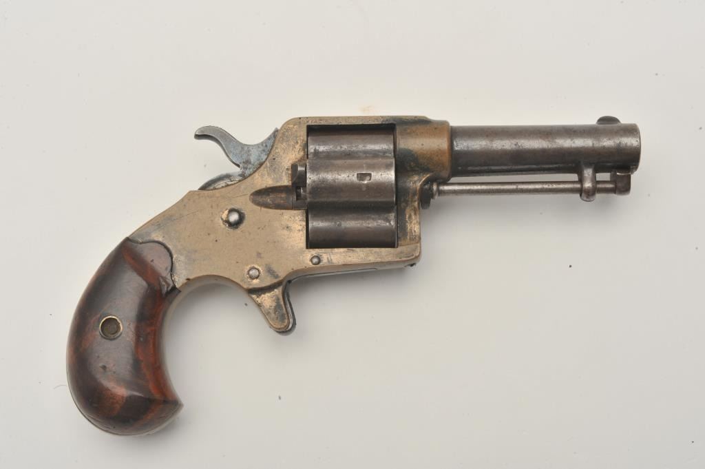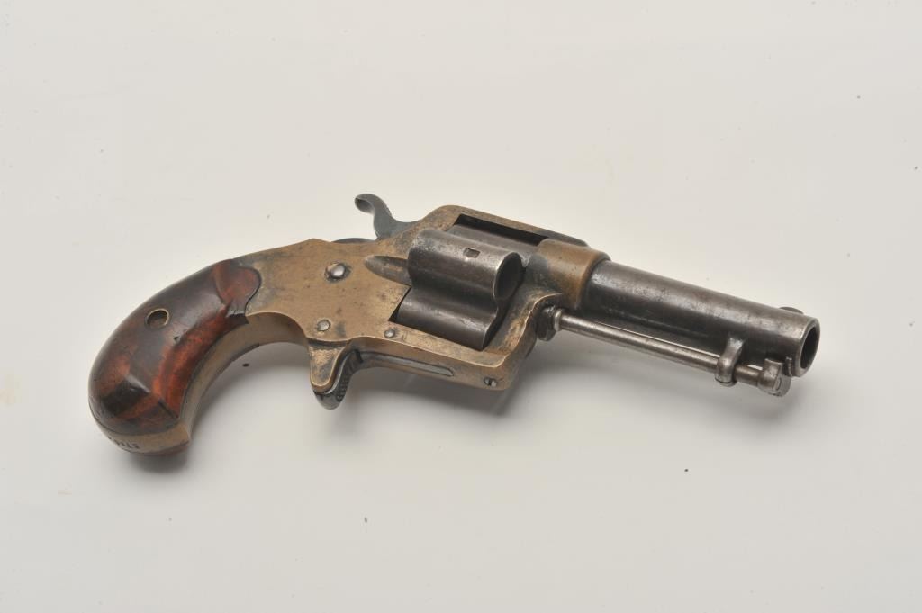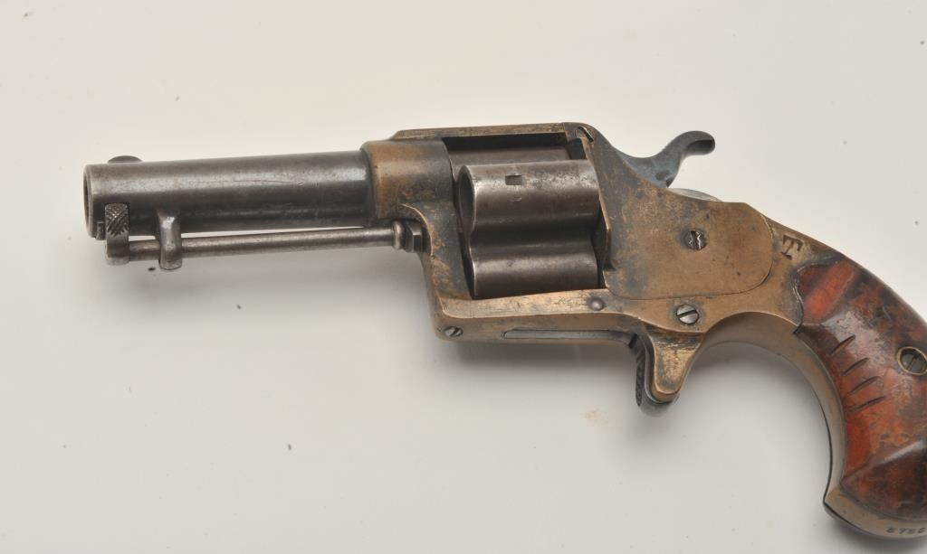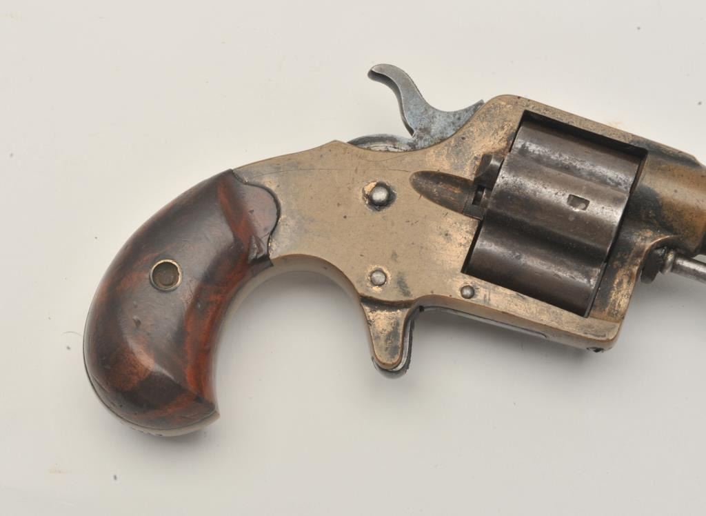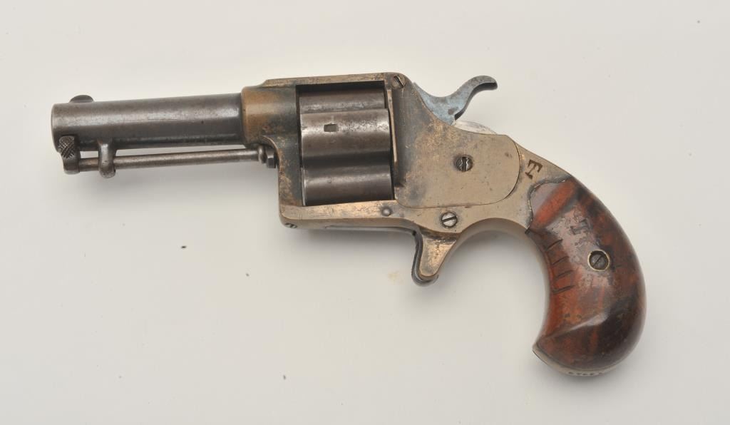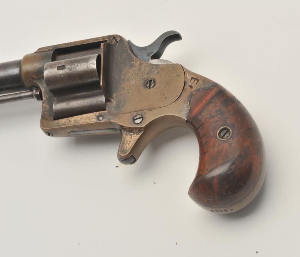 18EMY-18 COLT CLOVERLEAF #5786Colt Cloverleaf Model spur trigger revolver, .41 caliber, 3” barrel, brass frame, blued finish to barrel and cylinder, wood grips, S/N 5786, in overall good to very good condition with a crisp action, sharpmarkings, nice patina to brass frame, traces of original blued finish in protected areas; originally in the Jonathan Tibbet (1822-1904) collection, an early Riverside, CA businessman who made his fortune in theCalifornia Gold Rush in Placerville, later moving to Southern California. This Colt was part of his extensive artifact collection that the family later donated to the Claremont, CA. colleges museum. An earlynewspaper article (Xerox copy included) covers the opening of the display and stated “Articles of priceless value that can never be duplicated are included in the Collection. Famous muskets and pistols of noted western characters, pioneer relics, Indian baskets and weavings are but a few of the many cataloged articles”. A “T” is stamped on the left rear side of the frame and left grip along with 4 “hash marks” (“T” was stamped onColt Cloverleaf Model spur trigger revolver, .41 caliber, 3” barrel, brass frame, blued finish to barrel and cylinder, wood grips, S/N 5786, in overall good to very good condition with a crisp action, sharpmarkings, nice patina to brass frame, traces of original blued finish in protected areas; originally in the Jonathan Tibbet (1822-1904) collection, an early Riverside, CA businessman who made his fortune in theCalifornia Gold Rush in Placerville, later moving to Southern California. This Colt was part of his extensive artifact collection that the family later donated to the Claremont, CA. colleges museum. An earlynewspaper article (Xerox copy included) covers the opening of the display and stated “Articles of priceless value that can never be duplicated are included in the Collection. Famous muskets and pistols of noted western characters, pioneer relics, Indian baskets and weavings are but a few of the many cataloged articles”. A “T” is stamped on the left rear side of the frame and left grip along with 4 “hash marks” (“T” was stamped on