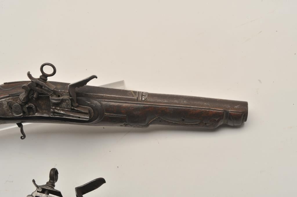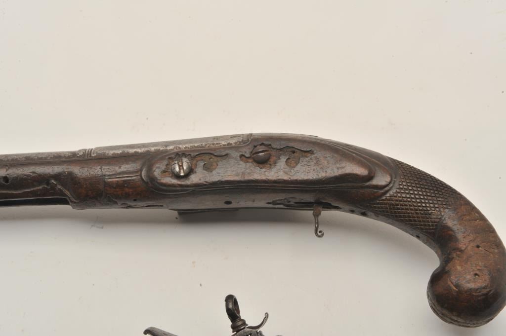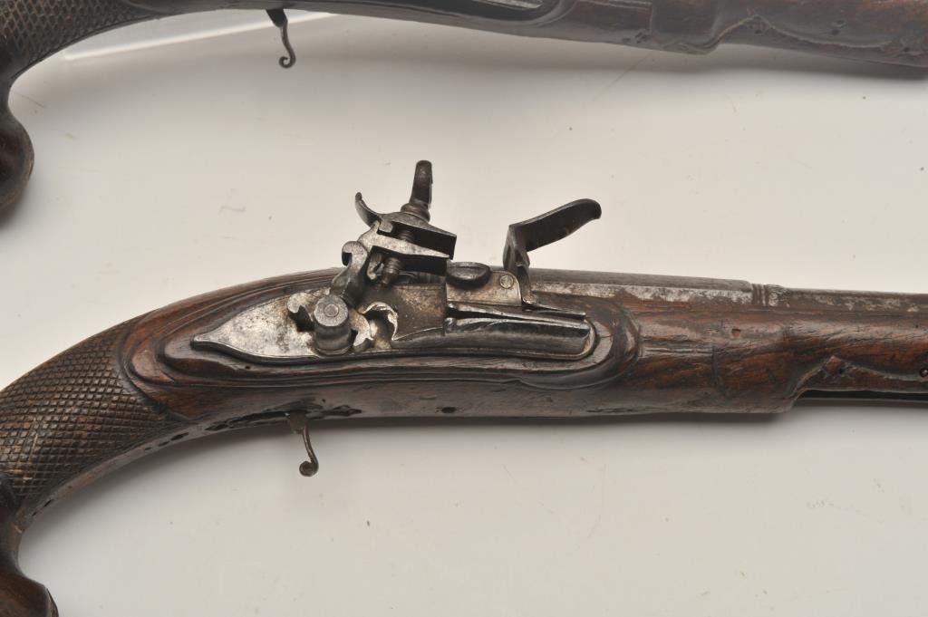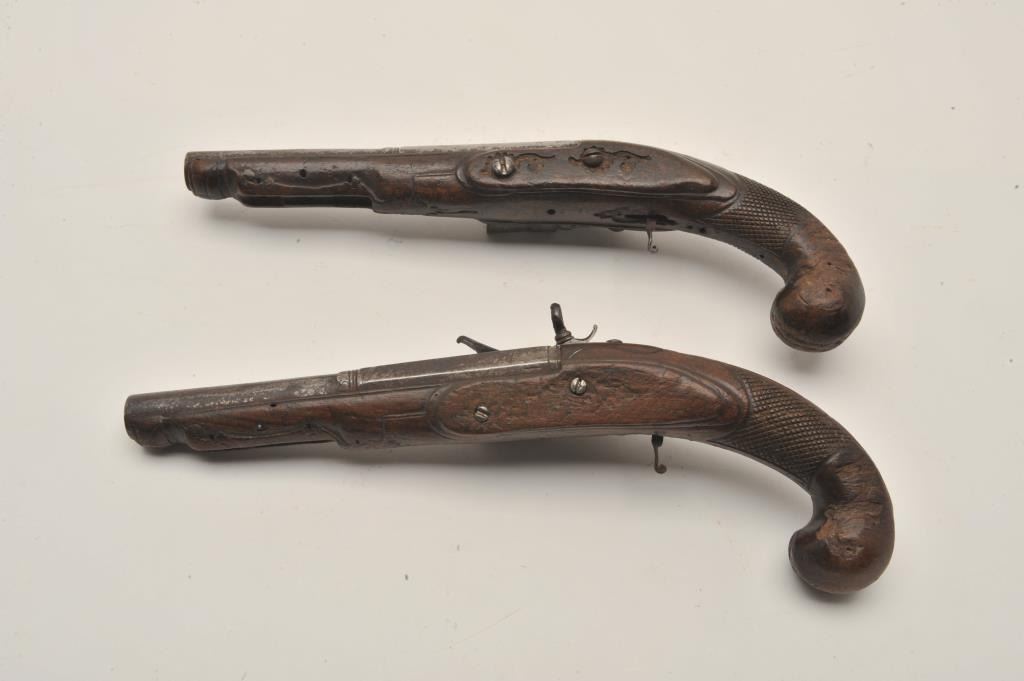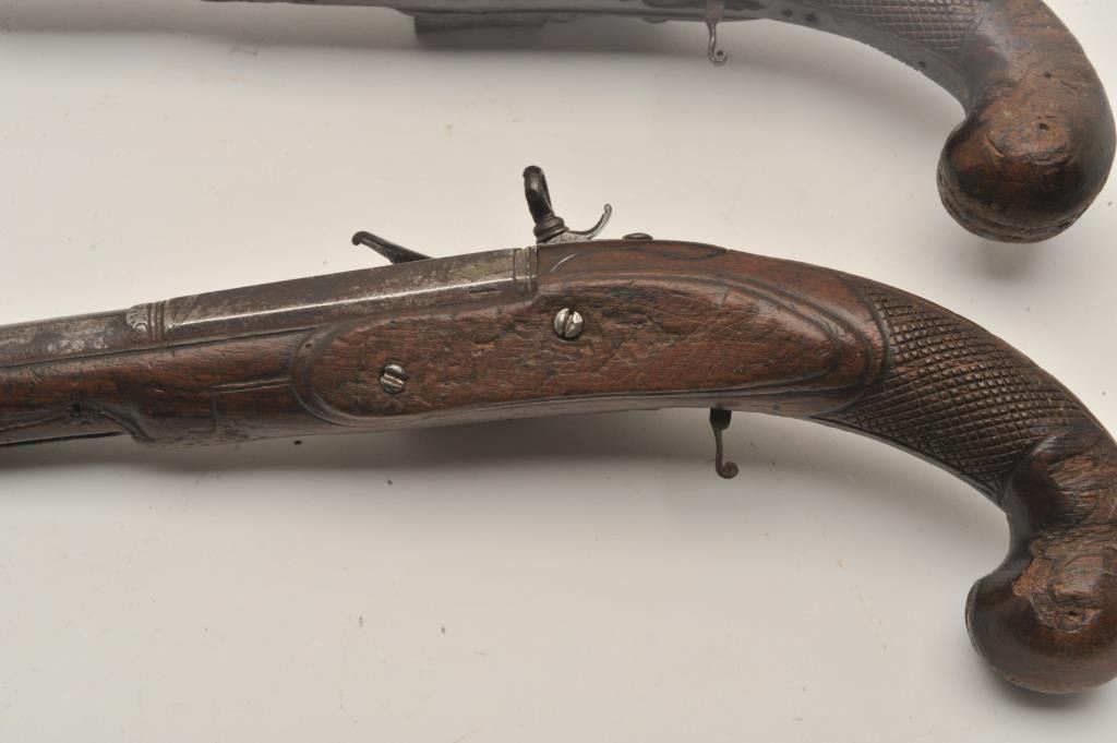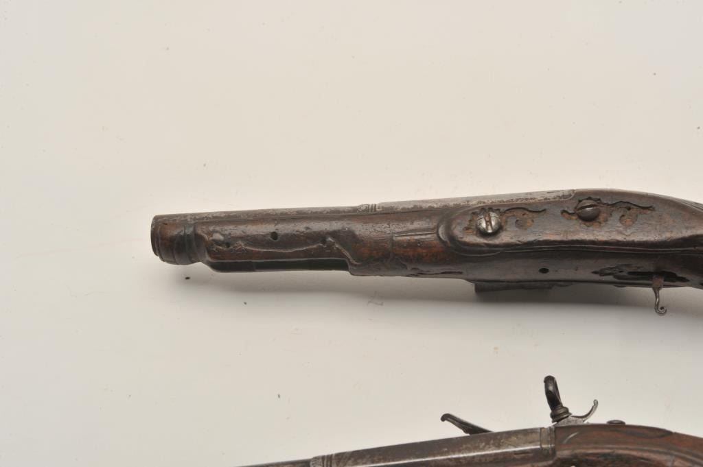 18AR-29 PAIR OF MIQUELETPair of Italian miquelet flintlock pistols circa 1760-1800 in as found condition. The trigger guards are missing, the ramrods are missing and the stocks are badly worn at the grip areas. Very restorable with nice locksand barrels. Est.: $600-$1200Pair of Italian miquelet flintlock pistols circa 1760-1800 in as found condition. The trigger guards are missing, the ramrods are missing and the stocks are badly worn at the grip areas. Very restorable with nice locksand barrels. Est.: $600-$1200