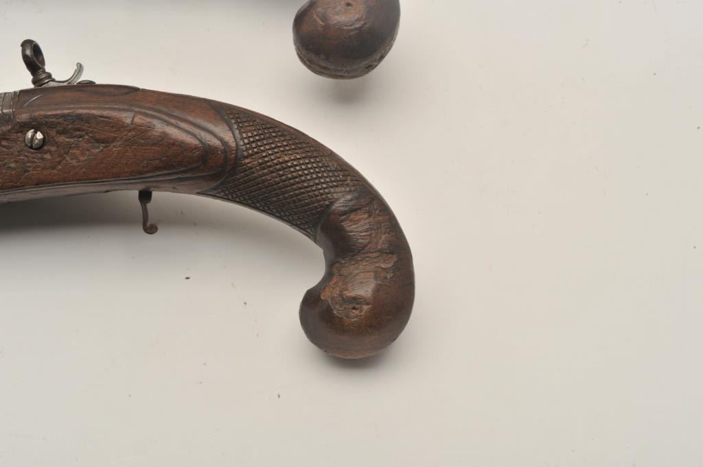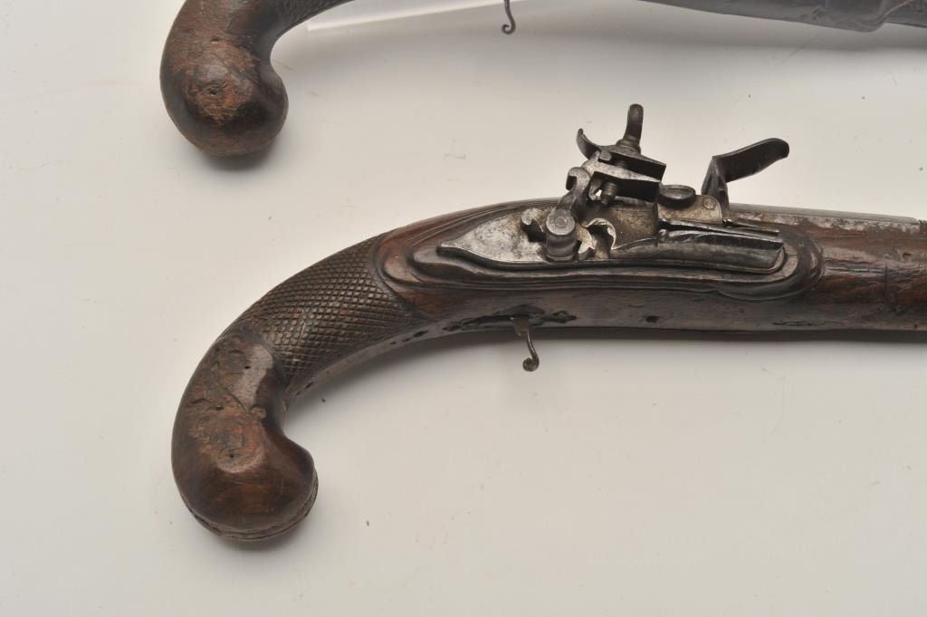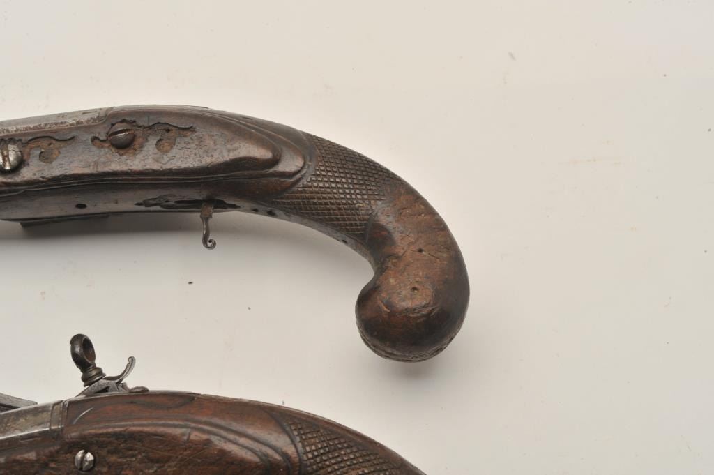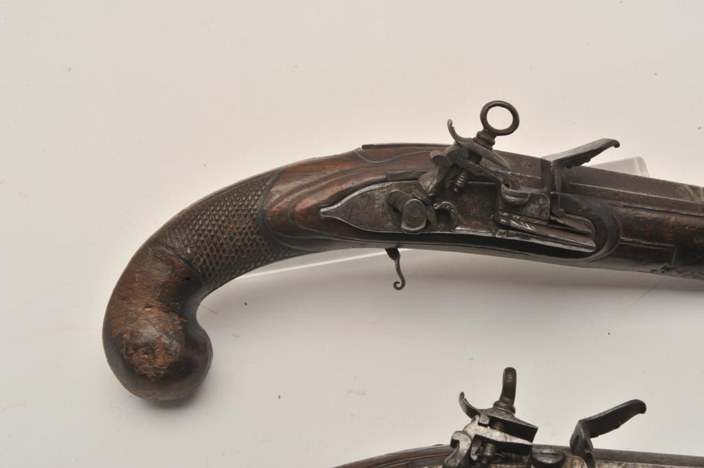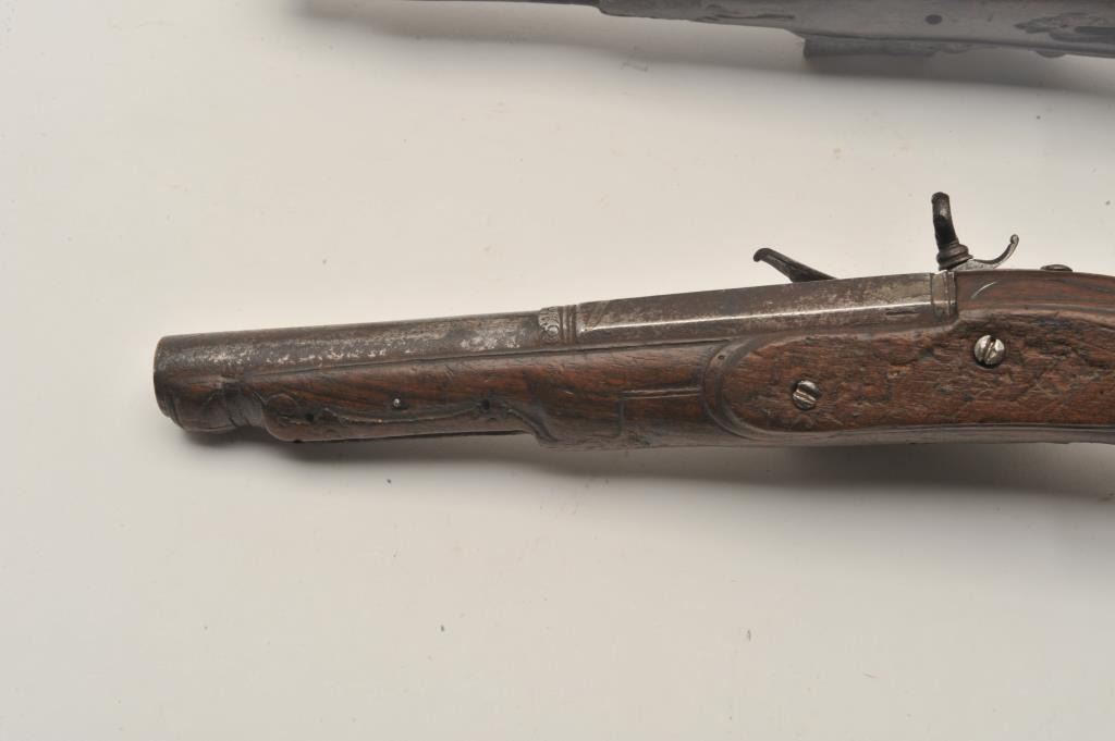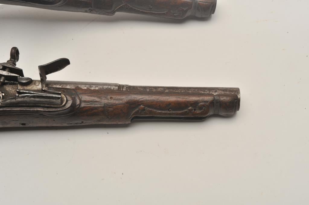 18AR-29 PAIR OF MIQUELETPair of Italian miquelet flintlock pistols circa 1760-1800 in as found condition. The trigger guards are missing, the ramrods are missing and the stocks are badly worn at the grip areas. Very restorable with nice locksand barrels. Est.: $600-$1200Pair of Italian miquelet flintlock pistols circa 1760-1800 in as found condition. The trigger guards are missing, the ramrods are missing and the stocks are badly worn at the grip areas. Very restorable with nice locksand barrels. Est.: $600-$1200