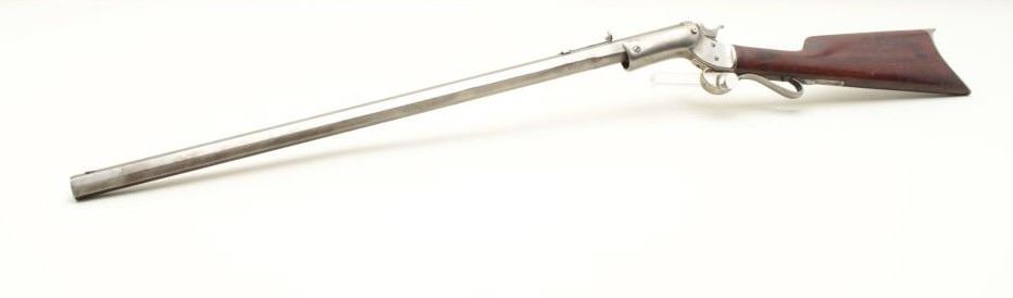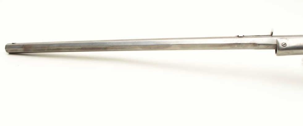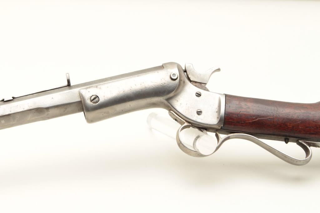17KH-266 STEVENS TIP UPStevens Tip Up Target rifle in .22 rim fire caliber with a 28” slightly heavy octagon barrel, S/N 21120. Measures approximately 7/8” across the center of the barrel. Cleaned to gray metal with some slight pitting anderosion. Release button for action replaced. Rear sight has been replaced with buckhorn but is missing the elevator and front sight blade is also missing. The stock is fair to good with scratches and small losses. Goodaddress on the barrel. The bore is fair to good with some wear. (C&R) Est.: $200-400Stevens Tip Up Target rifle in .22 rim fire caliber with a 28” slightly heavy octagon barrel, S/N 21120. Measures approximately 7/8” across the center of the barrel. Cleaned to gray metal with some slight pitting anderosion. Release button for action replaced. Rear sight has been replaced with buckhorn but is missing the elevator and front sight blade is also missing. The stock is fair to good with scratches and small losses. Goodaddress on the barrel. The bore is fair to good with some wear. (C&R) Est.: $200-400