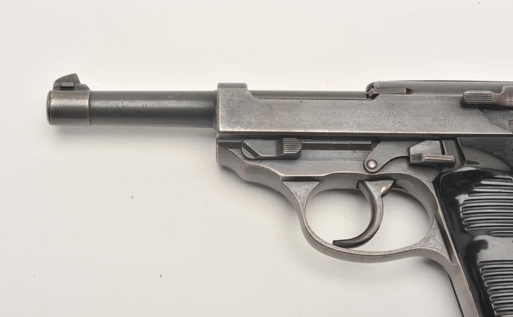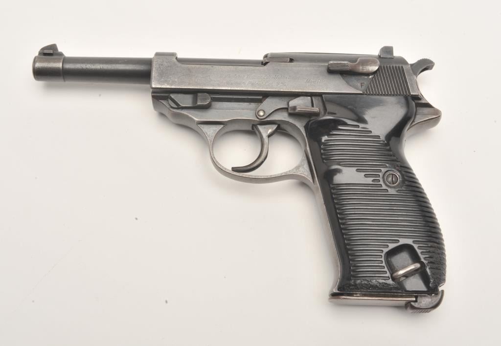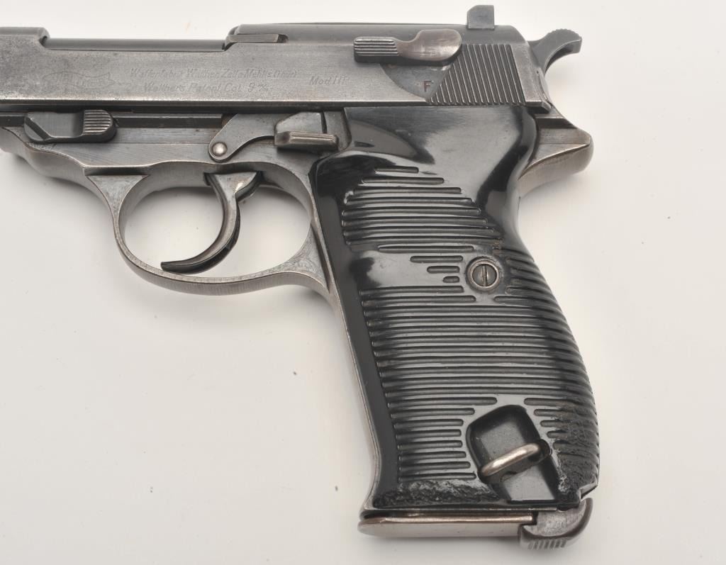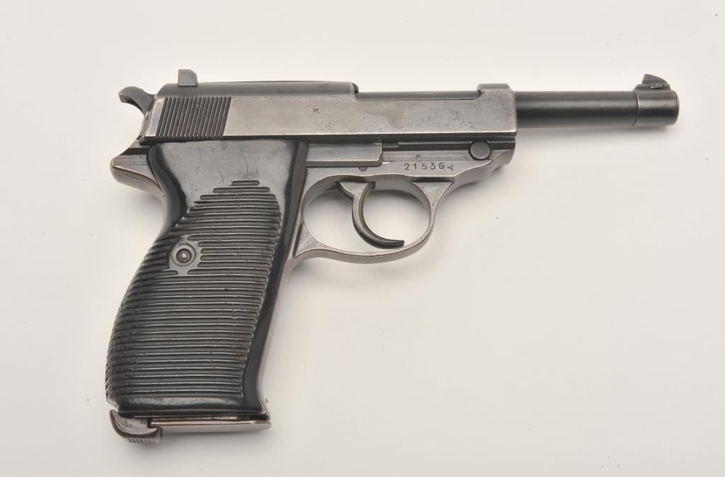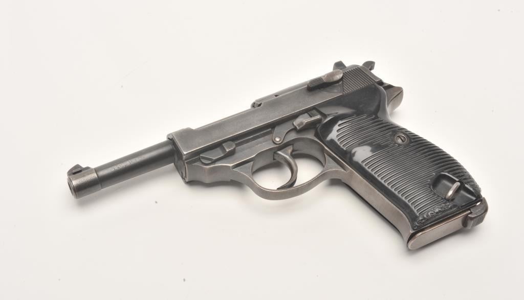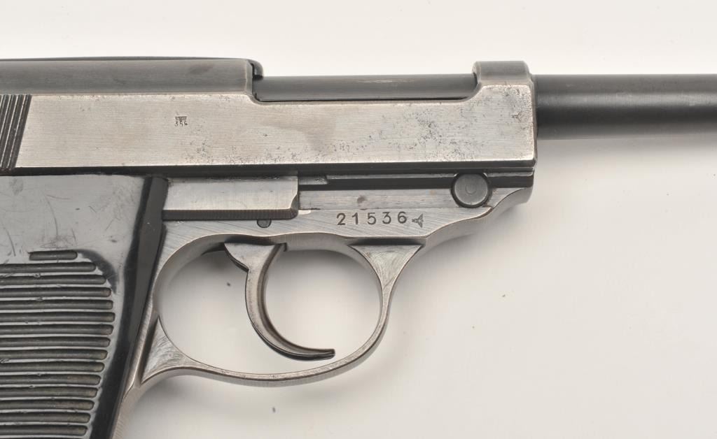 17FL-90 WALTHER HP NAZI PROOF #21536Walther Model HP semi-automatic pistol, nazi proofed, 9mm caliber, 4.75” barrel, military blue finish, black grips, S/N 21536, in overall very good condition displaying the majority of its muted military finish withhigh point wear, near fine bore, crisp action and good markings. The grips show scattered wear and some marring to the butt area of the left grip. (C&R/PPT). Est.: $600-1200Walther Model HP semi-automatic pistol, nazi proofed, 9mm caliber, 4.75” barrel, military blue finish, black grips, S/N 21536, in overall very good condition displaying the majority of its muted military finish withhigh point wear, near fine bore, crisp action and good markings. The grips show scattered wear and some marring to the butt area of the left grip. (C&R/PPT). Est.: $600-1200