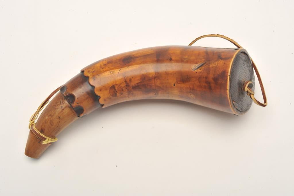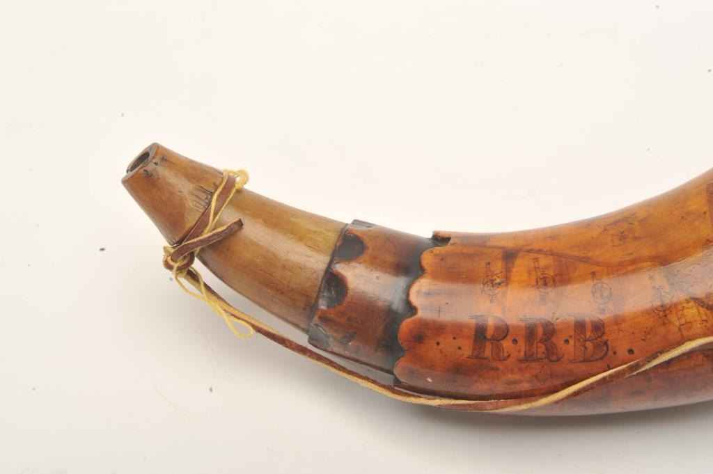 17FL-220 18TH CENTURY AMERICAN CARVED POWDER HORNAmerican 18th Century carved powder horn, approximately 10” overall with wood base plug showing a ship, a man, geometric design work and the initials “RRB”; nicely accomplished. Est.: $500-1000American 18th Century carved powder horn, approximately 10” overall with wood base plug showing a ship, a man, geometric design work and the initials “RRB”; nicely accomplished. Est.: $500-1000