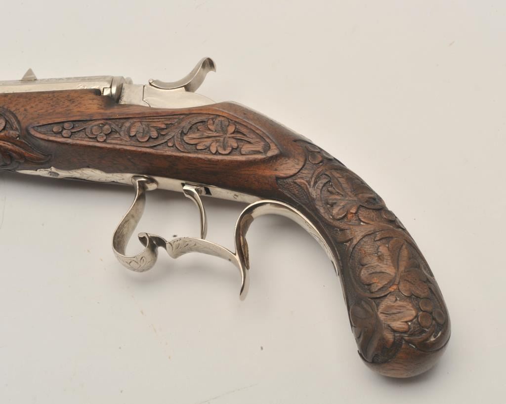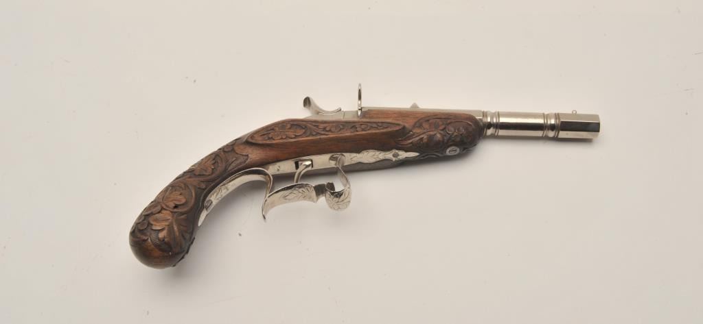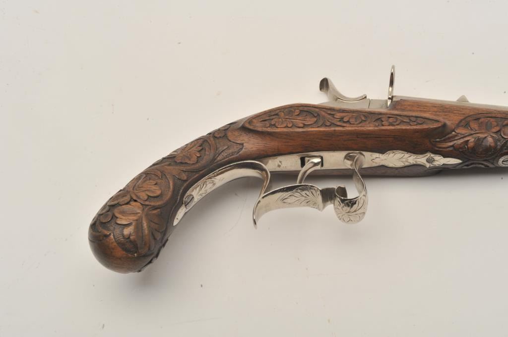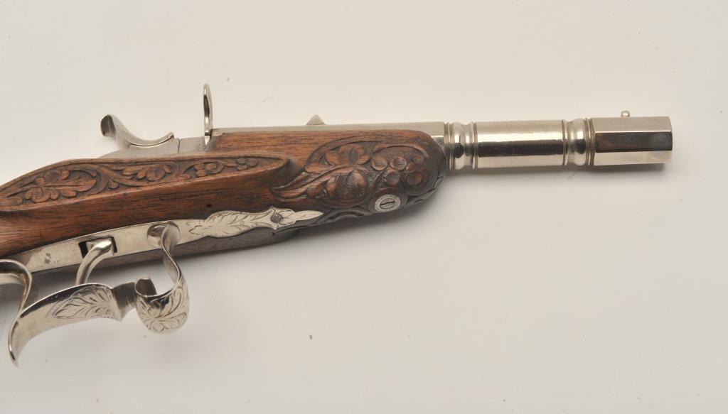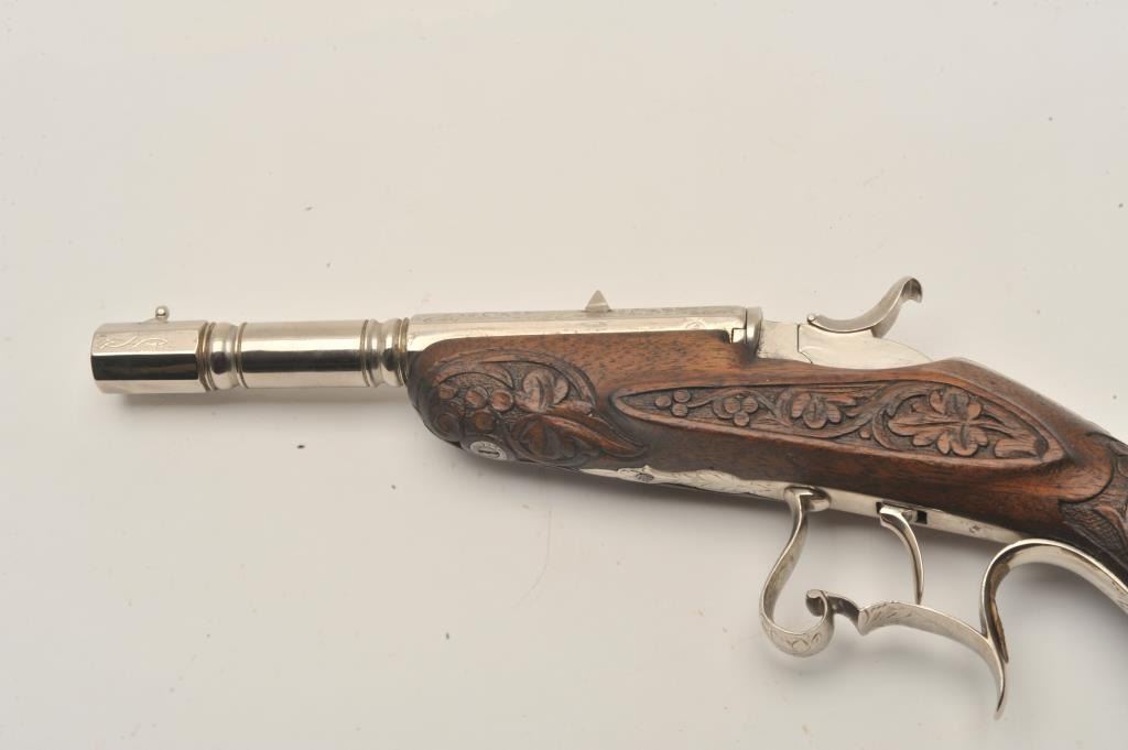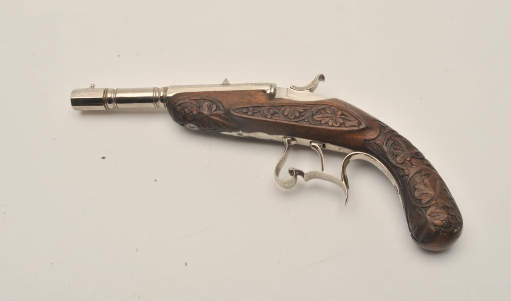 18AR-43 FLOBERTEngraved Flobert single shot pistol, .22 caliber, approximately 10.5” overall with a 5.5” barrel, re-nickel finish, fancy carved wood stock, in overall good to very good condition with strong action and beautifulfloral carvings to stock. (Antique). Est.: $700-$1,400.Engraved Flobert single shot pistol, .22 caliber, approximately 10.5” overall with a 5.5” barrel, re-nickel finish, fancy carved wood stock, in overall good to very good condition with strong action and beautifulfloral carvings to stock. (Antique). Est.: $700-$1,400.