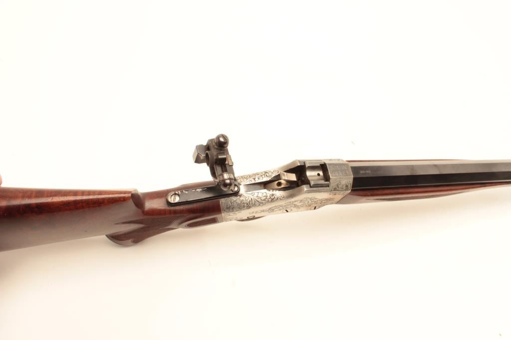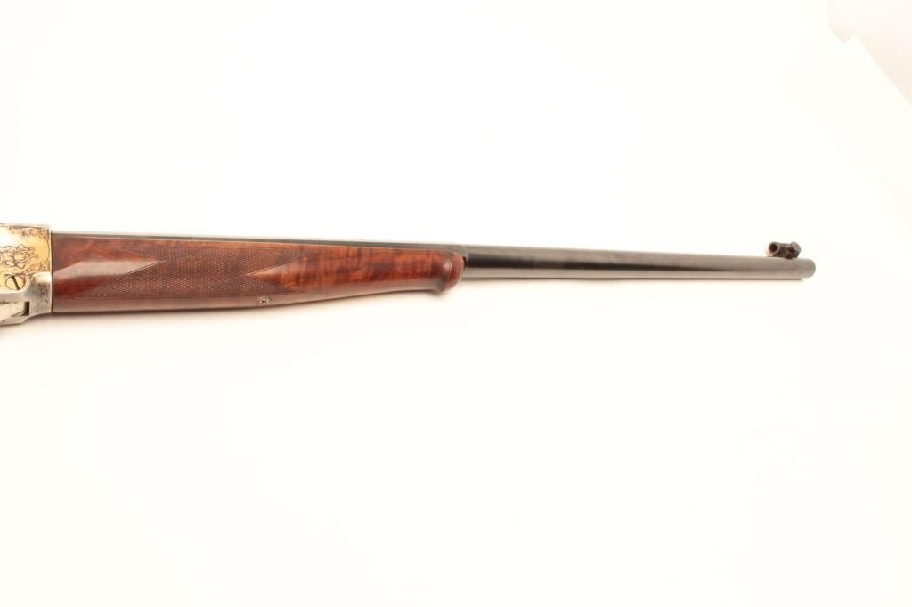 17GS-56 FALLING BLOCK RIFLEFalling Block Works of Rochester MI., falling block single shot rifle, .45-70 caliber, Serial #Z004. The rifle is in very good overall condition with a 32” half octagon barrel with a Lyman #77 front sightadded. The barrel retains nearly all of its blued finish with sharp edges on the octagon portion. The receiver is in the white with fine scroll and vine engraving by Denise Therion. The top of the action hashad, “GOOD NEWS” etched into the front ring. A Lyman aperture sight has been added to the rear of the receiver. The finely checkered custom stock is in good overall condition with a Schnabel fore end andcheckered steel butt plate. The bore is very good, the action crisp and markings are sharp on this custom falling block from the collection of Gil Newton. Est.: $900-1800(Modern).Falling Block Works of Rochester MI., falling block single shot rifle, .45-70 caliber, Serial #Z004. The rifle is in very good overall condition with a 32” half octagon barrel with a Lyman #77 front sightadded. The barrel retains nearly all of its blued finish with sharp edges on the octagon portion. The receiver is in the white with fine scroll and vine engraving by Denise Therion. The top of the action hashad, “GOOD NEWS” etched into the front ring. A Lyman aperture sight has been added to the rear of the receiver. The finely checkered custom stock is in good overall condition with a Schnabel fore end andcheckered steel butt plate. The bore is very good, the action crisp and markings are sharp on this custom falling block from the collection of Gil Newton. Est.: $900-1800(Modern).