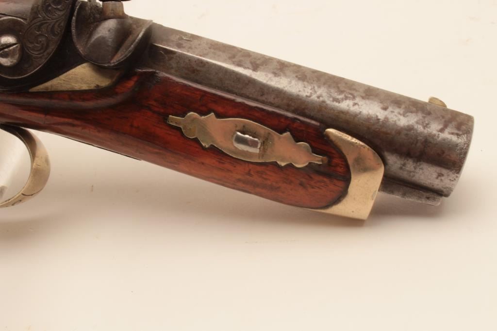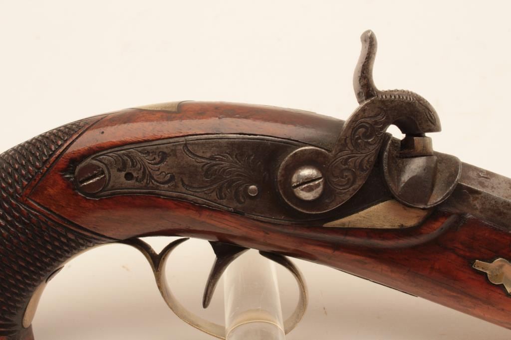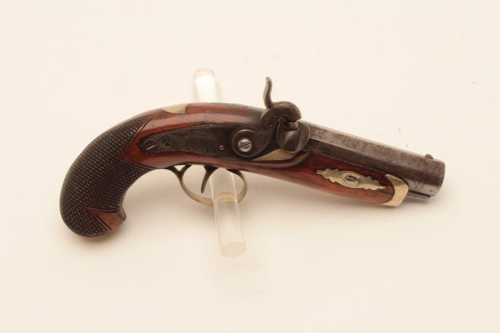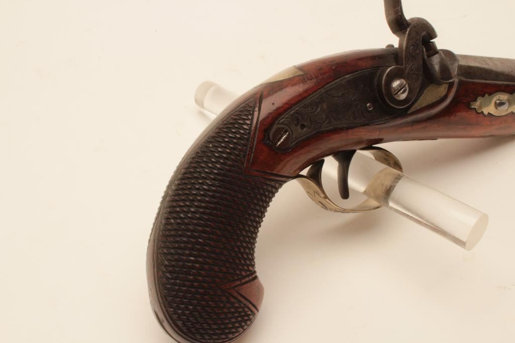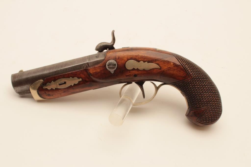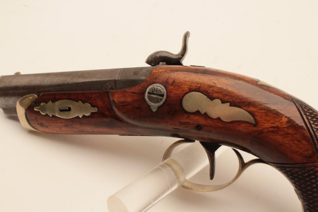 18CF-5 PERC DERRINGERLarge size Philadelphia style percussion derringer with German silver mounts and approximately .41 caliber with 7 groove rifling. Unmarked with light scroll engraving. Measures 9” overall with a nearly4” heavier than standard barrel. Good to very good overall condition missing ram rod. Good action and crisp checkering. Bell shape inlay behind the tang and point below lock screw. A fairly close copy of H. Deringer.Possibly Slotter. (Antique) Est.: $800-$1600Large size Philadelphia style percussion derringer with German silver mounts and approximately .41 caliber with 7 groove rifling. Unmarked with light scroll engraving. Measures 9” overall with a nearly4” heavier than standard barrel. Good to very good overall condition missing ram rod. Good action and crisp checkering. Bell shape inlay behind the tang and point below lock screw. A fairly close copy of H. Deringer.Possibly Slotter. (Antique) Est.: $800-$1600