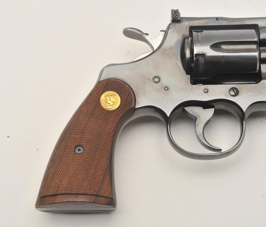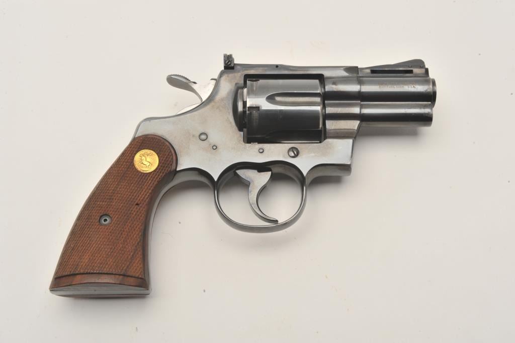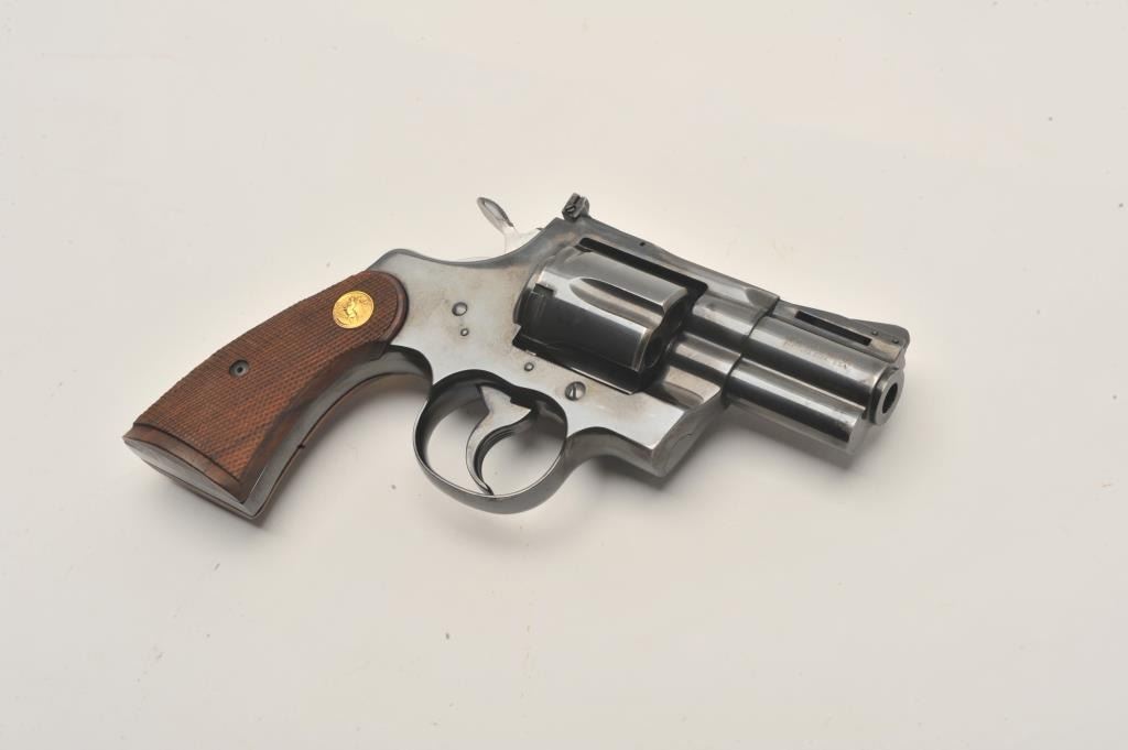 17MB-1 COLT PYTHON #98810Colt Python DA revolver, .357 Magnum caliber, 2.5” ventilated rib barrel, blued finish, checkered wood medallion grips, S/N 93810, in overall fine condition showing majority of original finish with some holster wear tofront of barrel, fine bore, crisp action, sharp markings and fine grips. (C&R/PPT). Est.: $3,000-$5,000.Colt Python DA revolver, .357 Magnum caliber, 2.5” ventilated rib barrel, blued finish, checkered wood medallion grips, S/N 93810, in overall fine condition showing majority of original finish with some holster wear tofront of barrel, fine bore, crisp action, sharp markings and fine grips. (C&R/PPT). Est.: $3,000-$5,000.
