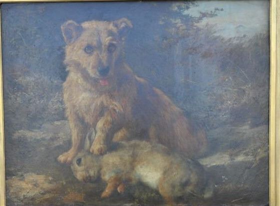 EVE-103 OIL ON BOARD19th century oil on board showing terrier with rabbit. No signature visible but shows English restorers label on reverse. Measures approximately 20” x 26”. Minor damage to the edge of the panel where it meets the frame.Period frame with considerable damage to the jesso. The main body of the painting is good needing cleaning and minor conservation. Great quality and most likely a British artist. The estate of Eric Vaule. Est.:$1000-$200019th century oil on board showing terrier with rabbit. No signature visible but shows English restorers label on reverse. Measures approximately 20” x 26”. Minor damage to the edge of the panel where it meets the frame.Period frame with considerable damage to the jesso. The main body of the painting is good needing cleaning and minor conservation. Great quality and most likely a British artist. The estate of Eric Vaule. Est.:$1000-$2000