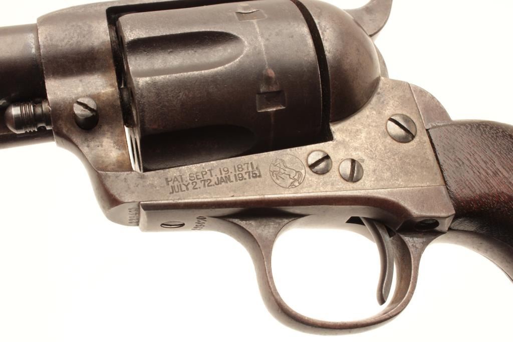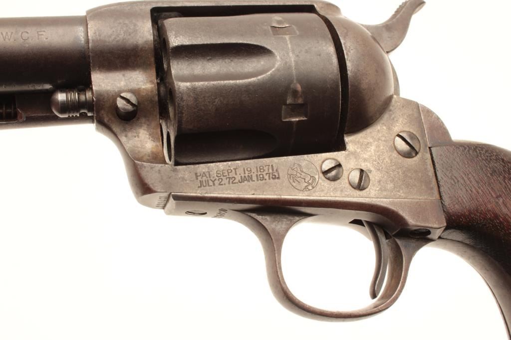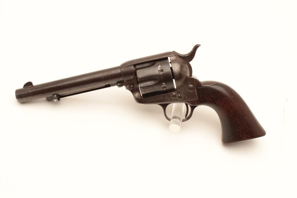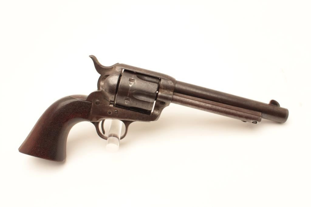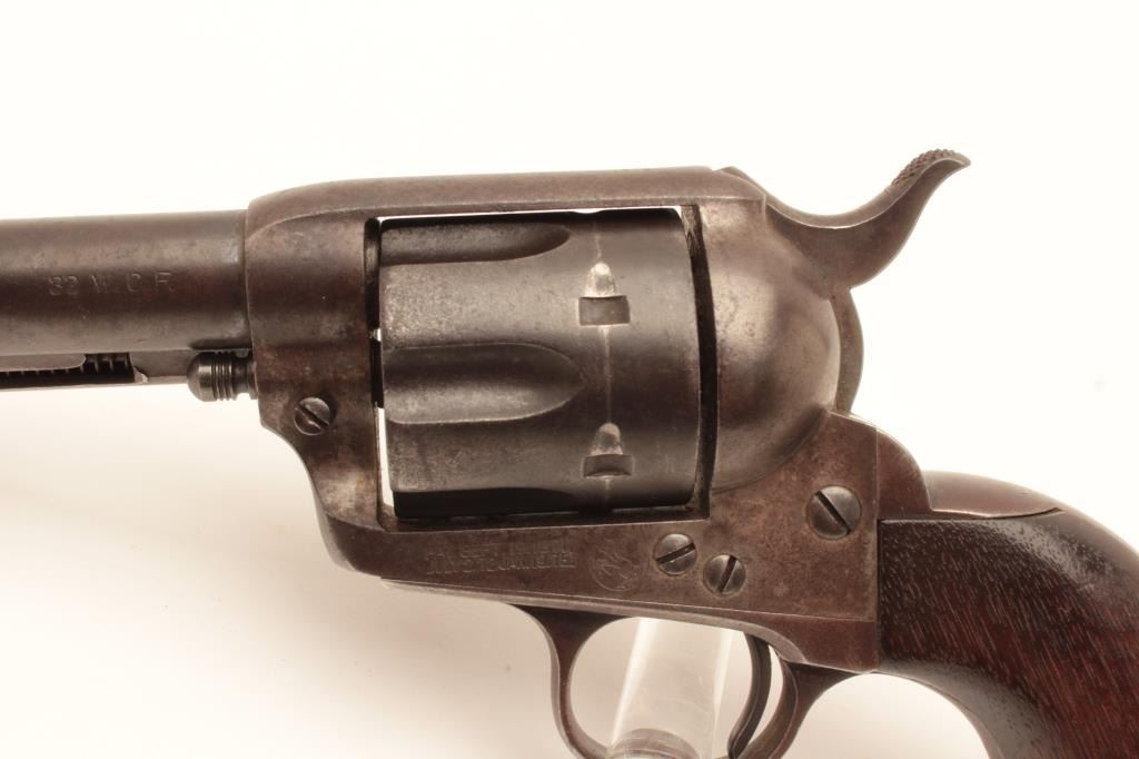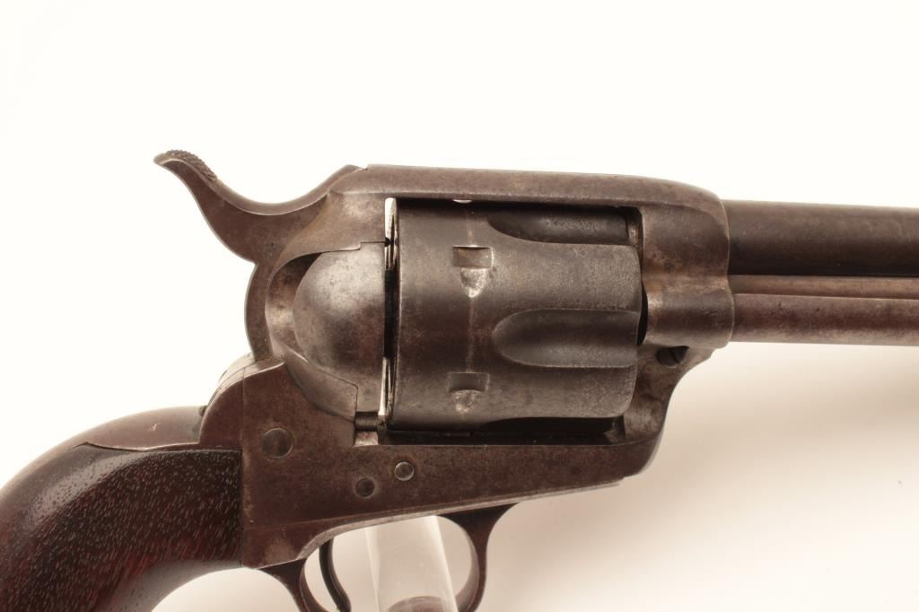 18CB-3 COLT SAA #229470Colt Single Action Army revolver in .32-20 caliber with a 6” barrel, 1 piece wood grips, S/N 229470. The 6” barrel and grips are not recorded in the factory record but we and several Colt experts feel this to be acorrect and rare 6” barrel. The crown and sight placement are spot on and sight shows original blue. The revolver shows 30%-50% blue within a dark and brown patina. Minor erosion and light pitting. Very good markings and very good grips. The action is good and the bore is fair. The barrel is numbered 470 on the bottom under the ejector rod with star stamp possibly indicating special order or return to the factory. (C&R/No PPT) Est.:$3000-$6000Colt Single Action Army revolver in .32-20 caliber with a 6” barrel, 1 piece wood grips, S/N 229470. The 6” barrel and grips are not recorded in the factory record but we and several Colt experts feel this to be acorrect and rare 6” barrel. The crown and sight placement are spot on and sight shows original blue. The revolver shows 30%-50% blue within a dark and brown patina. Minor erosion and light pitting. Very good markings and very good grips. The action is good and the bore is fair. The barrel is numbered 470 on the bottom under the ejector rod with star stamp possibly indicating special order or return to the factory. (C&R/No PPT) Est.:$3000-$6000