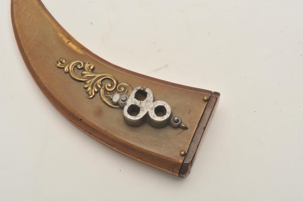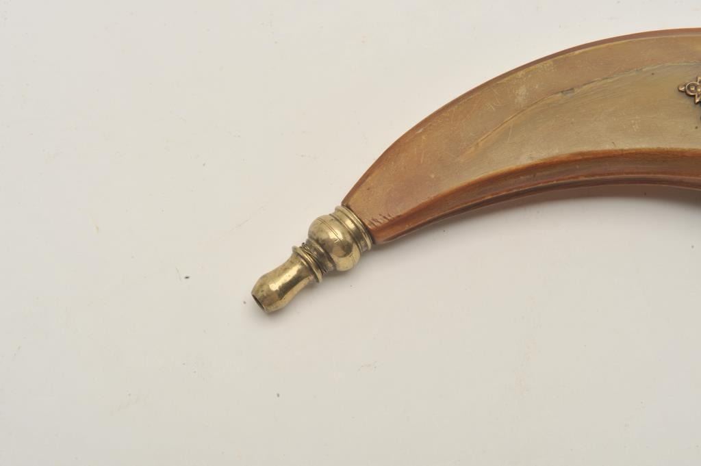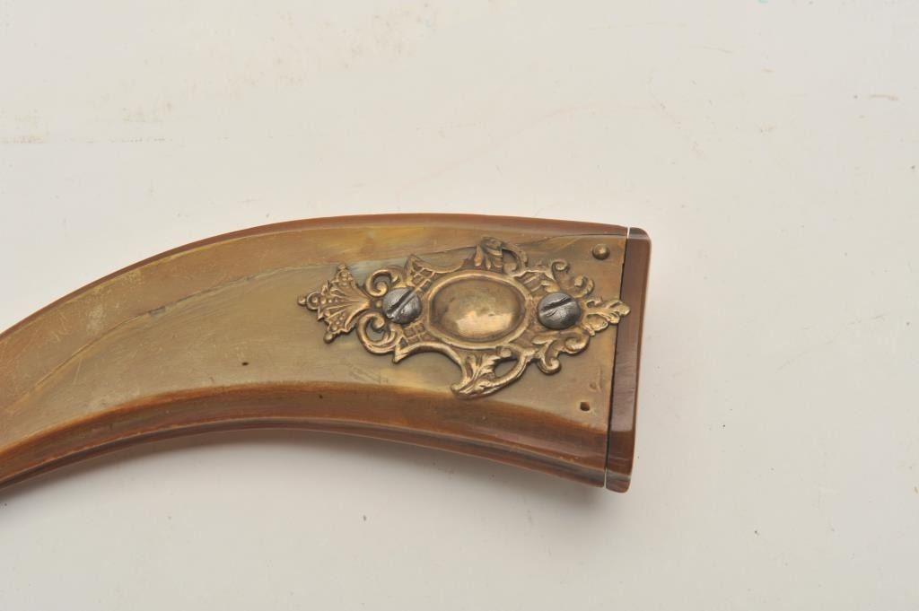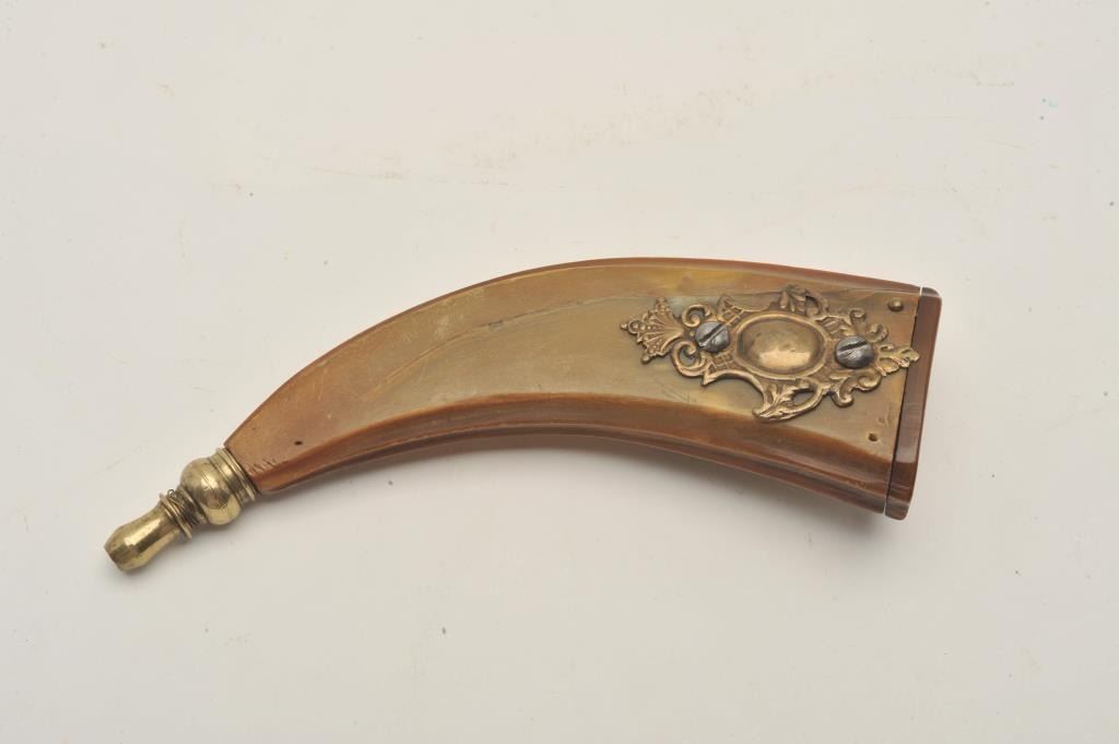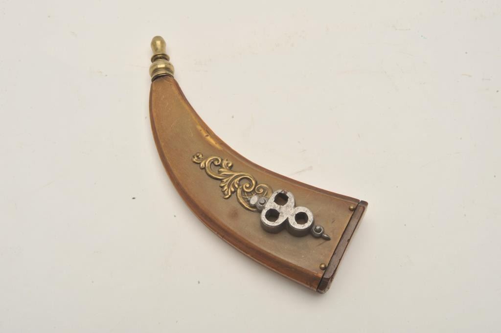 Lot 811 18CF-16 HORN FLASK17th century Wheelock flask with 3 socket spanner wrench for cocking wheelock lon