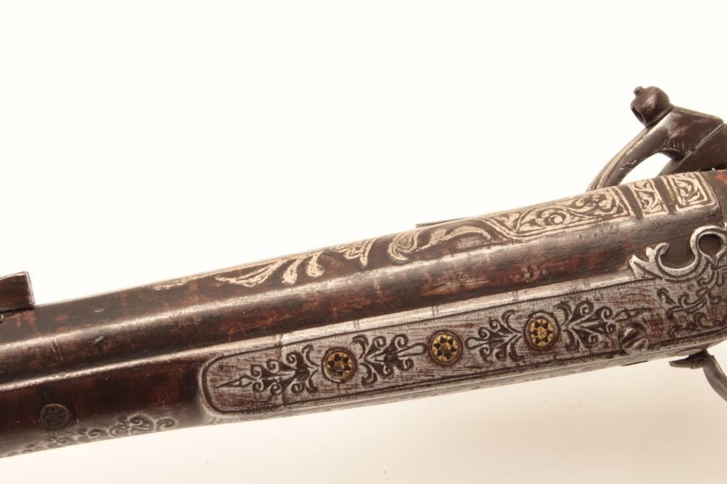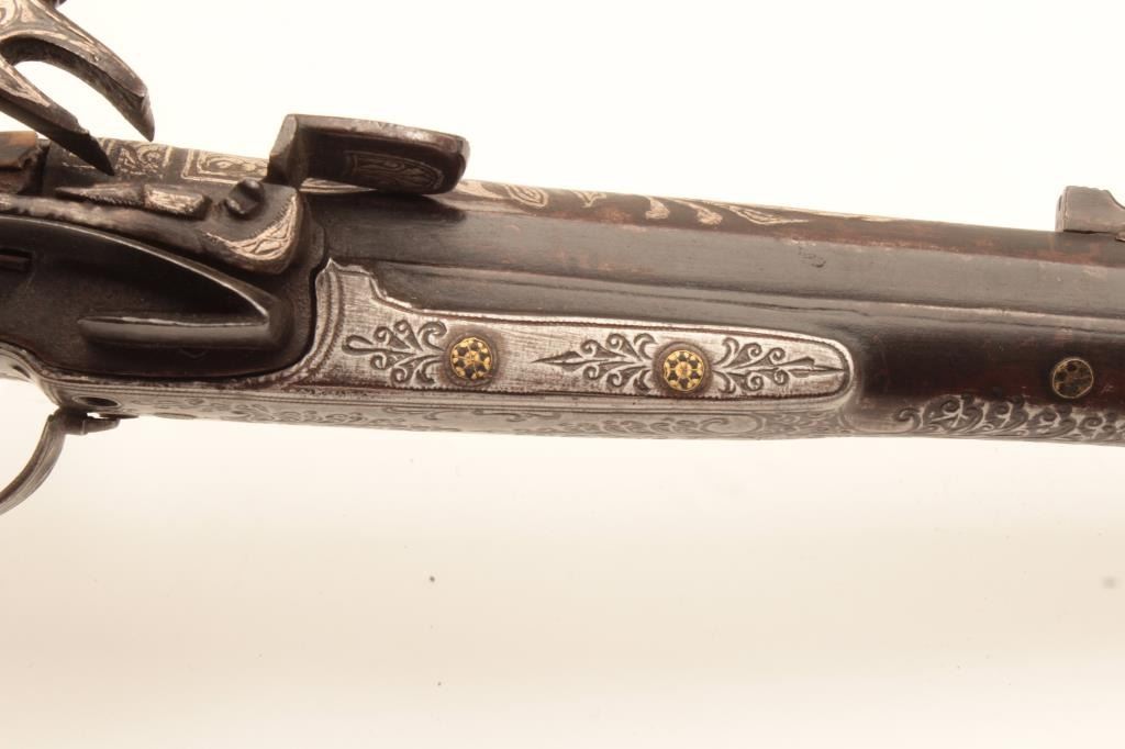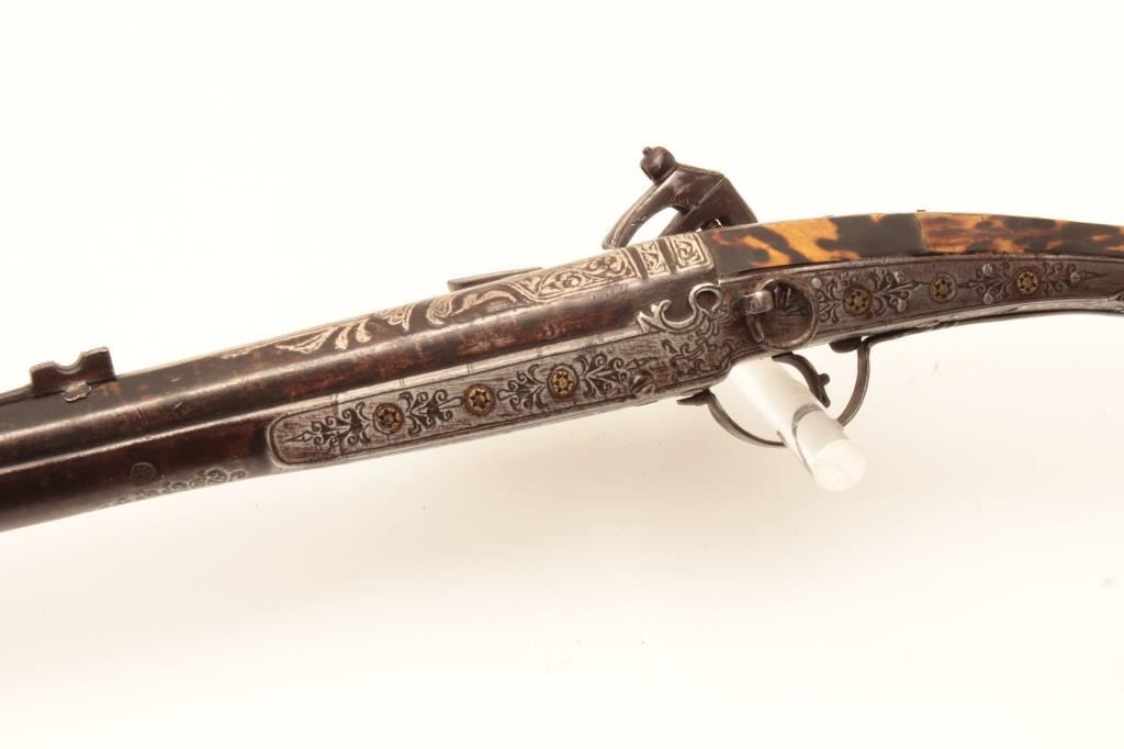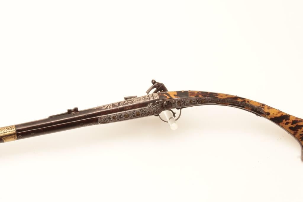 EVE-113 MIQUELET FLINTLOCK MUSKETAlbanian or Baltic miquelet flintlock musket with unique tortoise shell mounted stock and ornate silver inlay. Early to Mid-19th century and remaining in very good plus condition with minor damage to the inlay andnormal aging. Measures 59” overall with a 46” barrel of .75 caliber smoothbore. The estate of Eric Vaule. (Antique) Est.: $3000-$6000Albanian or Baltic miquelet flintlock musket with unique tortoise shell mounted stock and ornate silver inlay. Early to Mid-19th century and remaining in very good plus condition with minor damage to the inlay andnormal aging. Measures 59” overall with a 46” barrel of .75 caliber smoothbore. The estate of Eric Vaule. (Antique) Est.: $3000-$6000