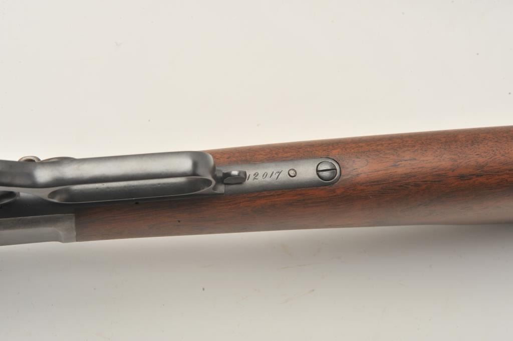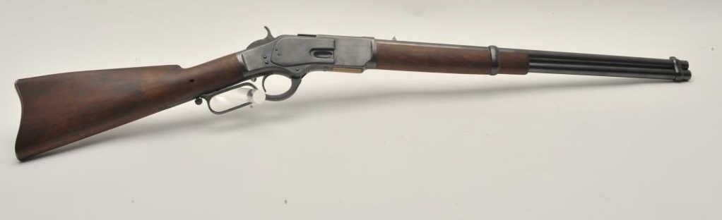 18AP-29 73 WINCHESTERWinchester First Model 1873 SRC, .44 W.C. F. caliber, 20” barrel, wood stocks, S/N 12017, in overall good condition as restored with re-blued finish and re-stocked wood; good action, visible markings, some light rustareas on barrel from long storage, good replaced wood stocks. (Antique). Est.: $1,400-$2,800.Winchester First Model 1873 SRC, .44 W.C. F. caliber, 20” barrel, wood stocks, S/N 12017, in overall good condition as restored with re-blued finish and re-stocked wood; good action, visible markings, some light rustareas on barrel from long storage, good replaced wood stocks. (Antique). Est.: $1,400-$2,800.