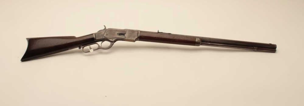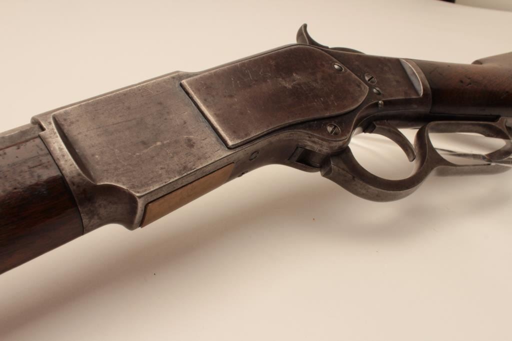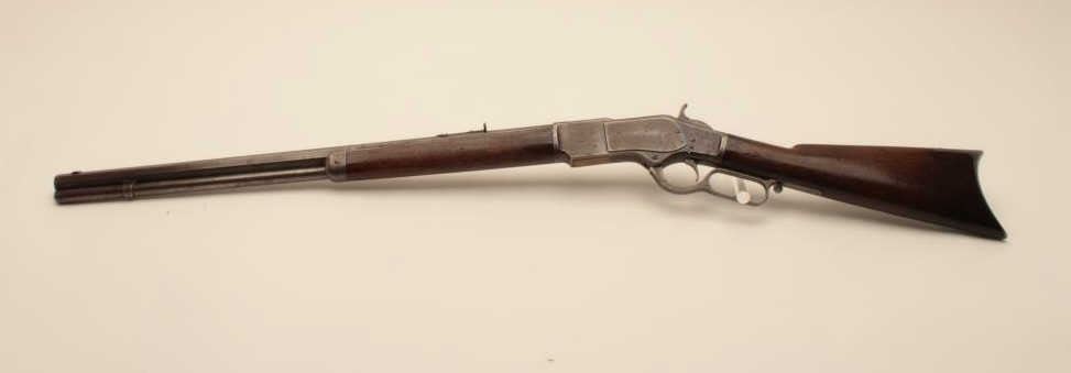 18AL-44 WINCHESTER 73 #27689Scarce and desirable early Winchester Model 1873 “open top” lever action rifle, .44 caliber, 24” octagon barrel, blued finish, set trigger (working at time of description), wood stocks, S/N 27689, in overall very good condition with traces of original blue in protected areas, balance gone to a pleasing brown patina; good to very good bore, crisp action, sharp markings and good wood stocks showing scattered minor handling and storagemars and scratches. Accompanied by a factory letter confirming barrel shape and set trigger being received in the warehouse on Jan. 21, 1878 and shipped on July 6, 1878 to order number 12316. (Antique). Est.: $3,000-$6,000.Scarce and desirable early Winchester Model 1873 “open top” lever action rifle, .44 caliber, 24” octagon barrel, blued finish, set trigger (working at time of description), wood stocks, S/N 27689, in overall very good condition with traces of original blue in protected areas, balance gone to a pleasing brown patina; good to very good bore, crisp action, sharp markings and good wood stocks showing scattered minor handling and storagemars and scratches. Accompanied by a factory letter confirming barrel shape and set trigger being received in the warehouse on Jan. 21, 1878 and shipped on July 6, 1878 to order number 12316. (Antique). Est.: $3,000-$6,000.