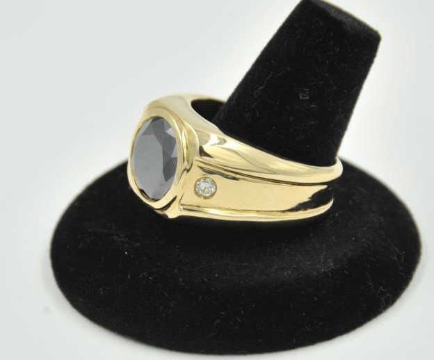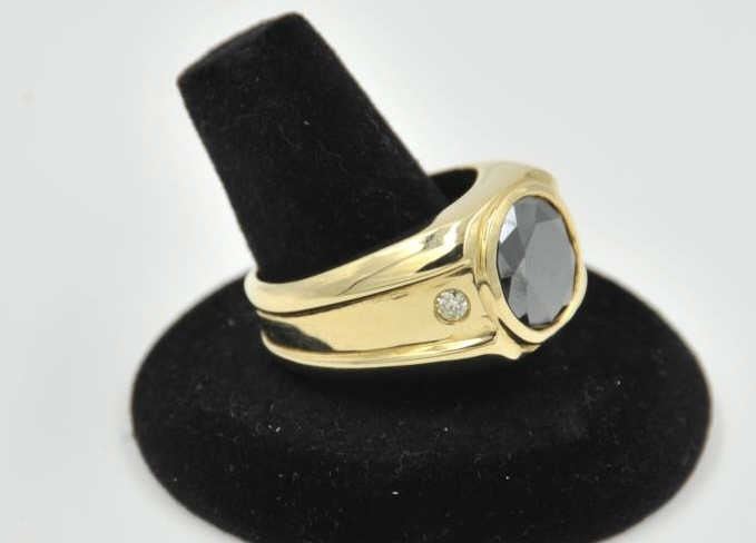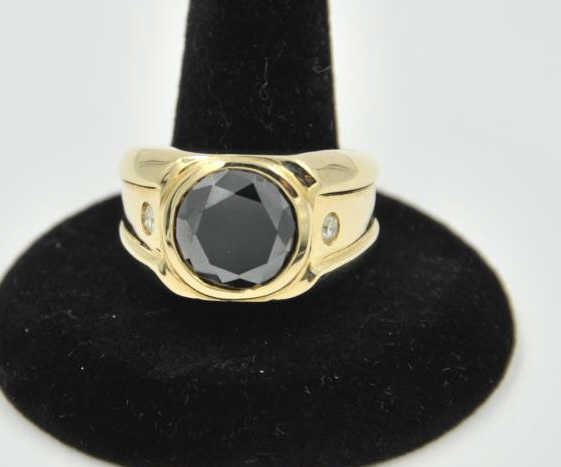 18PRS-4 BLACK DIAMOND RINGOne mans ring in 14k yellow gold set with 5.7ct black diamond and 2 accent diamonds weighing approx 0.35ct EST:$1000-2000One mans ring in 14k yellow gold set with 5.7ct black diamond and 2 accent diamonds weighing approx 0.35ct EST:$1000-2000