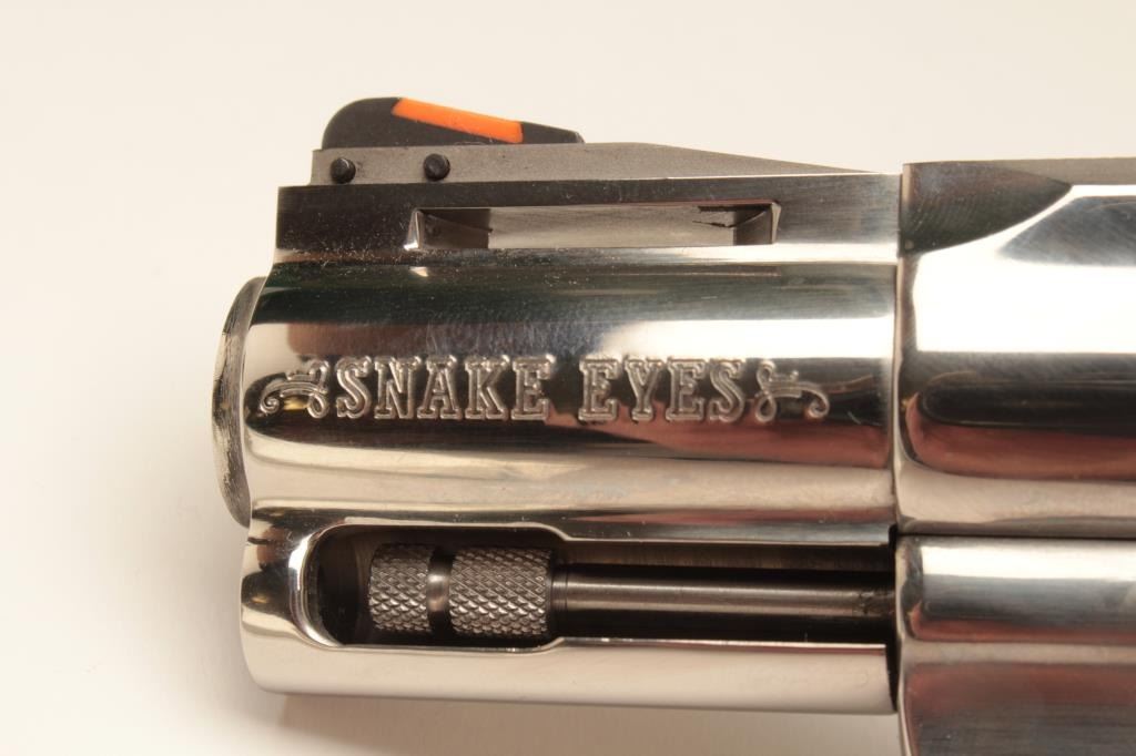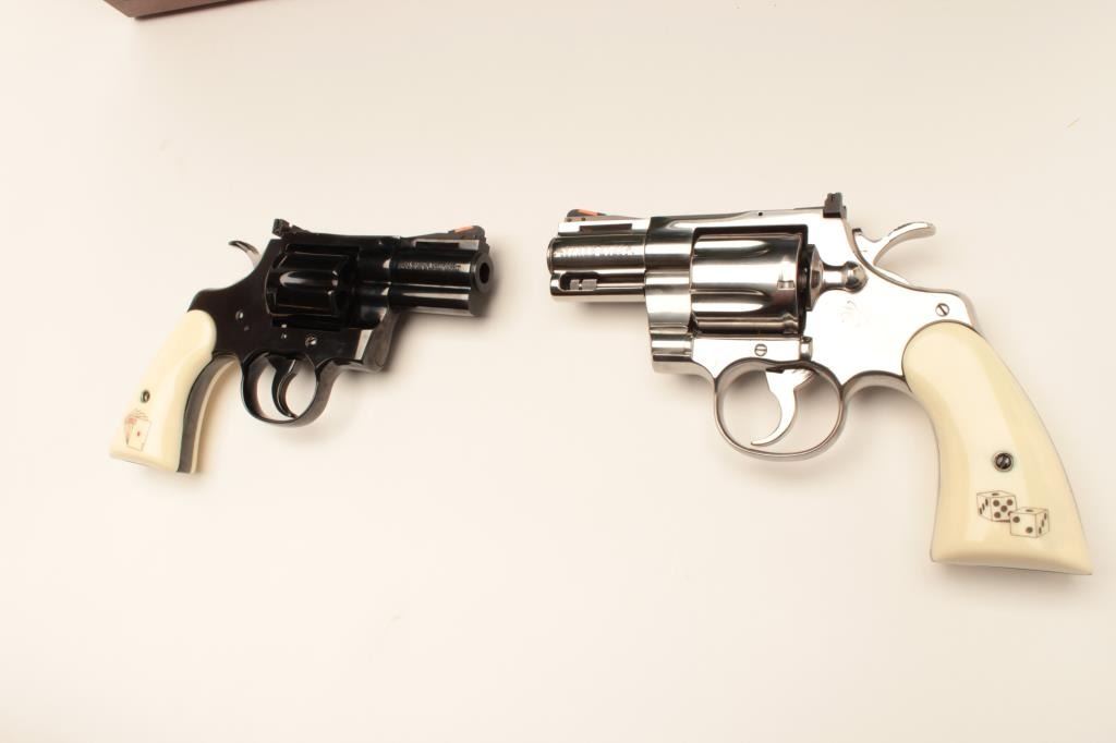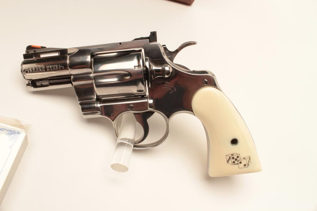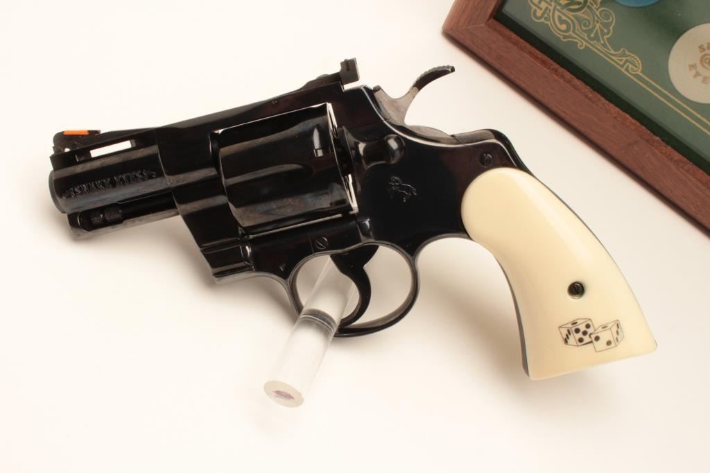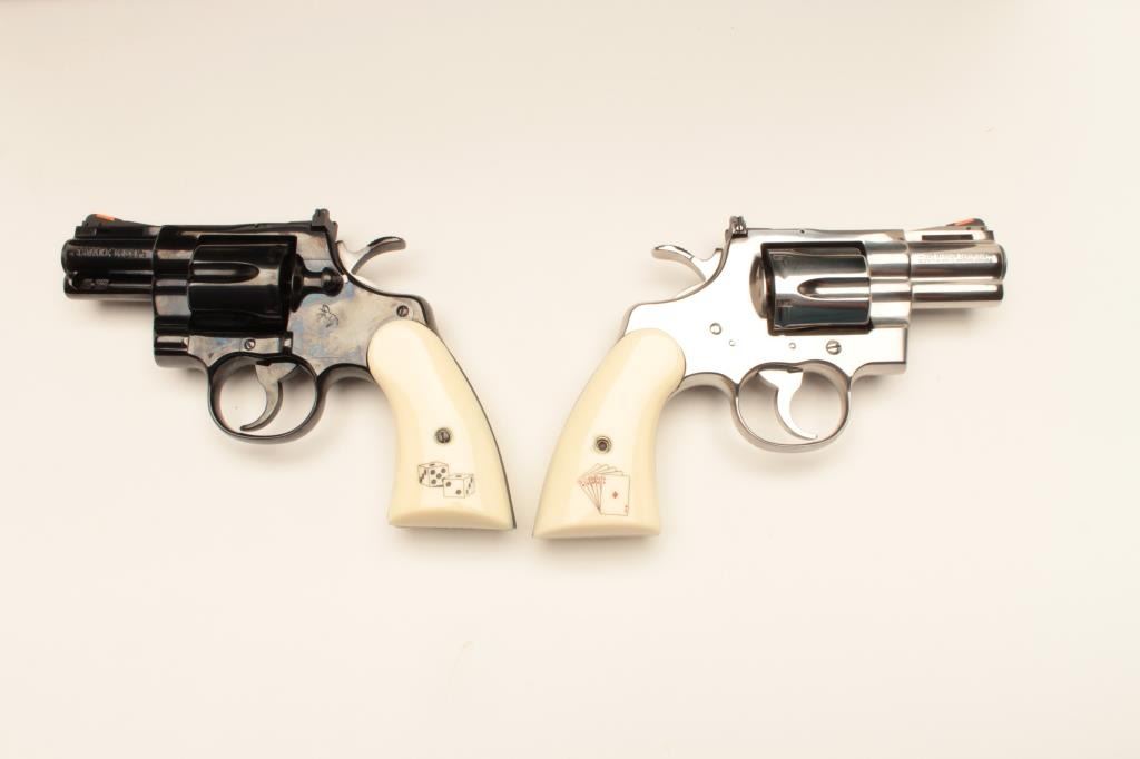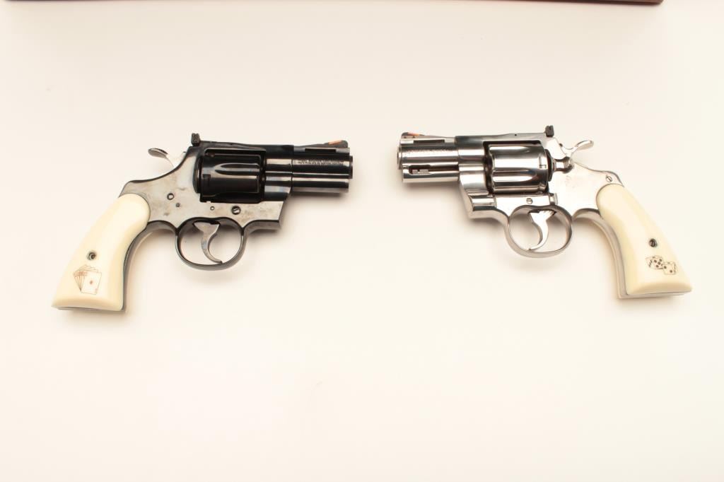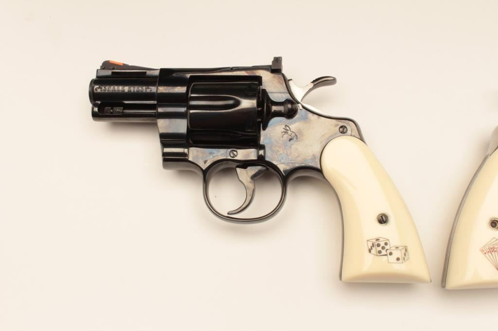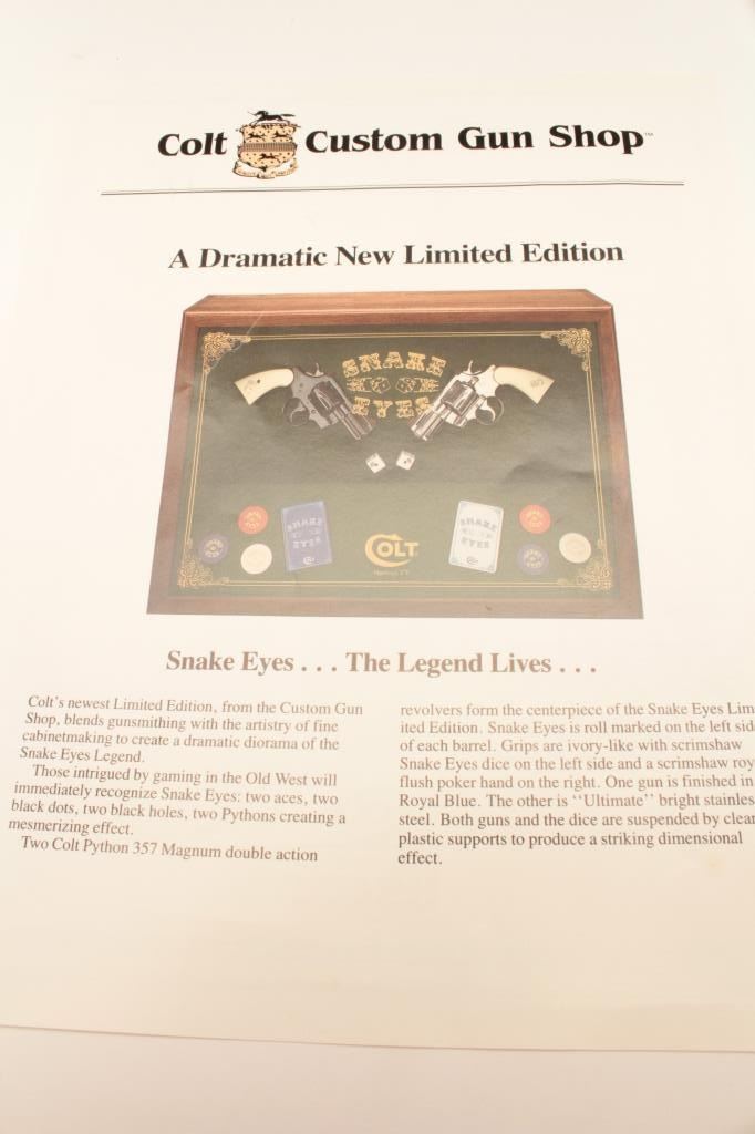 18BM-64 SNAKE EYESColt Snake Eyes limited edition Custom Shop 2 gun set of 2 1/2" Pythons. Each gun features a 2 1/2" full lug barrel, with adjustable sights,scrimshawed grips with two dice on the left grip panel and a royal flush on the right grip panel. #375 EYES is a stainless revolver in excellent condition overall, showing little evidence of use. Grips are excellent, bore is excellent, action is excellent. #EYES 375 is a bluedrevolver, in as new condition, mint bore and action, grips are excellent. Guns are accompanied by a lighted walnut display case, with playing cards and poker chips, which is also in excellent condition. This limitededition series was released in 1989, with only 500 sets being produced. This is a must have for any Snake collection, and the ultimate Python set. Also included are both factory Custom Shop boxes which are in verygood condition, along with the original factory shipping sleeves. (Modern / PPT) Est. $7000-14000Colt Snake Eyes limited edition Custom Shop 2 gun set of 2 1/2" Pythons. Each gun features a 2 1/2" full lug barrel, with adjustable sights,scrimshawed grips with two dice on the left grip panel and a royal flush on the right grip panel. #375 EYES is a stainless revolver in excellent condition overall, showing little evidence of use. Grips are excellent, bore is excellent, action is excellent. #EYES 375 is a bluedrevolver, in as new condition, mint bore and action, grips are excellent. Guns are accompanied by a lighted walnut display case, with playing cards and poker chips, which is also in excellent condition. This limitededition series was released in 1989, with only 500 sets being produced. This is a must have for any Snake collection, and the ultimate Python set. Also included are both factory Custom Shop boxes which are in verygood condition, along with the original factory shipping sleeves. (Modern / PPT) Est. $7000-14000