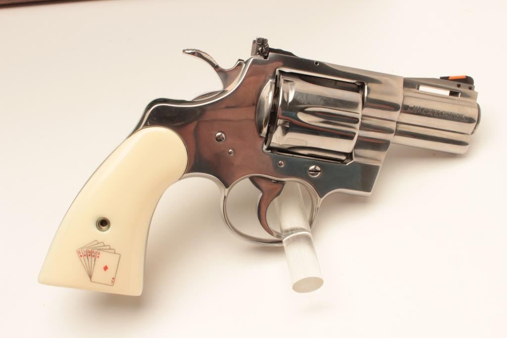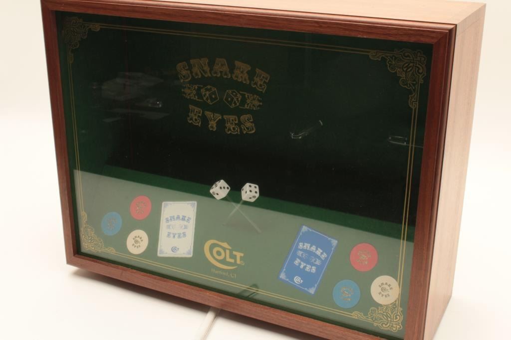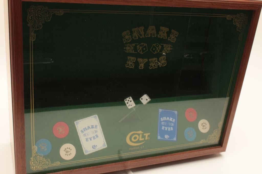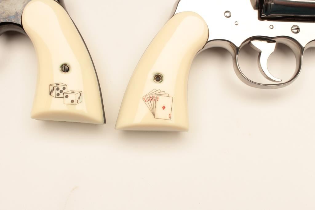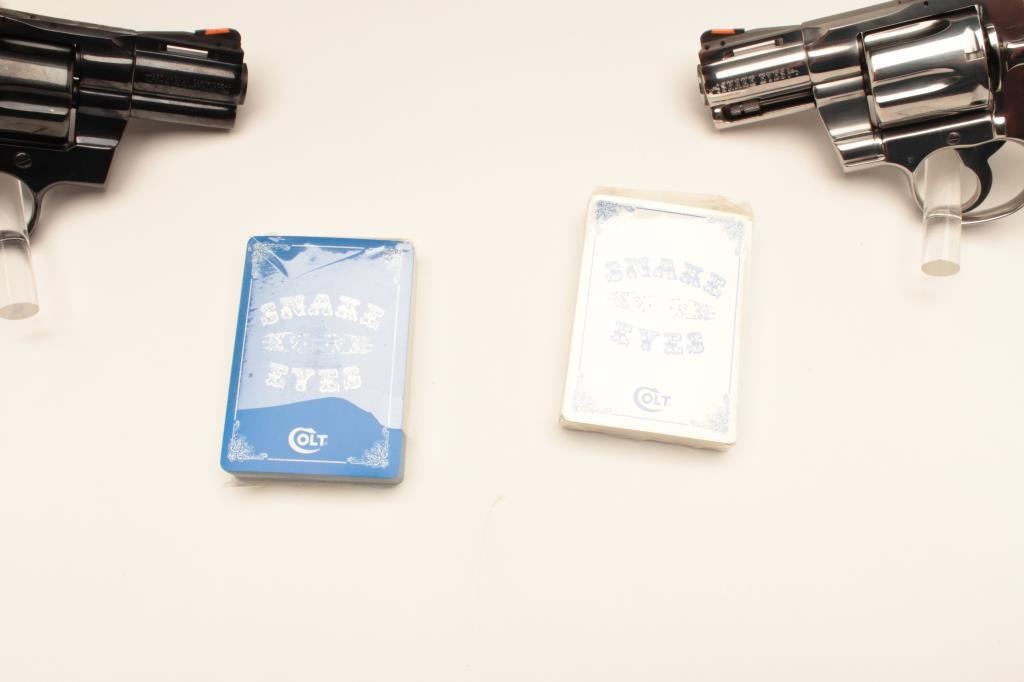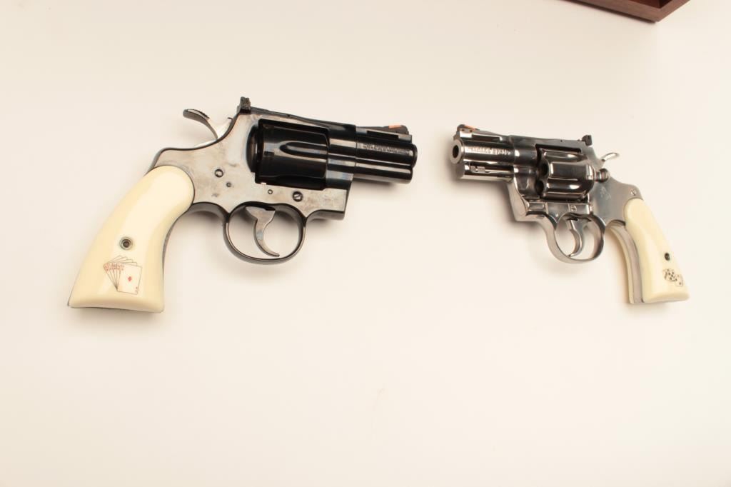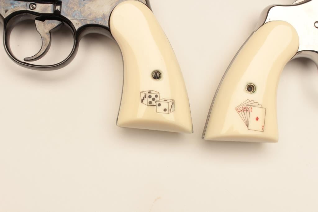 18BM-64 SNAKE EYESColt Snake Eyes limited edition Custom Shop 2 gun set of 2 1/2" Pythons. Each gun features a 2 1/2" full lug barrel, with adjustable sights,scrimshawed grips with two dice on the left grip panel and a royal flush on the right grip panel. #375 EYES is a stainless revolver in excellent condition overall, showing little evidence of use. Grips are excellent, bore is excellent, action is excellent. #EYES 375 is a bluedrevolver, in as new condition, mint bore and action, grips are excellent. Guns are accompanied by a lighted walnut display case, with playing cards and poker chips, which is also in excellent condition. This limitededition series was released in 1989, with only 500 sets being produced. This is a must have for any Snake collection, and the ultimate Python set. Also included are both factory Custom Shop boxes which are in verygood condition, along with the original factory shipping sleeves. (Modern / PPT) Est. $7000-14000Colt Snake Eyes limited edition Custom Shop 2 gun set of 2 1/2" Pythons. Each gun features a 2 1/2" full lug barrel, with adjustable sights,scrimshawed grips with two dice on the left grip panel and a royal flush on the right grip panel. #375 EYES is a stainless revolver in excellent condition overall, showing little evidence of use. Grips are excellent, bore is excellent, action is excellent. #EYES 375 is a bluedrevolver, in as new condition, mint bore and action, grips are excellent. Guns are accompanied by a lighted walnut display case, with playing cards and poker chips, which is also in excellent condition. This limitededition series was released in 1989, with only 500 sets being produced. This is a must have for any Snake collection, and the ultimate Python set. Also included are both factory Custom Shop boxes which are in verygood condition, along with the original factory shipping sleeves. (Modern / PPT) Est. $7000-14000