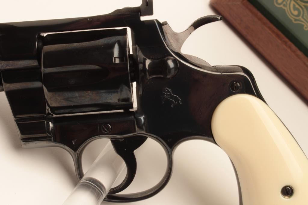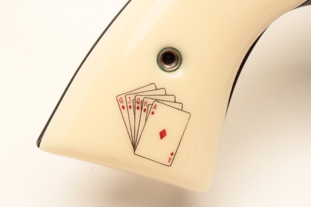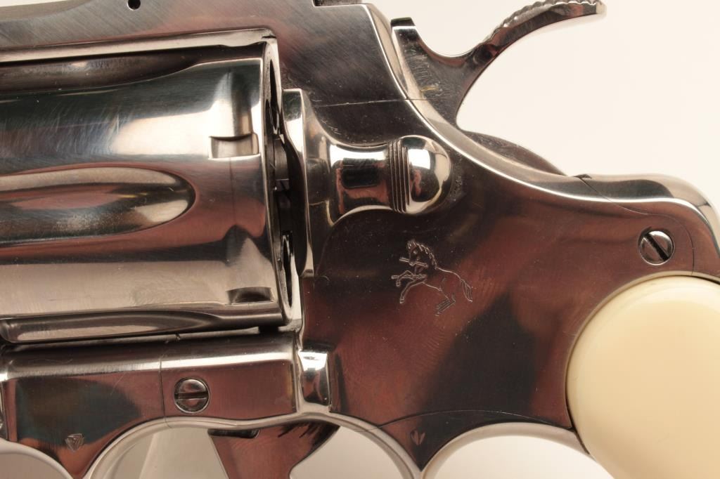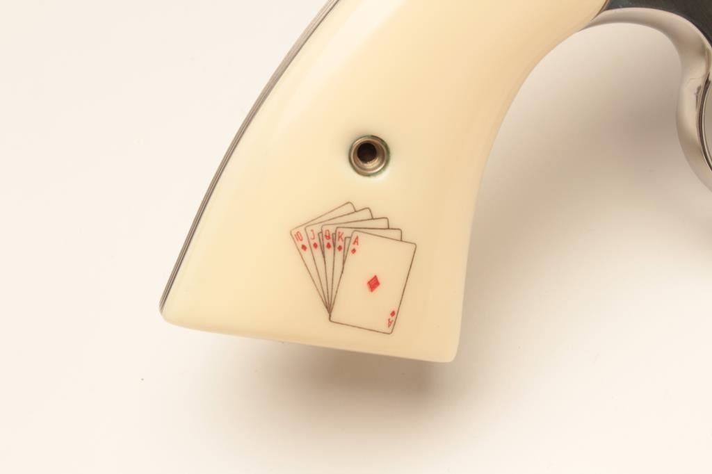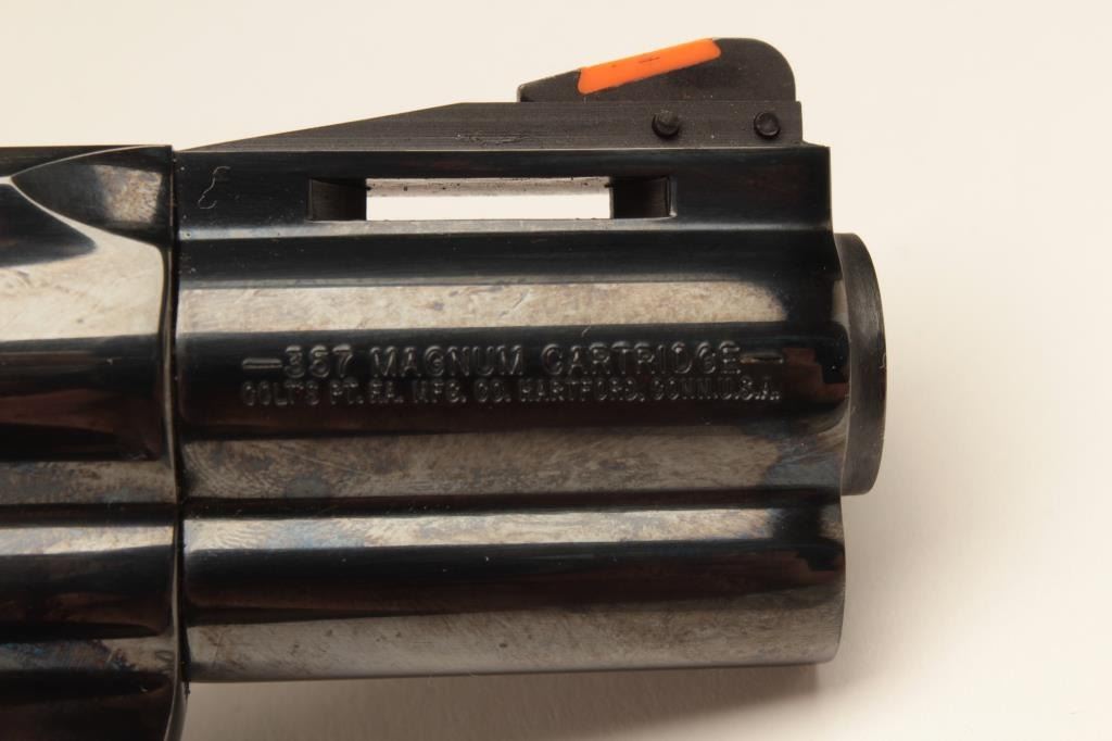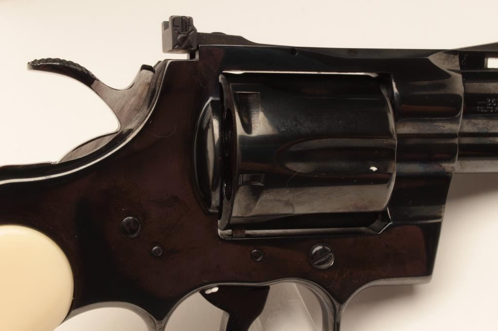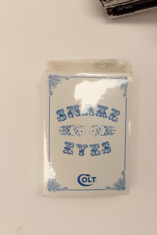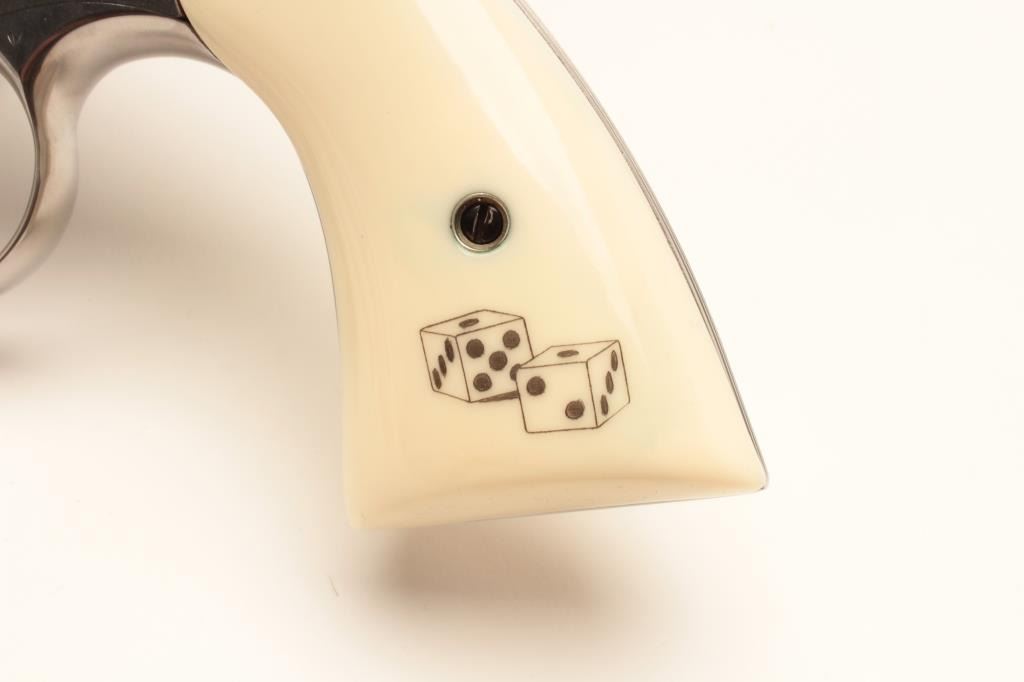 18BM-64 SNAKE EYESColt Snake Eyes limited edition Custom Shop 2 gun set of 2 1/2" Pythons. Each gun features a 2 1/2" full lug barrel, with adjustable sights,scrimshawed grips with two dice on the left grip panel and a royal flush on the right grip panel. #375 EYES is a stainless revolver in excellent condition overall, showing little evidence of use. Grips are excellent, bore is excellent, action is excellent. #EYES 375 is a bluedrevolver, in as new condition, mint bore and action, grips are excellent. Guns are accompanied by a lighted walnut display case, with playing cards and poker chips, which is also in excellent condition. This limitededition series was released in 1989, with only 500 sets being produced. This is a must have for any Snake collection, and the ultimate Python set. Also included are both factory Custom Shop boxes which are in verygood condition, along with the original factory shipping sleeves. (Modern / PPT) Est. $7000-14000Colt Snake Eyes limited edition Custom Shop 2 gun set of 2 1/2" Pythons. Each gun features a 2 1/2" full lug barrel, with adjustable sights,scrimshawed grips with two dice on the left grip panel and a royal flush on the right grip panel. #375 EYES is a stainless revolver in excellent condition overall, showing little evidence of use. Grips are excellent, bore is excellent, action is excellent. #EYES 375 is a bluedrevolver, in as new condition, mint bore and action, grips are excellent. Guns are accompanied by a lighted walnut display case, with playing cards and poker chips, which is also in excellent condition. This limitededition series was released in 1989, with only 500 sets being produced. This is a must have for any Snake collection, and the ultimate Python set. Also included are both factory Custom Shop boxes which are in verygood condition, along with the original factory shipping sleeves. (Modern / PPT) Est. $7000-14000
