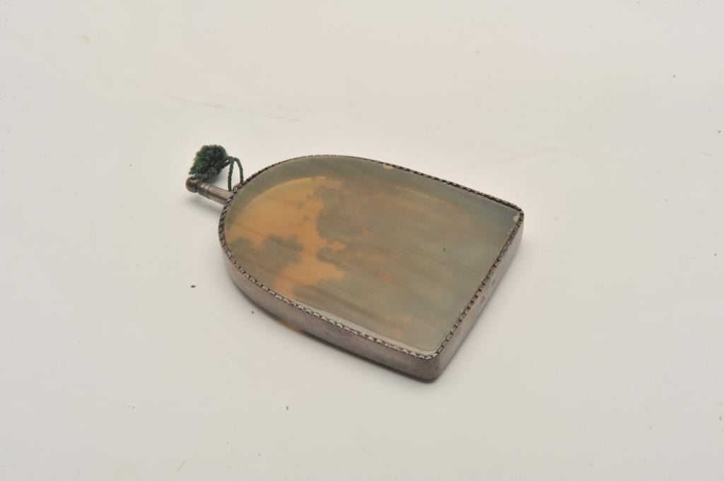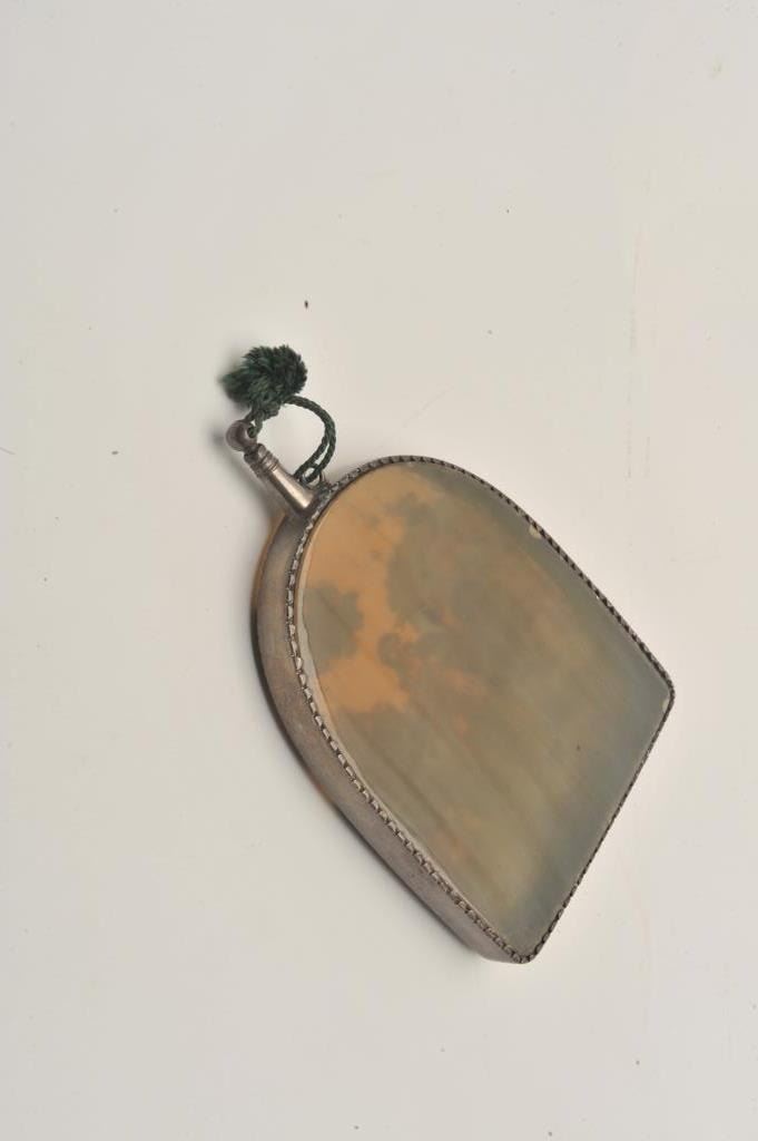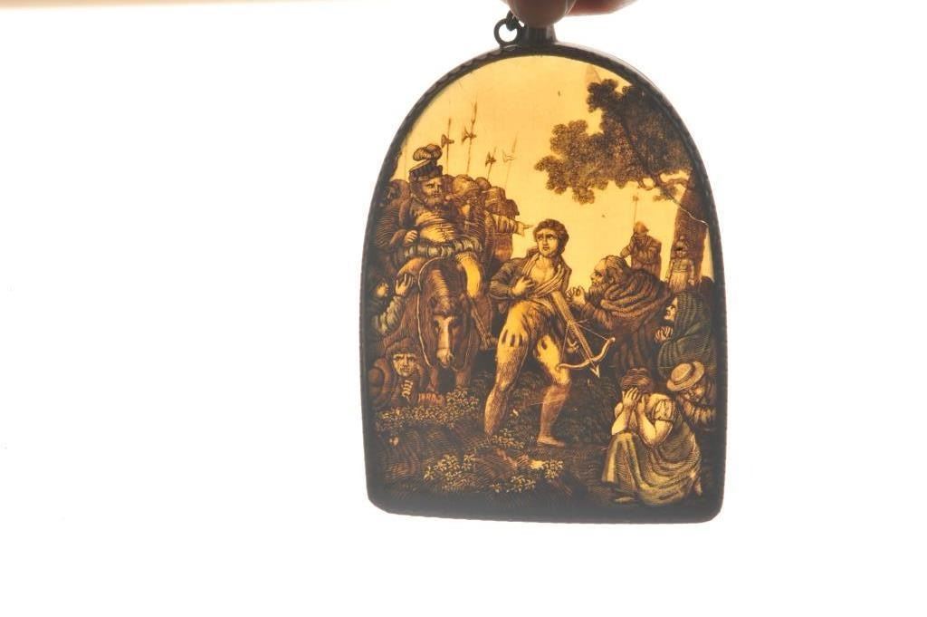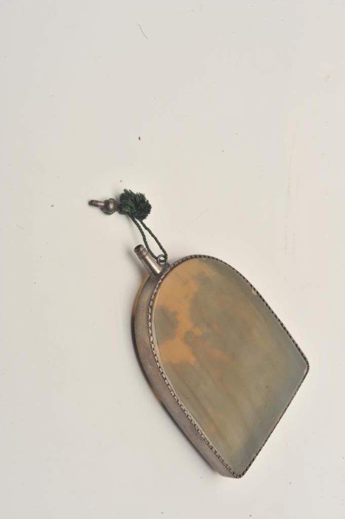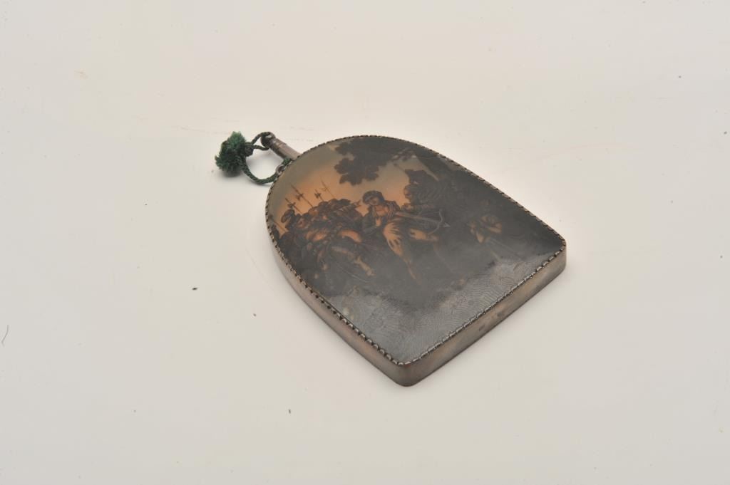 EVE-83 INSIDE REVERSE PAINTED FLASKMagnificent inside reverse painted flask on shell with silver mounts from the 18th century. Shows William Tell scene of father with crossbow and son with an apple on his head along with noble and knights in armor.Measures 5 ½” x 3 3/8” across. Fine other than one crack. The artwork is fully intact. Obtained by Eric Vaule from Ruth Blumka who was a famous early collector in New York City. The flask that appealed to Eric themost as to superb artwork. The spout is thin and small and some have argued a sand flask. Eric believed it to be a priming flask for triple F fine powder filled by funnel and a sand flask would not have an armorial scene.An irrelevant argument as it is a work of art. The estate of Eric Vaule. Est.: $5,000-$10,000Magnificent inside reverse painted flask on shell with silver mounts from the 18th century. Shows William Tell scene of father with crossbow and son with an apple on his head along with noble and knights in armor.Measures 5 ½” x 3 3/8” across. Fine other than one crack. The artwork is fully intact. Obtained by Eric Vaule from Ruth Blumka who was a famous early collector in New York City. The flask that appealed to Eric themost as to superb artwork. The spout is thin and small and some have argued a sand flask. Eric believed it to be a priming flask for triple F fine powder filled by funnel and a sand flask would not have an armorial scene.An irrelevant argument as it is a work of art. The estate of Eric Vaule. Est.: $5,000-$10,000