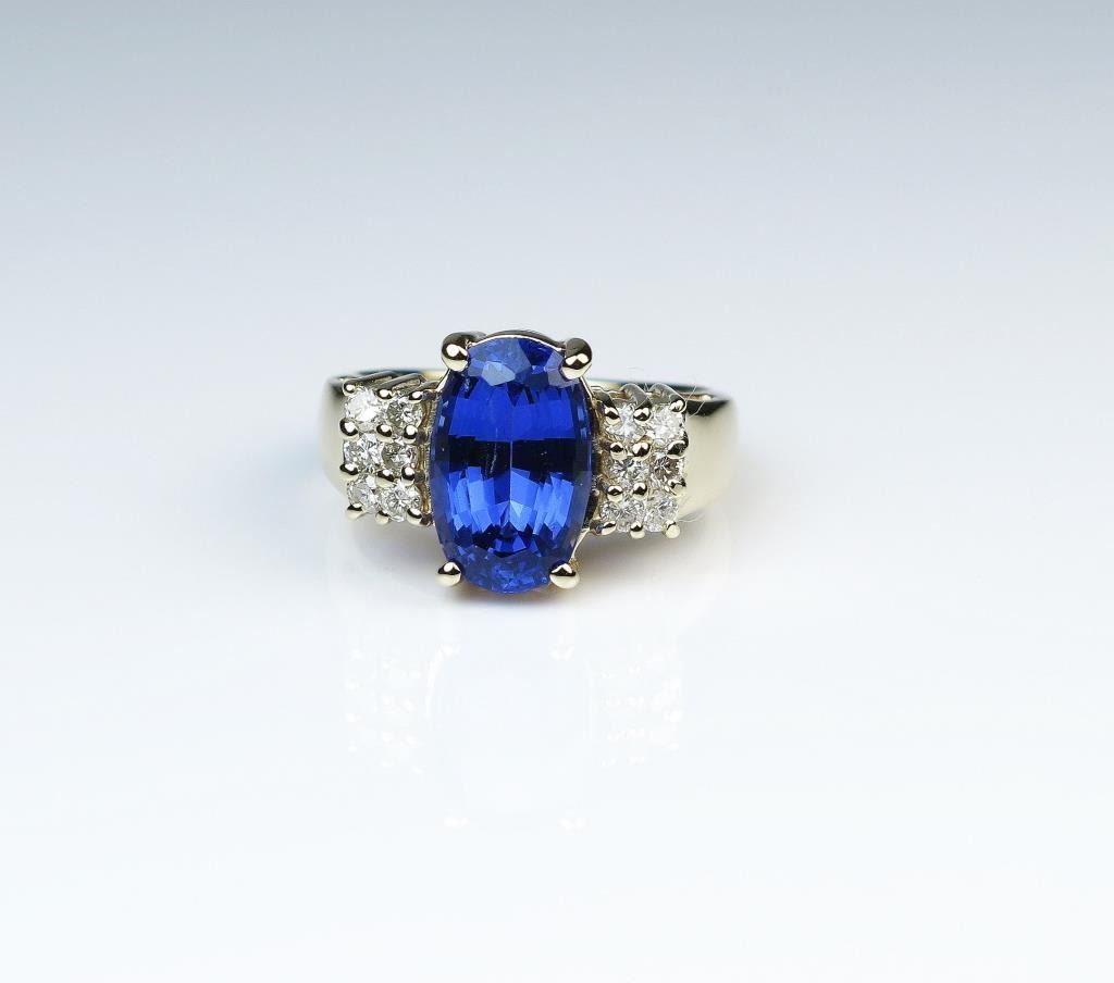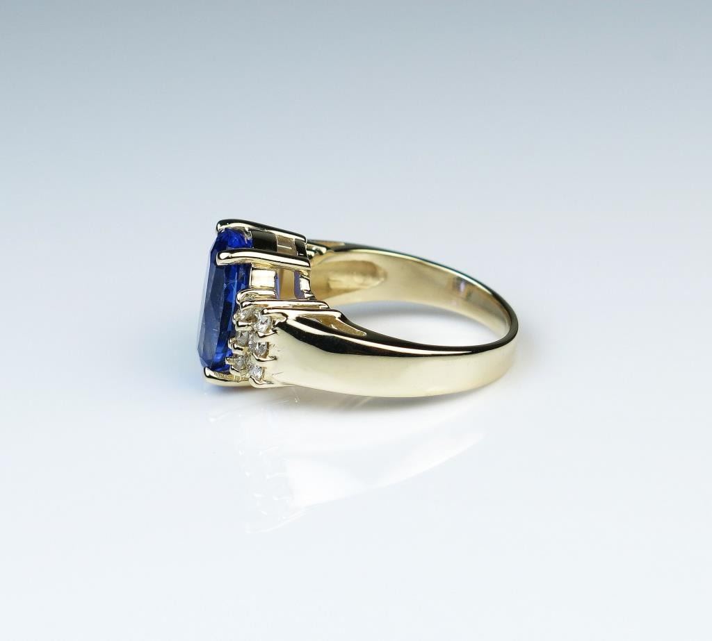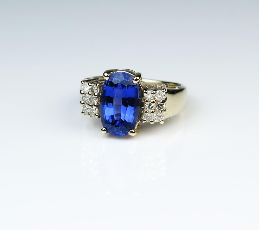 18CAI-1 TANZANITE RINGGorgeous ring featuring an intense color Tanzanite weighing between 3.50- 4.00 carats with 12 fine cut Diamonds weighing approx. 0.50 carats of G-H colors and SI clarity set in a 14 karat yellow gold setting. Estimates $2,000-$3,000 NiceGorgeous ring featuring an intense color Tanzanite weighing between 3.50- 4.00 carats with 12 fine cut Diamonds weighing approx. 0.50 carats of G-H colors and SI clarity set in a 14 karat yellow gold setting. Estimates $2,000-$3,000 Nice