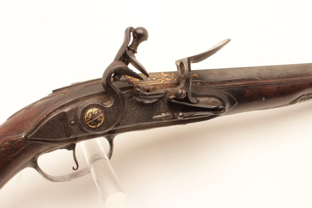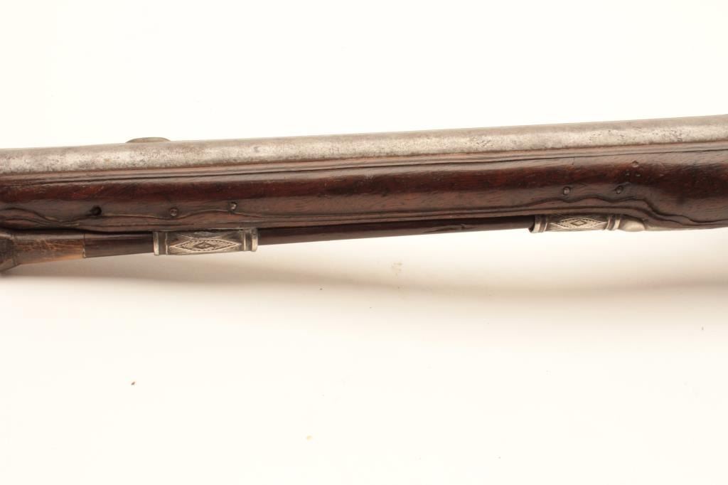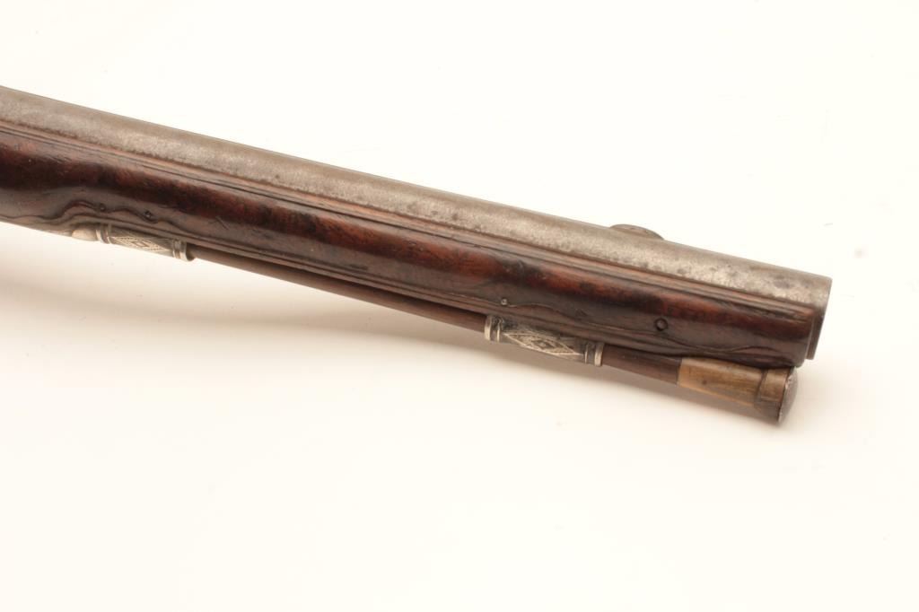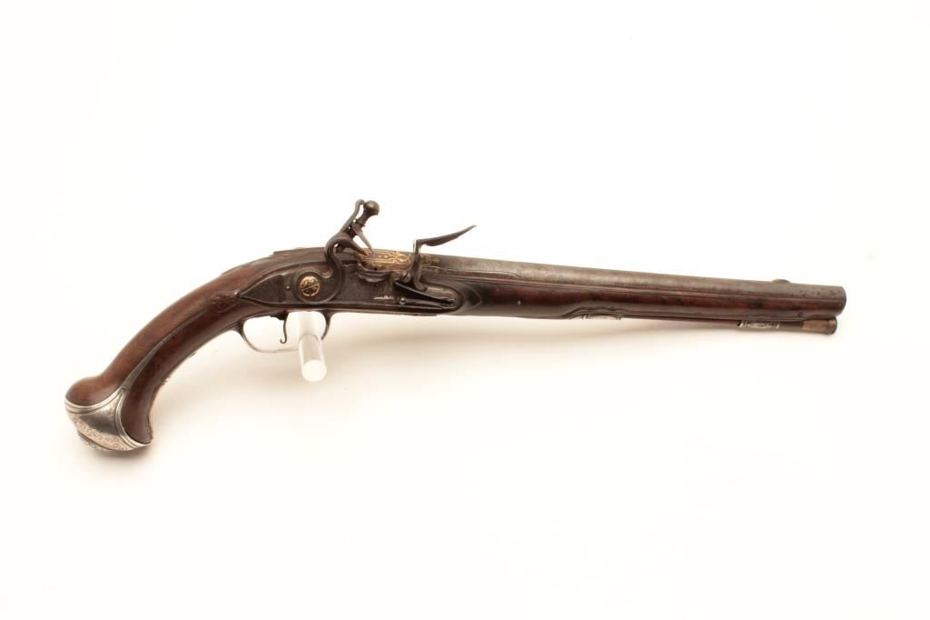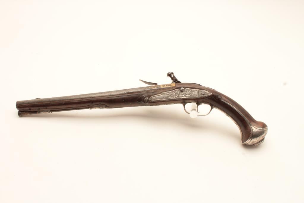 18CA-1 HORSEMANS PISTOLSFine French silver mounted flintlock horseman’s pistol signed “Le Lorain a Valence” circa about 1725-1750. Measures 20” overall with a 12 5/8” barrel of approximately .69 caliber smoothbore. Showshigh quality throughout with nicely engraved lock and good damascened barrel and hammer screw. Mask butt with geometric and figural trigger guard, ramrod pipes, and side plate, all show small French silver hallmarks.Nicely stocked in quality walnut with raised carving and molding. Original ramrod. Very good plus condition with minor staining and slight aging to the metal. All correct flintlock parts (Re-hammer, frizzen, screw,and top jaw), The stock is also very good to almost fine. Silver mounted French pistols of this size and quality are very uncommon. (Antique) Est.: $3000-$6000Fine French silver mounted flintlock horseman’s pistol signed “Le Lorain a Valence” circa about 1725-1750. Measures 20” overall with a 12 5/8” barrel of approximately .69 caliber smoothbore. Showshigh quality throughout with nicely engraved lock and good damascened barrel and hammer screw. Mask butt with geometric and figural trigger guard, ramrod pipes, and side plate, all show small French silver hallmarks.Nicely stocked in quality walnut with raised carving and molding. Original ramrod. Very good plus condition with minor staining and slight aging to the metal. All correct flintlock parts (Re-hammer, frizzen, screw,and top jaw), The stock is also very good to almost fine. Silver mounted French pistols of this size and quality are very uncommon. (Antique) Est.: $3000-$6000
