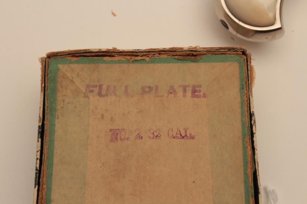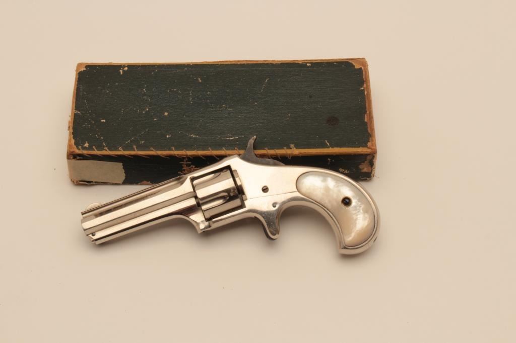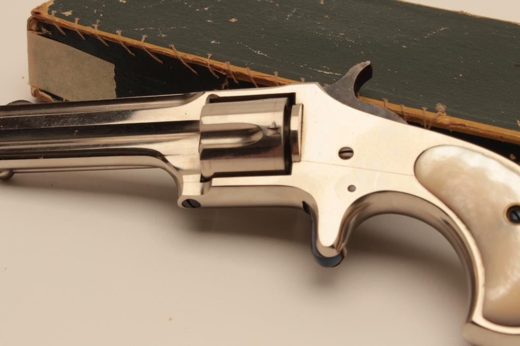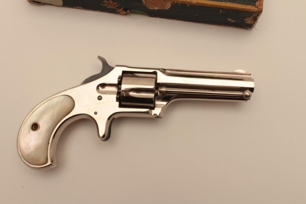 18AN-16 REMINGTON NO. 2 SMOOTRemington No. 2 “Smoot” .32 caliber single action revolver almost mint in original cardboard box. Nickel with pearl grips showing 98%-99% plus nickel. Bright case hardening on the hammer 95%-98% and fiery.Bright blue on small parts and screws. Excellent grips. Full label in the lid. The bottom is stamped in ink “Full Plate, .32 caliber”. The box is good to very good with old repairs by stitching. Wax paper withbrush. A 9.8 plus on a 1-10 scale. (Antique) Est.: $1250-$2500Remington No. 2 “Smoot” .32 caliber single action revolver almost mint in original cardboard box. Nickel with pearl grips showing 98%-99% plus nickel. Bright case hardening on the hammer 95%-98% and fiery.Bright blue on small parts and screws. Excellent grips. Full label in the lid. The bottom is stamped in ink “Full Plate, .32 caliber”. The box is good to very good with old repairs by stitching. Wax paper withbrush. A 9.8 plus on a 1-10 scale. (Antique) Est.: $1250-$2500