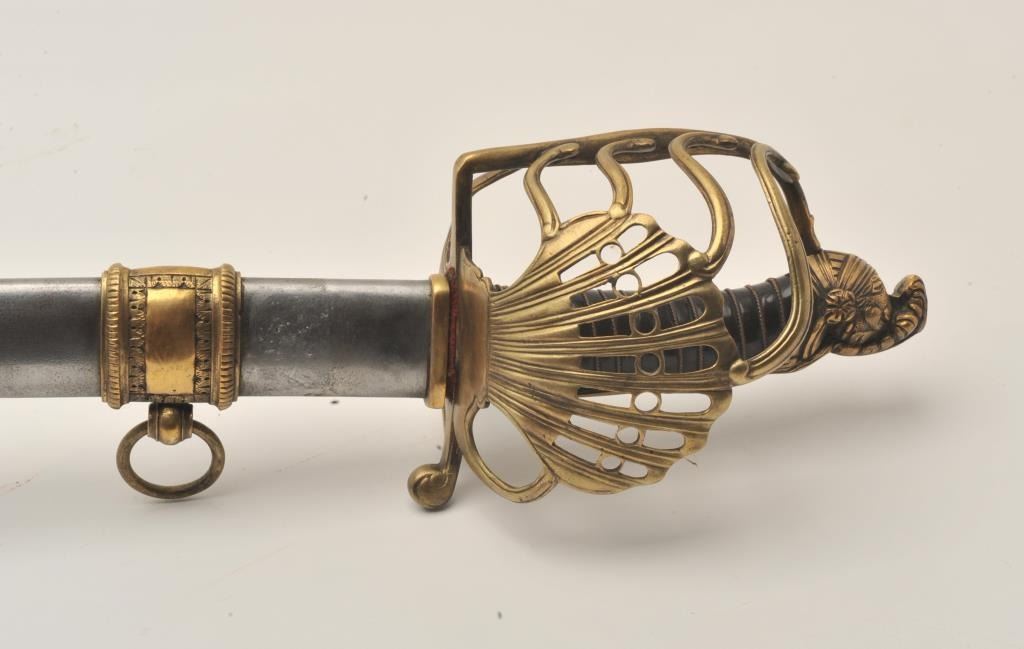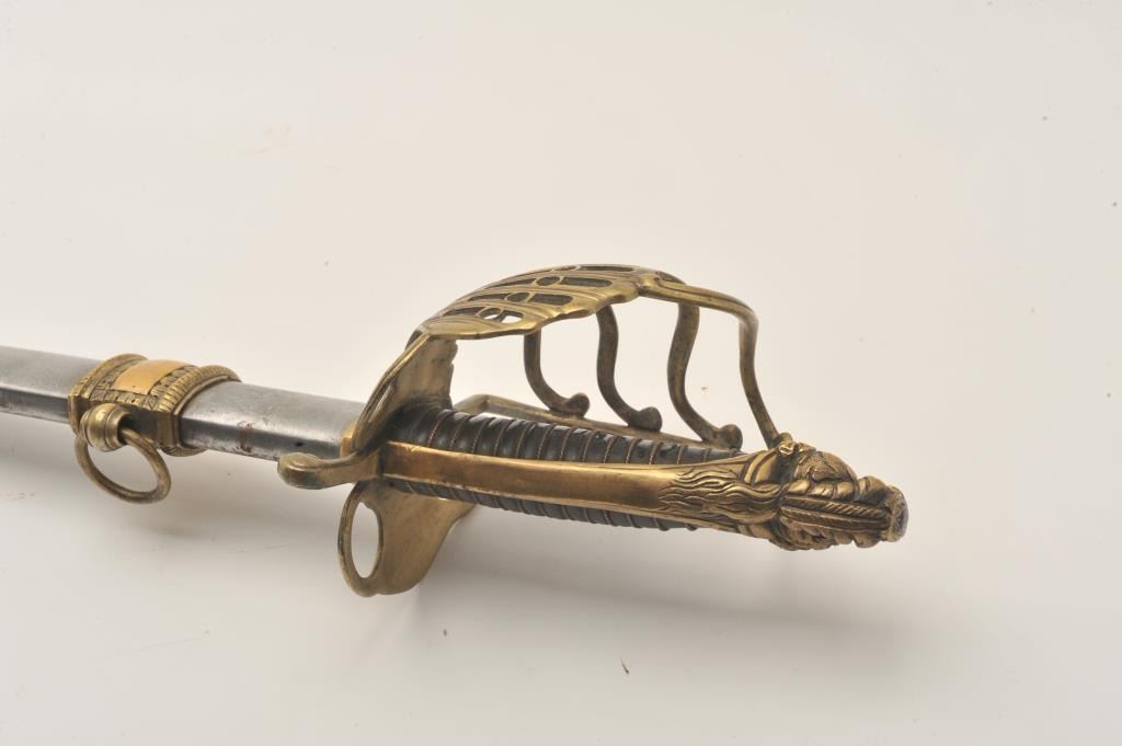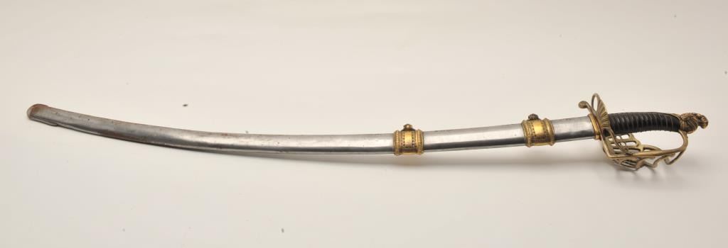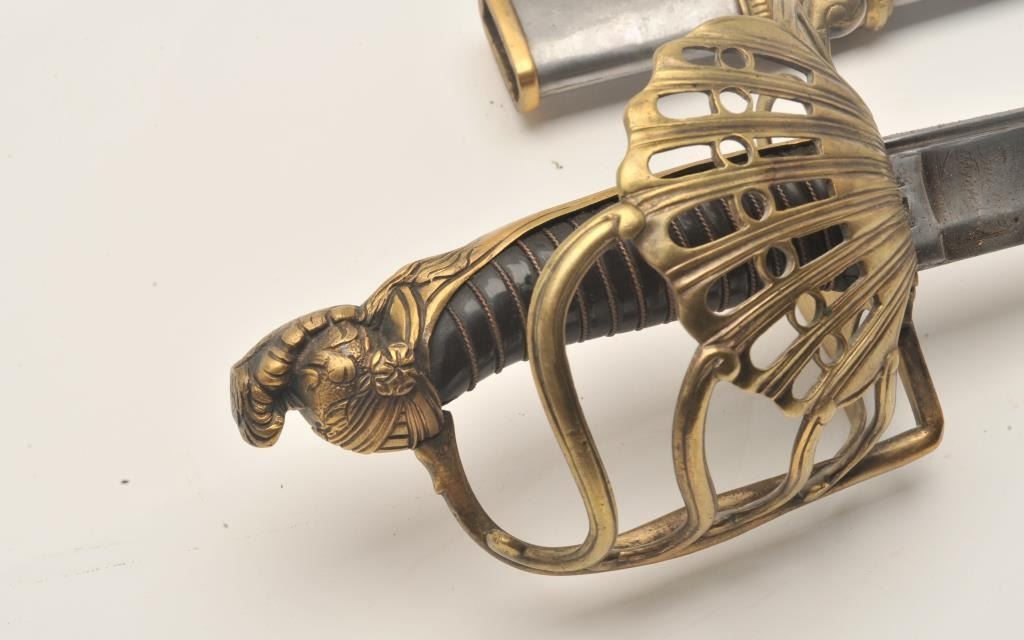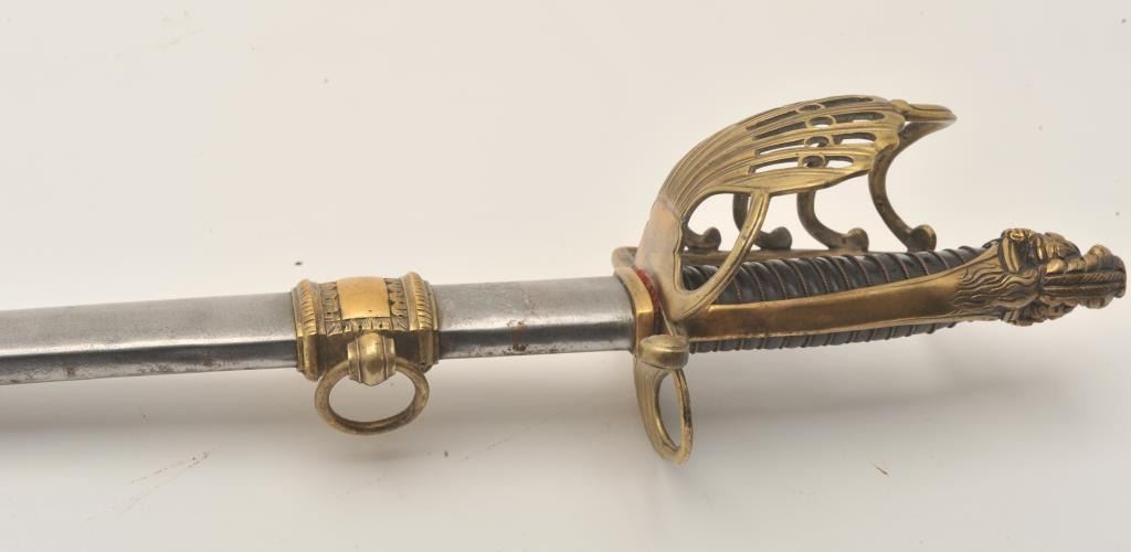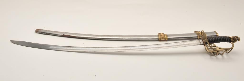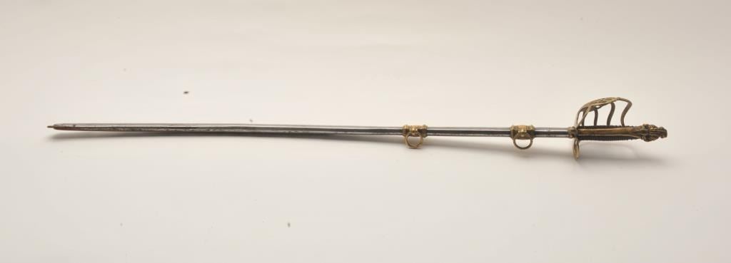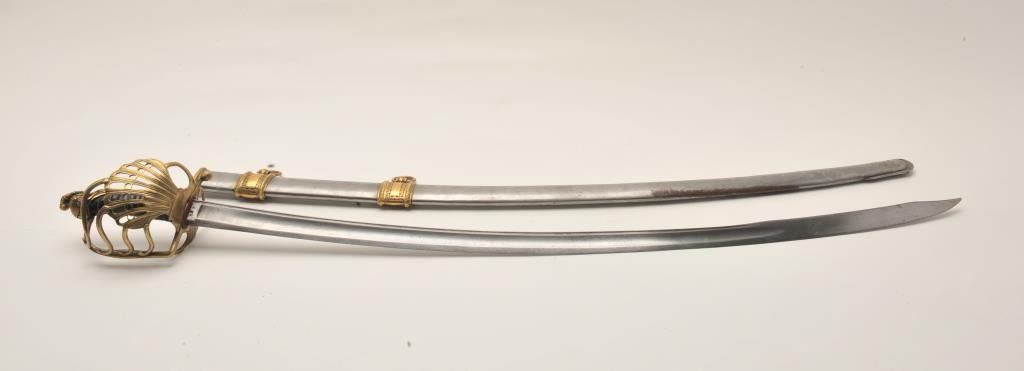 18AR-13 KLINGENTHAL SWORDKlingenthal 1st Empire sword with brass mounted metal scabbard, approximately 42” overall with a 35.5” blade, fancy clamshell brass guard with brass knight’s head pommel, wire wrapped grip, sword is in overall goodto very good condition; scabbard good to very good with some areas of light rust from storage that should clean. Est.: $2,000-$4,000.Klingenthal 1st Empire sword with brass mounted metal scabbard, approximately 42” overall with a 35.5” blade, fancy clamshell brass guard with brass knight’s head pommel, wire wrapped grip, sword is in overall goodto very good condition; scabbard good to very good with some areas of light rust from storage that should clean. Est.: $2,000-$4,000.