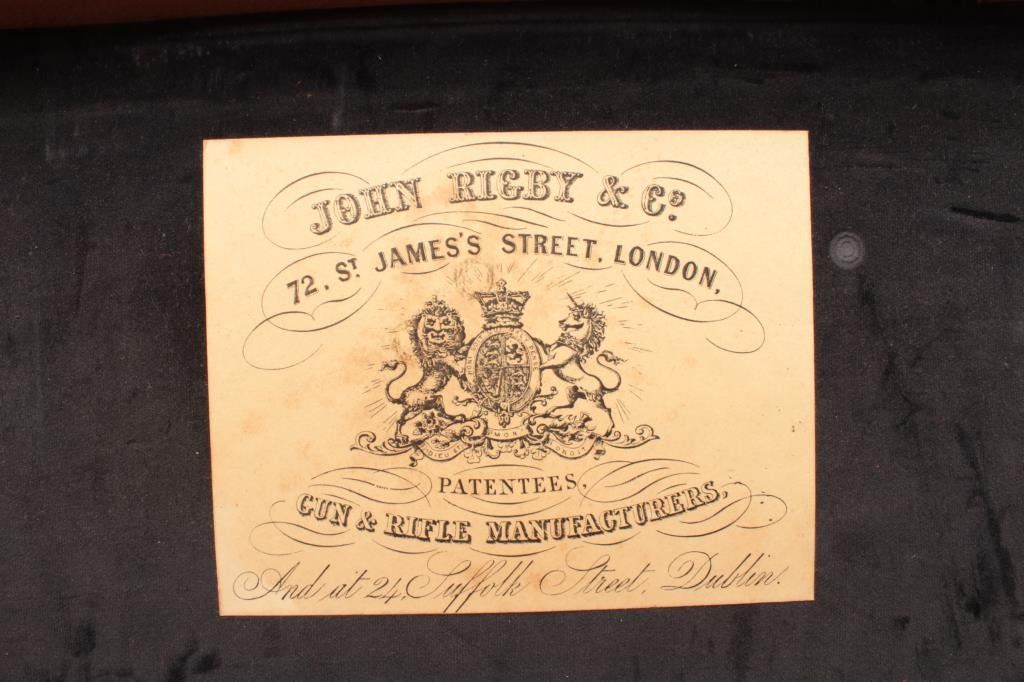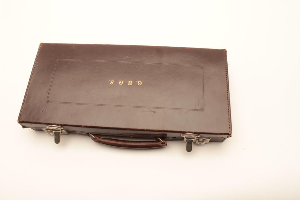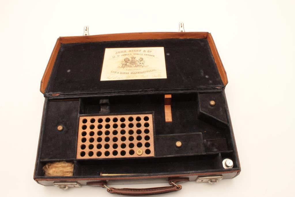 18AN-6 Original luggage type case for Colt SingleOriginal luggage type case for Colt Single Action with a 7 ½” barrel showing Rigby London dealers label in the lid. A very deluxe oversize case with .44 caliber cartridge block, covered compartments, oilerand brass rod. The exterior is very good plus to almost fine with opening to the stitching and slight wear. “G.H.G.S.” stamped in gold book binder style letters in top of the case. Last contained a near mint flat top in .44S&W but fits a standard frame also. A superior case worthy of fine flat top or English proofed single action. Est.: $1500-$3000Original luggage type case for Colt Single Action with a 7 ½” barrel showing Rigby London dealers label in the lid. A very deluxe oversize case with .44 caliber cartridge block, covered compartments, oilerand brass rod. The exterior is very good plus to almost fine with opening to the stitching and slight wear. “G.H.G.S.” stamped in gold book binder style letters in top of the case. Last contained a near mint flat top in .44S&W but fits a standard frame also. A superior case worthy of fine flat top or English proofed single action. Est.: $1500-$3000