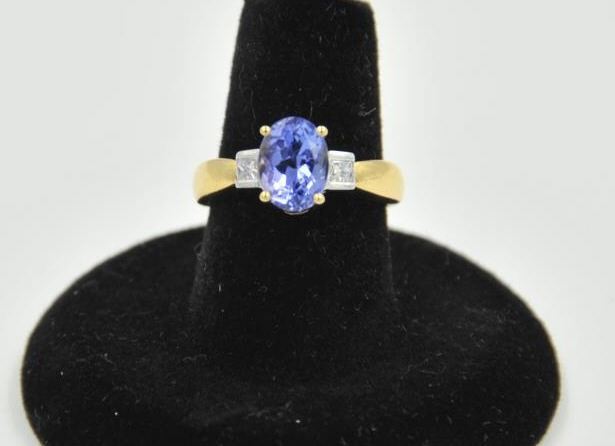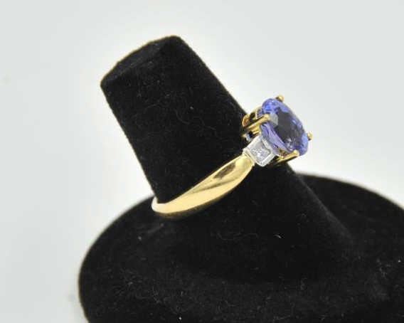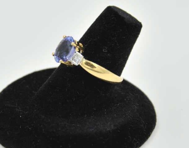 18PRS-14 TANZANITE & DIAMOND RINGOne ladies ring in 18k yellow gold set with a oval tanzanite wt approx 2.5ct and 2 princess cut diamonds EST:$750-1000One ladies ring in 18k yellow gold set with a oval tanzanite wt approx 2.5ct and 2 princess cut diamonds EST:$750-1000