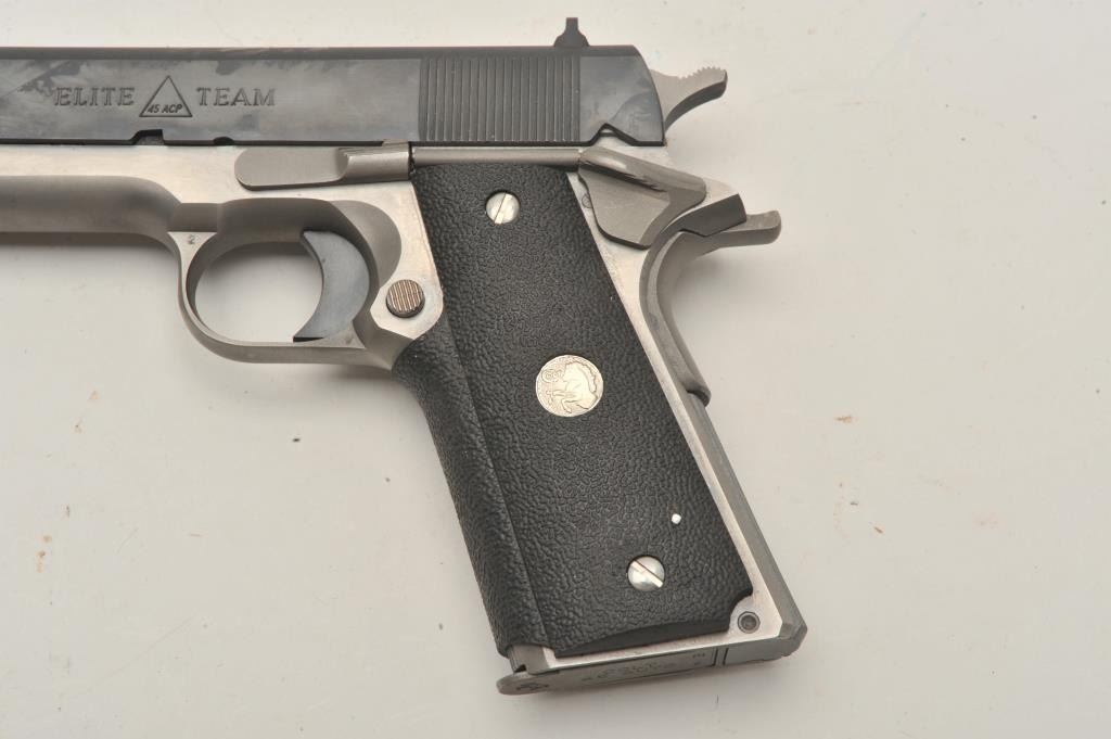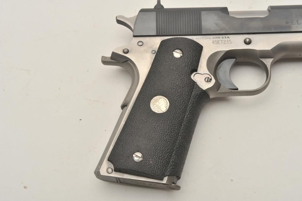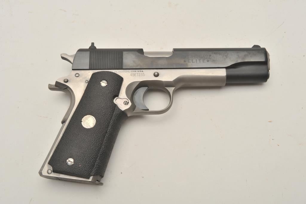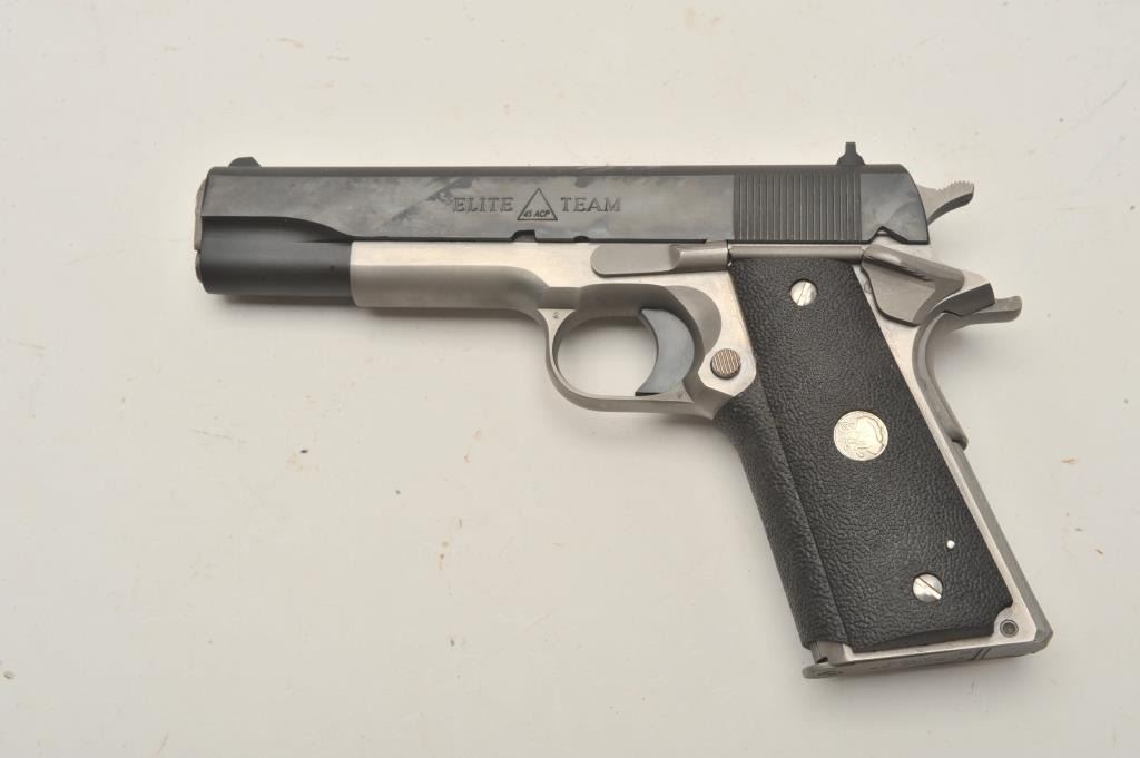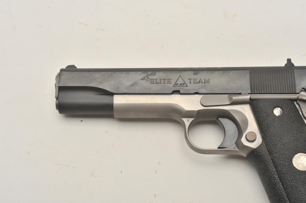 18BM-26 COLT ELITE TEAMColt Elite Team Government Model .45 ACP, #45ET235, 5" barrel, 2 tone stainless frame with blued slide, 3 dot drift adjustable sights, rubber wrap around grips with Colt logo. Pistol is in near excellent condition, retaining 98-99% origional finish, mint bore, excellent action. Includes origional box numbered to gun in with tear to the end flap, otherwise very good condition, with manual. (Modern / PPT) Est. $900-1800Colt Elite Team Government Model .45 ACP, #45ET235, 5" barrel, 2 tone stainless frame with blued slide, 3 dot drift adjustable sights, rubber wrap around grips with Colt logo. Pistol is in near excellent condition, retaining 98-99% origional finish, mint bore, excellent action. Includes origional box numbered to gun in with tear to the end flap, otherwise very good condition, with manual. (Modern / PPT) Est. $900-1800