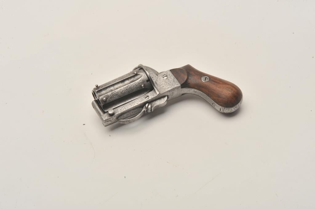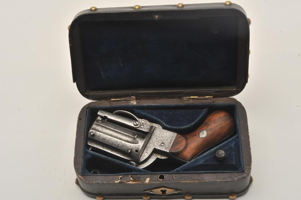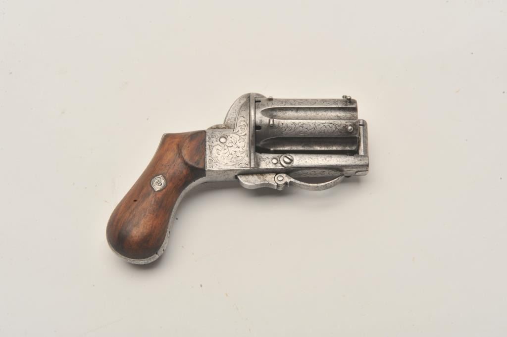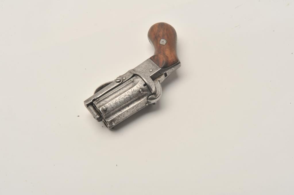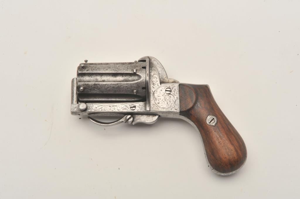 Lot 892 18AR-68 PINFIRECased and engraved pinfire folding trigger revolver, 7.65mm caliber, 2” cylinder, wo