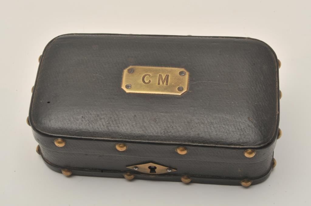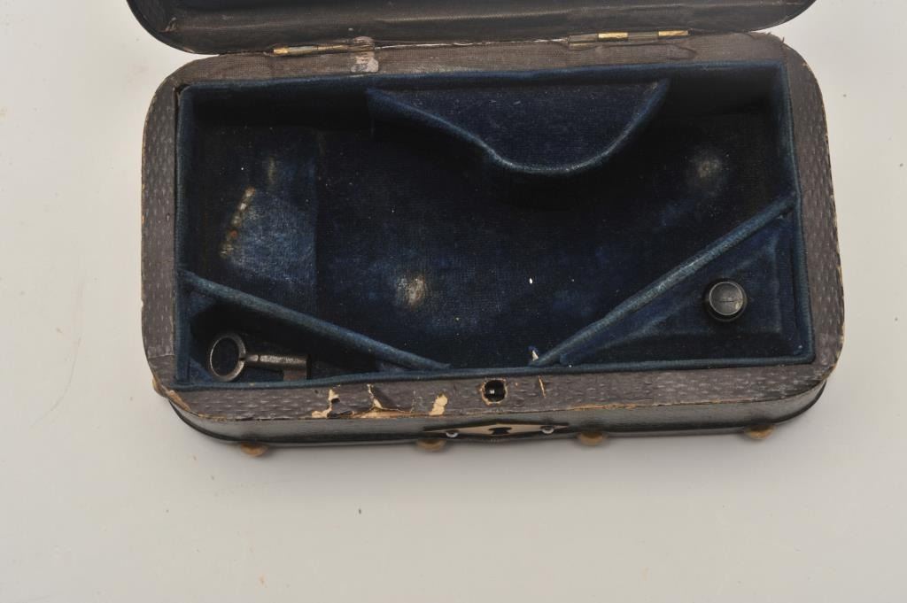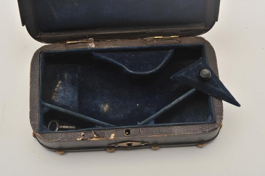 18AR-68 PINFIRECased and engraved pinfire folding trigger revolver, 7.65mm caliber, 2” cylinder, wood grips, in overall good to very good condition with an even grey patina on metal surfaces, good action, very good wood grips;presentation case is leather covere3d with brass studs on the outside and blue velvet lining on inside; top of lid shows brass cover panel with initials “C.M.”. Est.: $900-$1,800.Cased and engraved pinfire folding trigger revolver, 7.65mm caliber, 2” cylinder, wood grips, in overall good to very good condition with an even grey patina on metal surfaces, good action, very good wood grips;presentation case is leather covere3d with brass studs on the outside and blue velvet lining on inside; top of lid shows brass cover panel with initials “C.M.”. Est.: $900-$1,800.