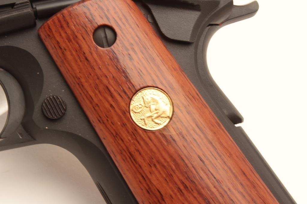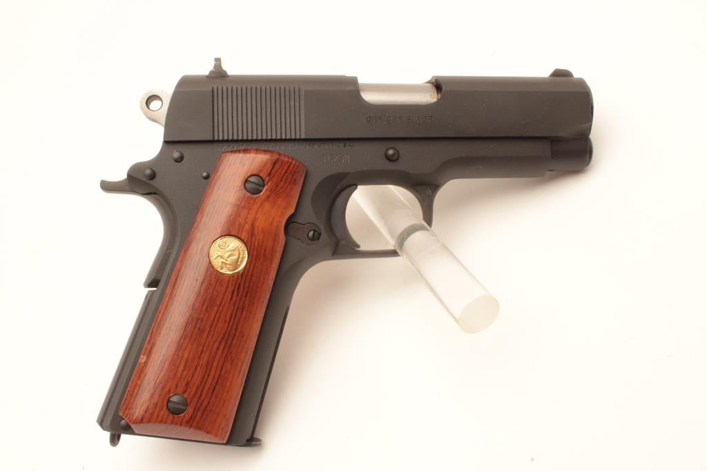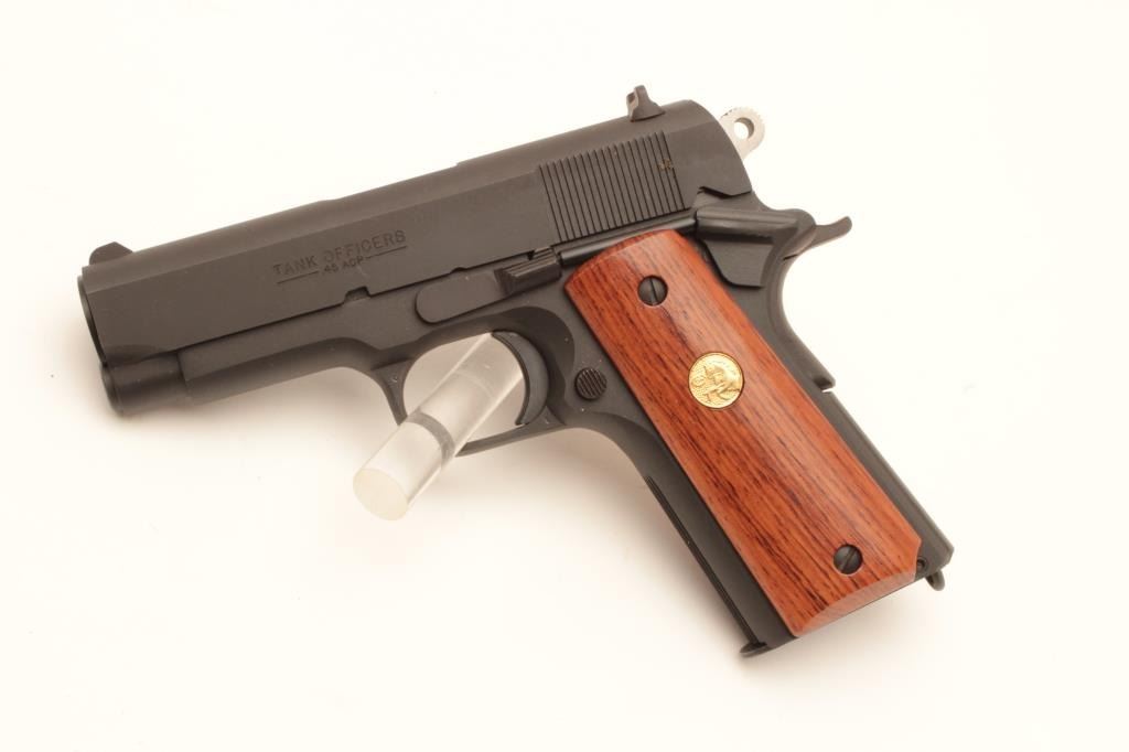 18BM-30 COLT TANK OFFICER'SColt Tank Officers model .45 ACP cal., #TC258, 3 1/2" barrel, matte finish, 3 dot drift adjustable sights with smooth medallion hardwood grips. Has the same features as an Officer's model with the addition of alanyard loop. Manufactured by the Colt Custom Shop in 1989, these were a limited run of 350 guns. Pistol is in fine to excellent condition overall, showing little signs of use, finish retains 97-98%+ original finish,grips are near excellent. Includes original Tank Officers soft case and one mag. (Modern / PPT) Est. $700-1400Colt Tank Officers model .45 ACP cal., #TC258, 3 1/2" barrel, matte finish, 3 dot drift adjustable sights with smooth medallion hardwood grips. Has the same features as an Officer's model with the addition of alanyard loop. Manufactured by the Colt Custom Shop in 1989, these were a limited run of 350 guns. Pistol is in fine to excellent condition overall, showing little signs of use, finish retains 97-98%+ original finish,grips are near excellent. Includes original Tank Officers soft case and one mag. (Modern / PPT) Est. $700-1400