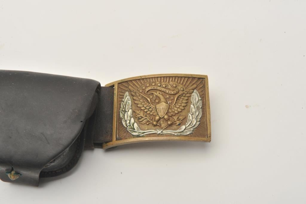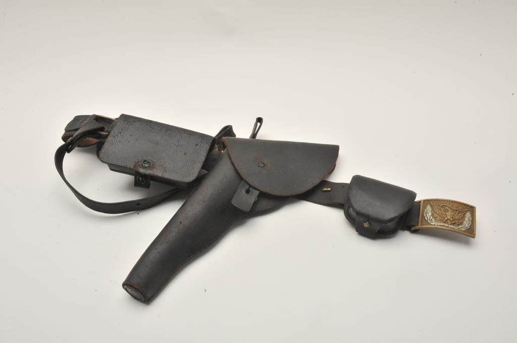 18AL-26 DRAGOON HOLSTERDragoon flap holster marked “E. Gaylord” on belt with Non-Commissioned or Enlisted man’s belt buckle, 2 cartridge boxes and sword hangers; overall good condition for age. Est.: $600-$1,200.Dragoon flap holster marked “E. Gaylord” on belt with Non-Commissioned or Enlisted man’s belt buckle, 2 cartridge boxes and sword hangers; overall good condition for age. Est.: $600-$1,200.