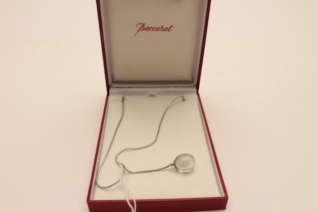 18AO-11 BACCARAT EGG NECKLACEBaccarat crystal egg necklace in original red Baccarat box. The necklace features a beautiful crystal egg on a silver tone round chain. The necklace is in the factory box with associated packaging material. A nicepiece from a local estate. Est.: $150-$300.Baccarat crystal egg necklace in original red Baccarat box. The necklace features a beautiful crystal egg on a silver tone round chain. The necklace is in the factory box with associated packaging material. A nicepiece from a local estate. Est.: $150-$300.