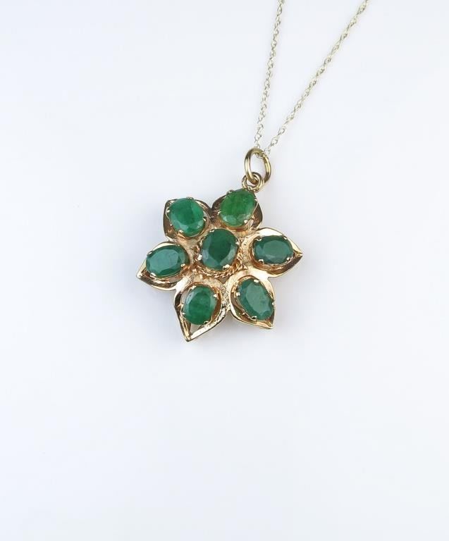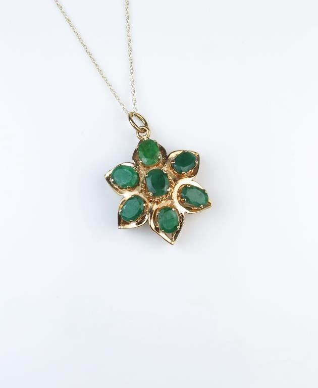 185CAI-58 EMERALD PENDANTColorful flower design Emerald pendant with approx. 4.00 carats in stones set in a 14 karat yellow gold setting on a 10 karat gold chain. Estimates $800-$1,200Colorful flower design Emerald pendant with approx. 4.00 carats in stones set in a 14 karat yellow gold setting on a 10 karat gold chain. Estimates $800-$1,200