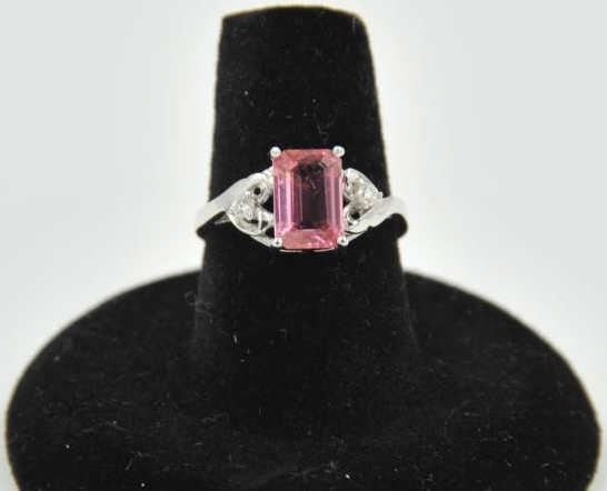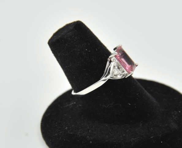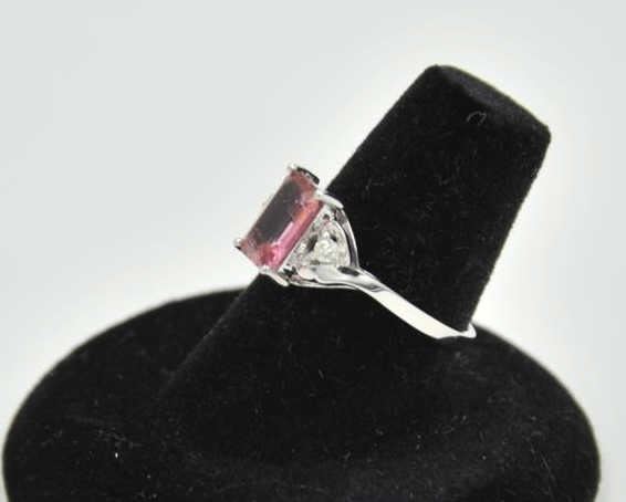 18PRS-11 TOURMALINE & DIAMOND RINGOne emerald cut pink tourmaline approx 2ct with 2 side diamonds ring in 14k white gold EST:$450-500One emerald cut pink tourmaline approx 2ct with 2 side diamonds ring in 14k white gold EST:$450-500