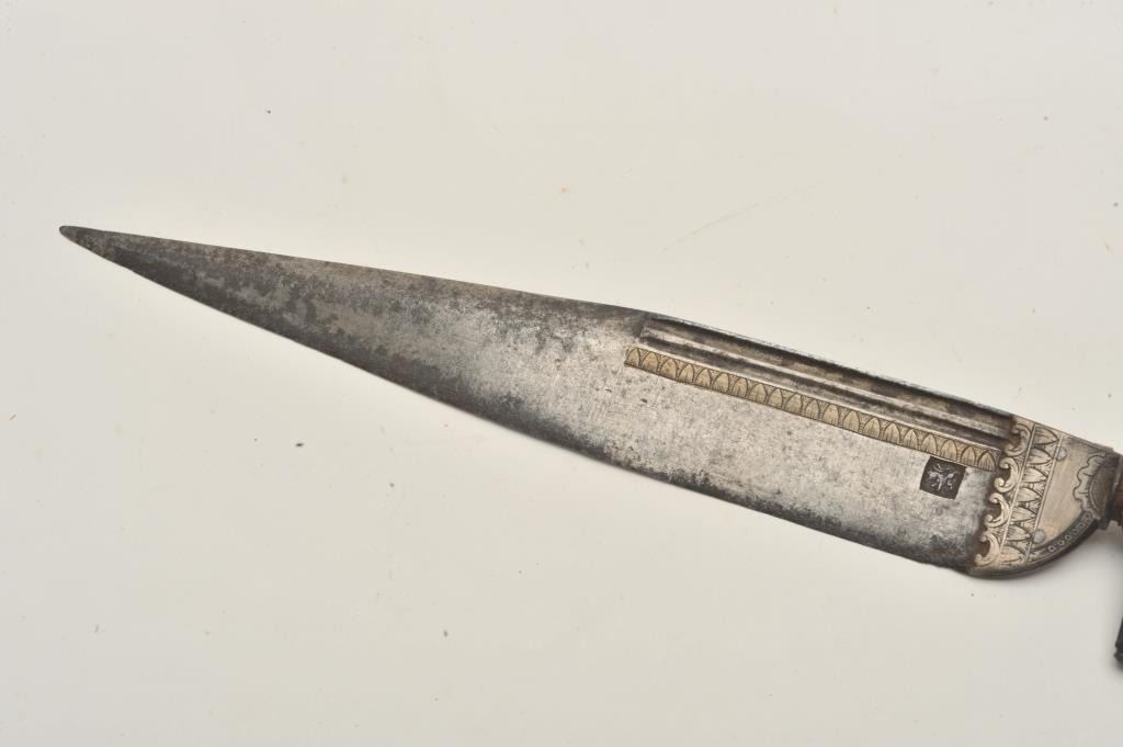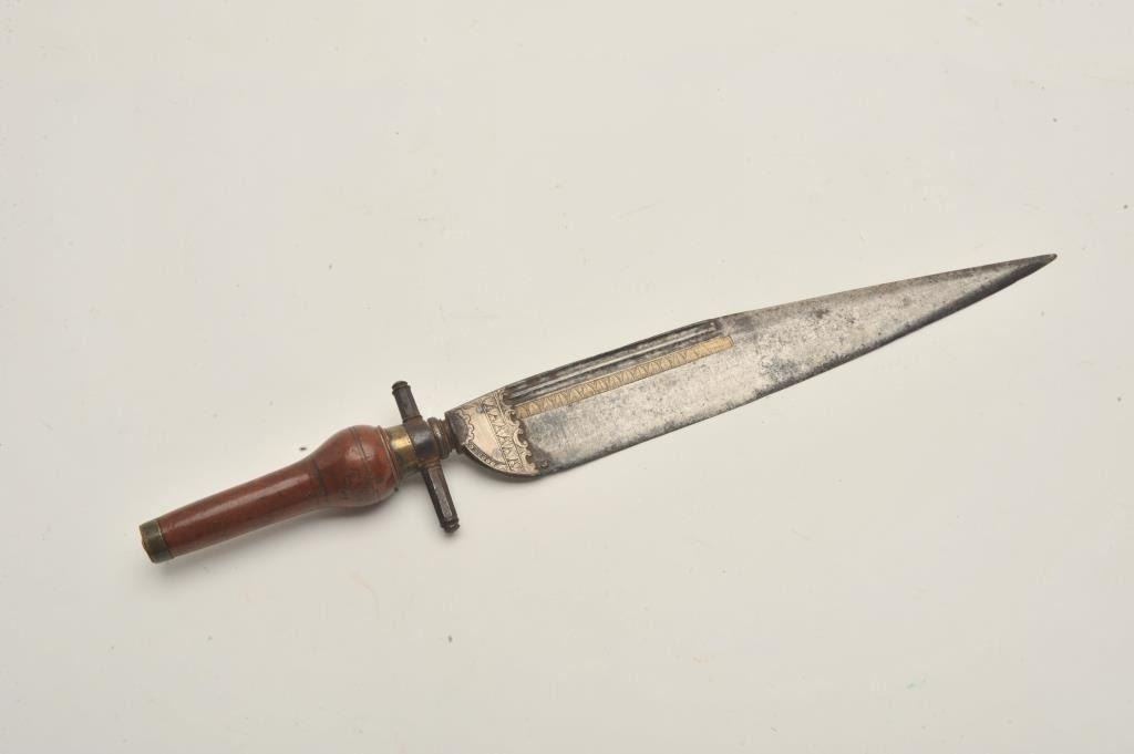 18CF-13 SPANISH PLUG BAYONETExcellent quality Spanish plug bayonet circa Mid-18th to early 19th century with silver and brass inlay and standing lion facing left blade makers mark. Measures 14 ¼” overall with a 10” blade. Very good condition andhigh quality. Some pitting on uncleaned blade with slight sharpening to the front of edge. The nicest we have cataloged in quite a while. An early cousin to the Bowie. Est.: $800-$1600Excellent quality Spanish plug bayonet circa Mid-18th to early 19th century with silver and brass inlay and standing lion facing left blade makers mark. Measures 14 ¼” overall with a 10” blade. Very good condition andhigh quality. Some pitting on uncleaned blade with slight sharpening to the front of edge. The nicest we have cataloged in quite a while. An early cousin to the Bowie. Est.: $800-$1600
