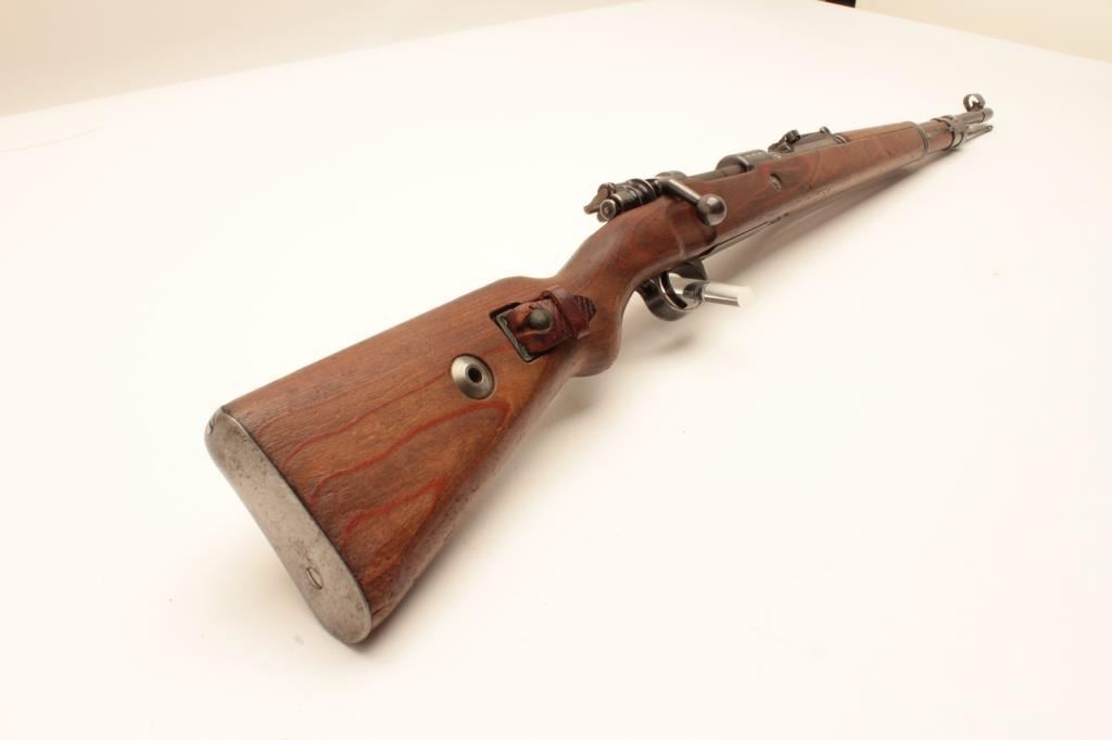 17LY-5 MAUSER 98German Model 98 bolt action rifle, 8mm caliber, Serial #1944L. The rifle is in very good overall condition with a 24” barrel with a hooded ramped blade front and military tangent style rear sights. The barrel andreceiver retain a significant amount of their military finish with the remainder going to a grey patina. The rifle retains the bayonet lug, cleaning rod and sling swivels. The rifle is dated 1939 on the front ring withGerman proofs, 243 code and Nazi markings. The visible serial numbers are all matching, including the barrel band. The smooth wood stock is in good condition showing moderate use with two light Nazi markings on the right side of the butt stock. The butt ends with a smooth steel butt plate. The bore is about fair, the action is crisp and markings are sharp on this early, WW II Mauser. The lot includes a leather military style sling.Est.: $400-$800. (C+R).German Model 98 bolt action rifle, 8mm caliber, Serial #1944L. The rifle is in very good overall condition with a 24” barrel with a hooded ramped blade front and military tangent style rear sights. The barrel andreceiver retain a significant amount of their military finish with the remainder going to a grey patina. The rifle retains the bayonet lug, cleaning rod and sling swivels. The rifle is dated 1939 on the front ring withGerman proofs, 243 code and Nazi markings. The visible serial numbers are all matching, including the barrel band. The smooth wood stock is in good condition showing moderate use with two light Nazi markings on the right side of the butt stock. The butt ends with a smooth steel butt plate. The bore is about fair, the action is crisp and markings are sharp on this early, WW II Mauser. The lot includes a leather military style sling.Est.: $400-$800. (C+R).
