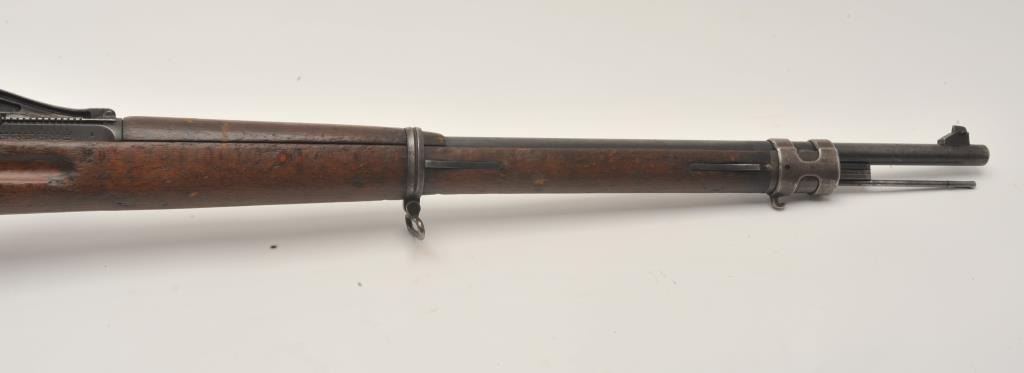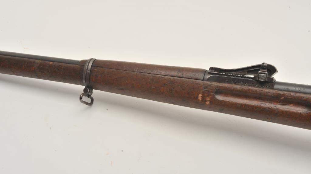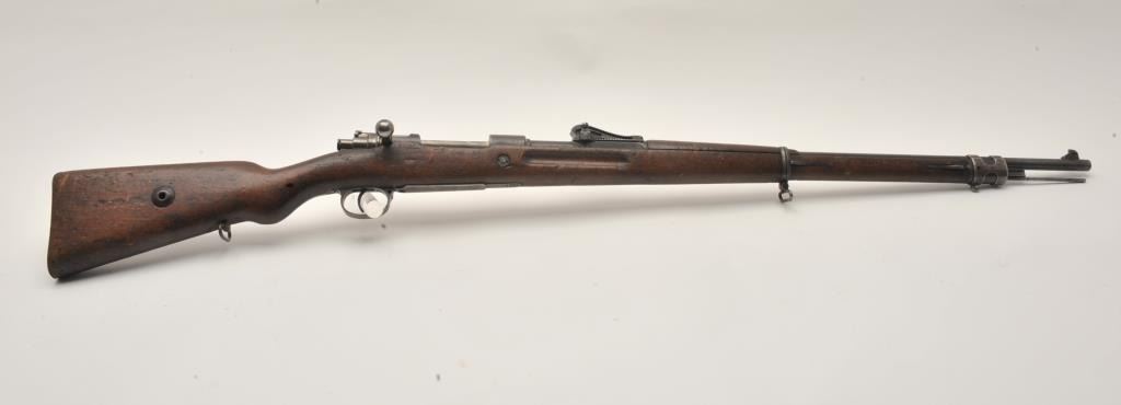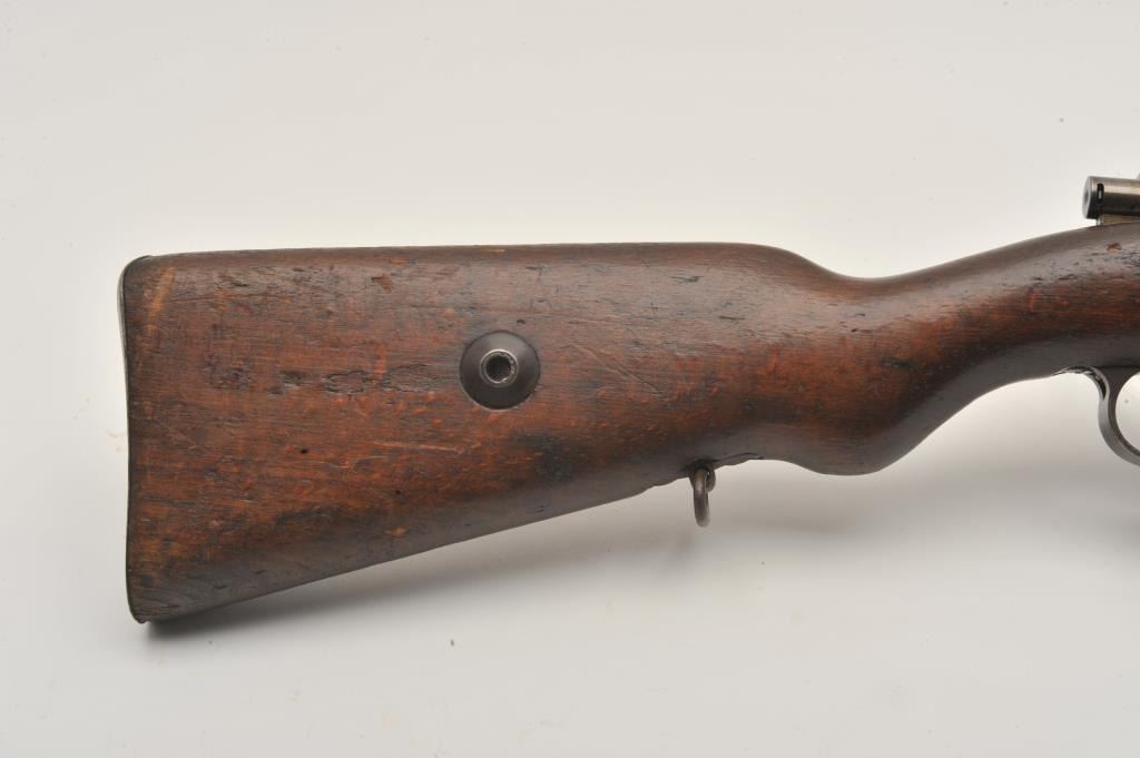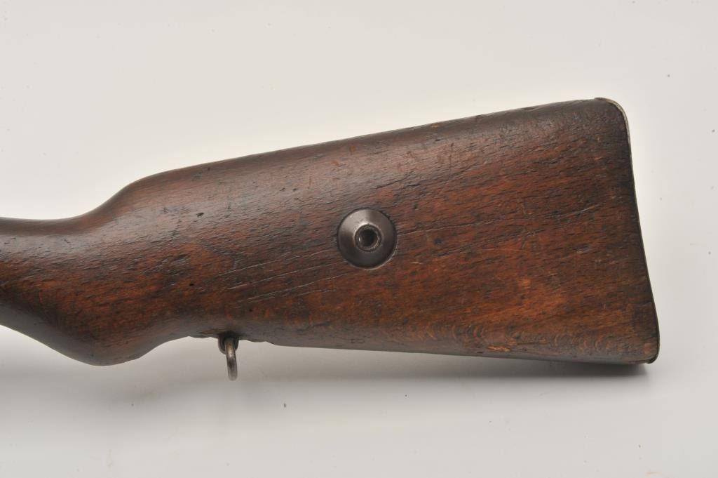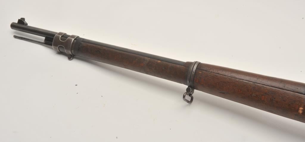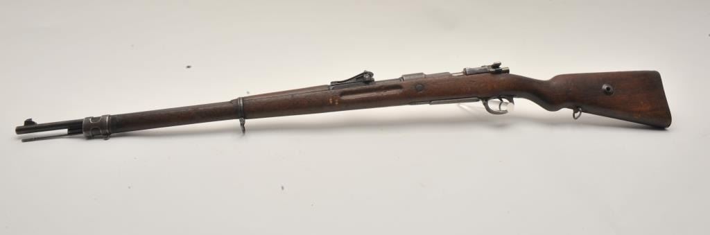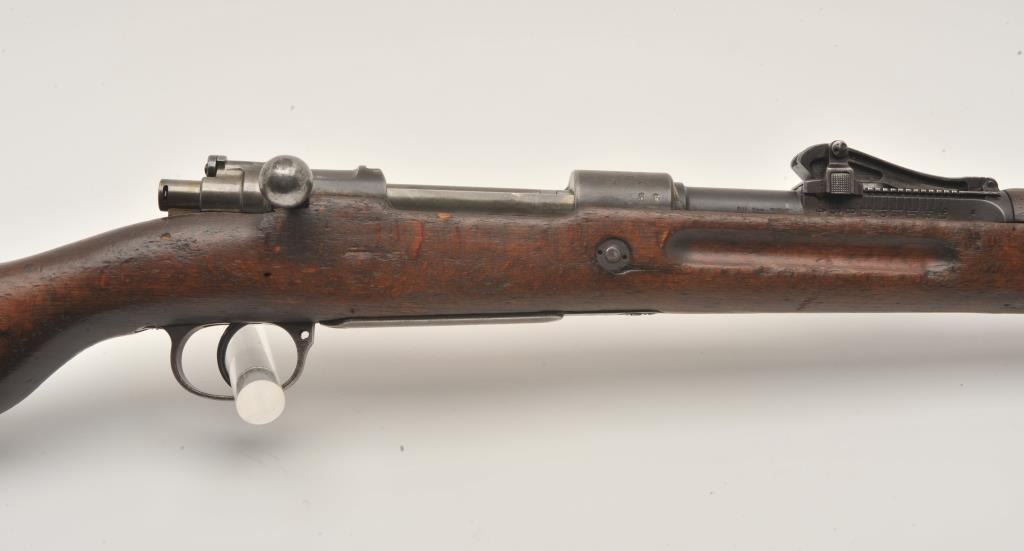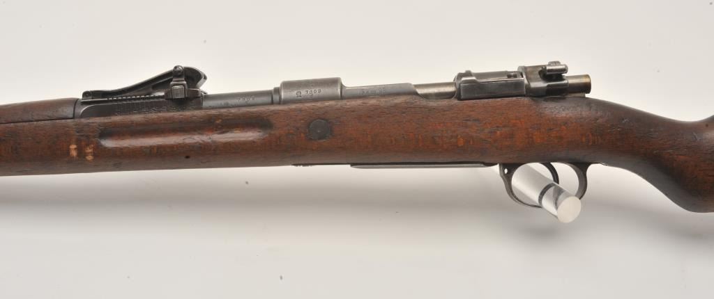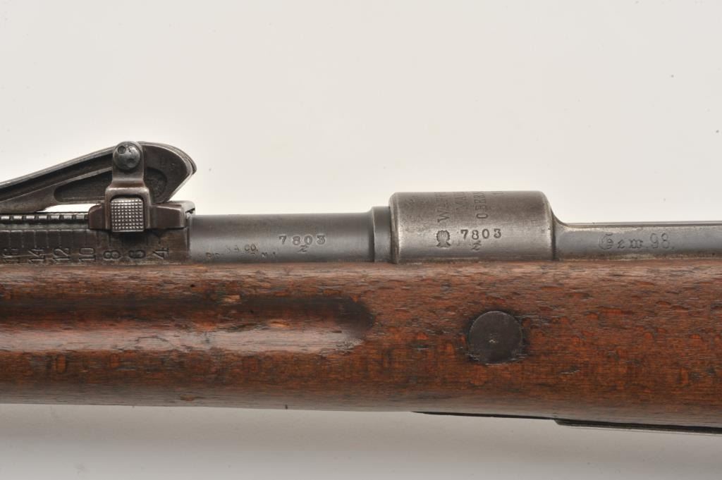 17LY-7 MAUSER 98German Gew. 98 bolt action rifle, 8mm caliber, Serial #7803. The rifle is in good overall condition with a 30” barrel with a ramped blade front and military tangent style rear sights. The barrel and receiver retain a small amount of their military finish with the remainder going to a grey patina. The rifle retains the bayonet lug, cleaning rod and sling swivels. The rifle is dated 1917 on the front ring with German proofs and animport mark in front of the ring. The smooth wood stock is in fair condition showing heavy use with several light cartouches noted on the right side of the butt stock. The butt ends with a smooth steel butt plate.The bore is about fair, the action is crisp and markings are legible on this WWI era Mauser. Est.: $200-$400. (C+R).German Gew. 98 bolt action rifle, 8mm caliber, Serial #7803. The rifle is in good overall condition with a 30” barrel with a ramped blade front and military tangent style rear sights. The barrel and receiver retain a small amount of their military finish with the remainder going to a grey patina. The rifle retains the bayonet lug, cleaning rod and sling swivels. The rifle is dated 1917 on the front ring with German proofs and animport mark in front of the ring. The smooth wood stock is in fair condition showing heavy use with several light cartouches noted on the right side of the butt stock. The butt ends with a smooth steel butt plate.The bore is about fair, the action is crisp and markings are legible on this WWI era Mauser. Est.: $200-$400. (C+R).