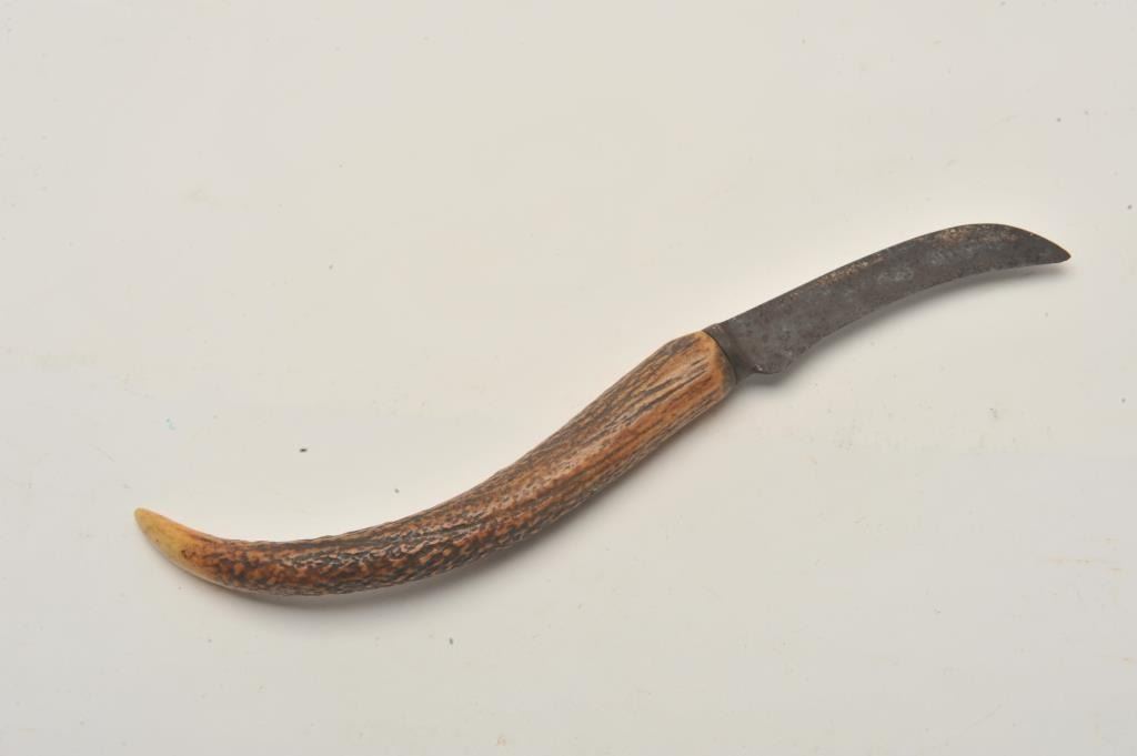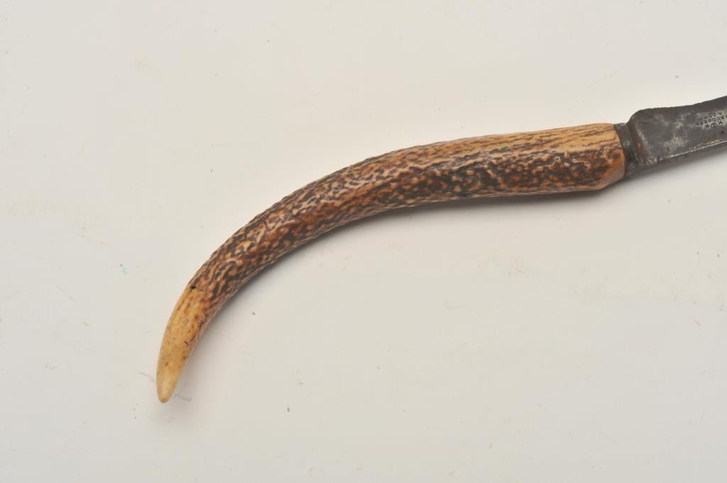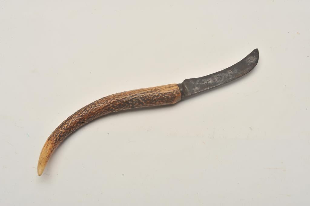 Lot 967 18CA-300 CURVED KNIFE19th century “Curved Knife” for skinning. The blade is marked “W.R.” with crow