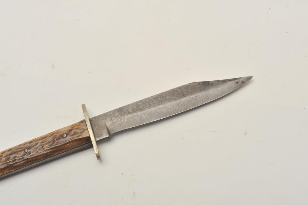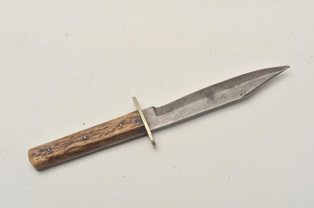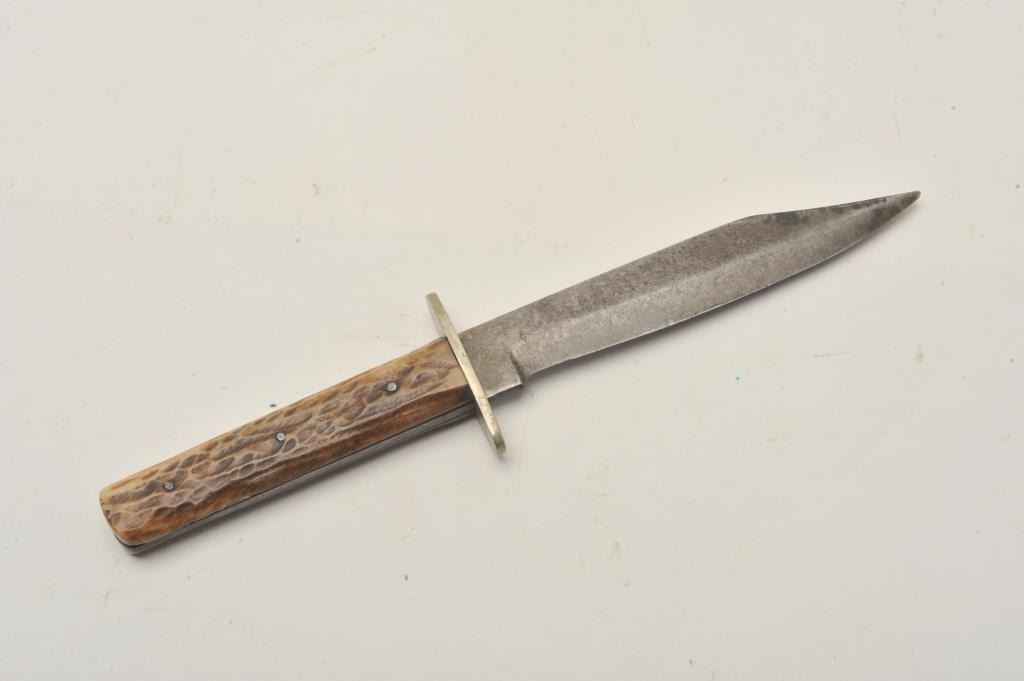 18CA-315 CLIP POINT BELT SIZE KNIFEClip point belt size knife with stag grip marked ____ Razor Co., Czechoslovakia. Circa 19th century. Measures 9 ½” overall. Good patina with considerable sharpening to the edge and clipped point. Est.: $100-$200Clip point belt size knife with stag grip marked ____ Razor Co., Czechoslovakia. Circa 19th century. Measures 9 ½” overall. Good patina with considerable sharpening to the edge and clipped point. Est.: $100-$200