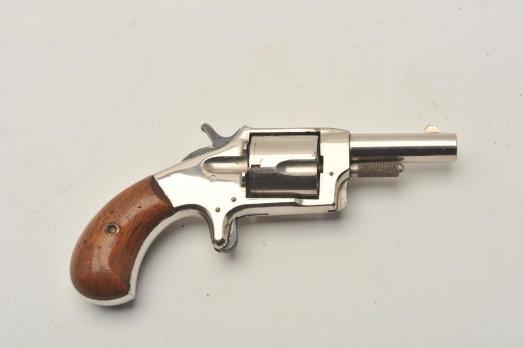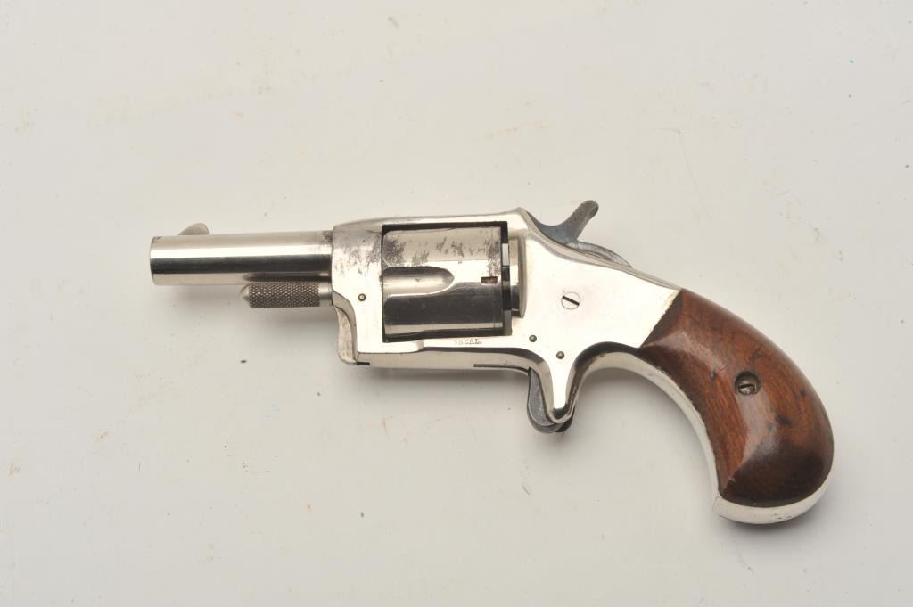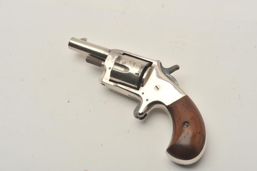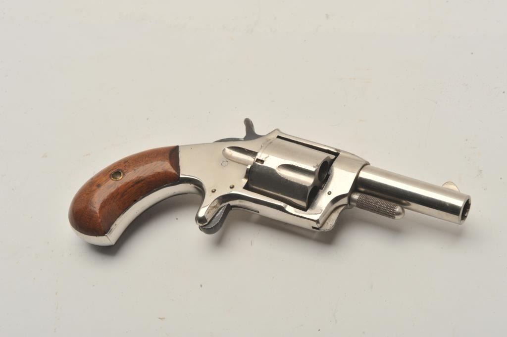 18CA-317 1870'S SPUR TRIGGER1870’s spur trigger revolver in .38 rim fire caliber and marked “Smoker”. Measures 7 ½” overall with a 2 ½” round barrel. Nickel plated with wood grips. Fine case hardening on the hammer. 90%-95% original nickel. Verygood plus to almost fine. Frontier era. (Antique) Est.: $200-$4001870’s spur trigger revolver in .38 rim fire caliber and marked “Smoker”. Measures 7 ½” overall with a 2 ½” round barrel. Nickel plated with wood grips. Fine case hardening on the hammer. 90%-95% original nickel. Verygood plus to almost fine. Frontier era. (Antique) Est.: $200-$400