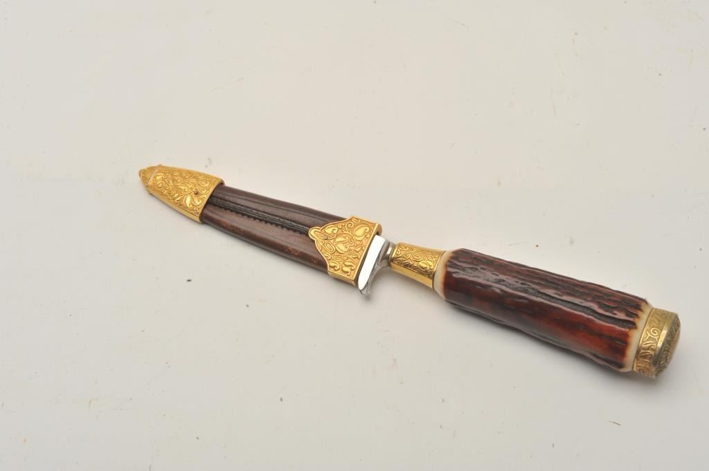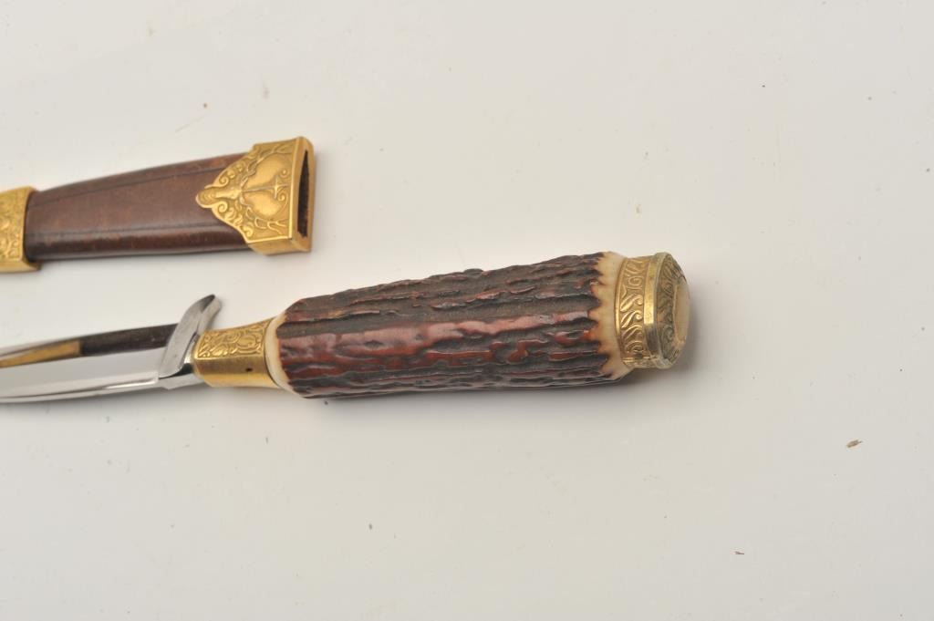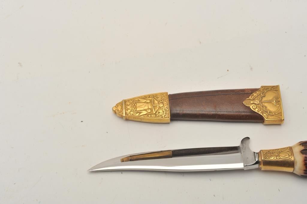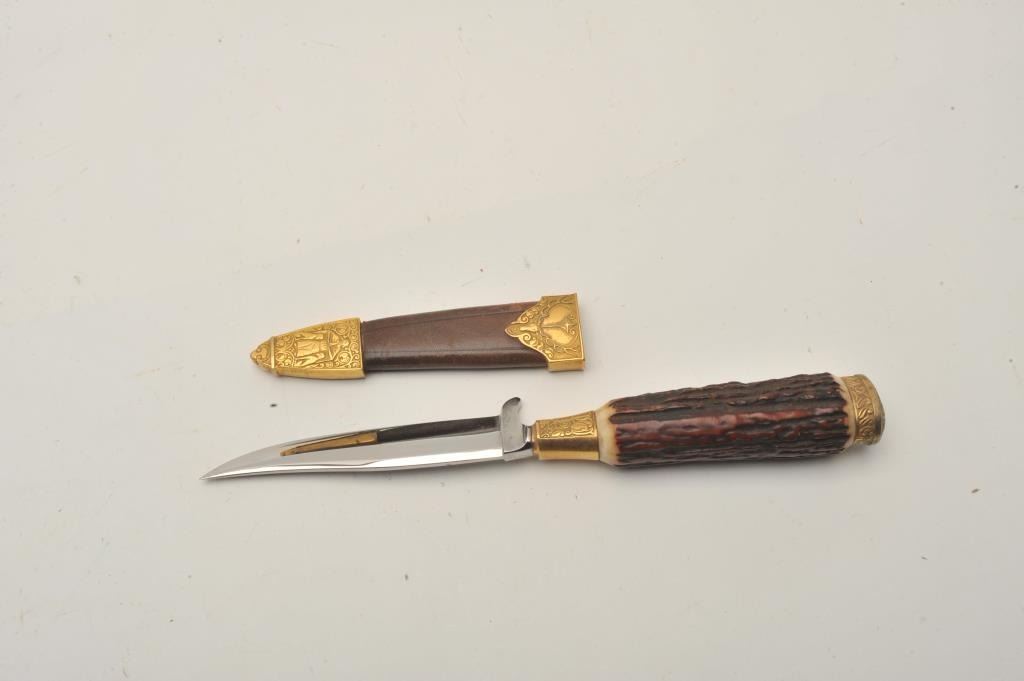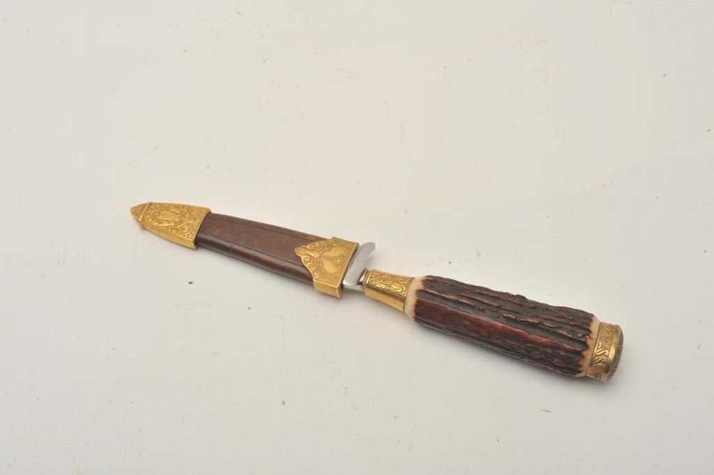 18CA-319 PRE WWII GERMAN HUNTING KNIFEPre-World War II German hunting knife by Othello Solingen marked “Rosttrei”. Measures 9 5/8” overall with a 4 ¾” blade. Fancy rich gold plated mounts with scene of St. Hubertus and Christ deer. Excellent condition. Theestate of Gary Harrison, Rancho Bernardo, CA. Est.: $250-$500Pre-World War II German hunting knife by Othello Solingen marked “Rosttrei”. Measures 9 5/8” overall with a 4 ¾” blade. Fancy rich gold plated mounts with scene of St. Hubertus and Christ deer. Excellent condition. Theestate of Gary Harrison, Rancho Bernardo, CA. Est.: $250-$500