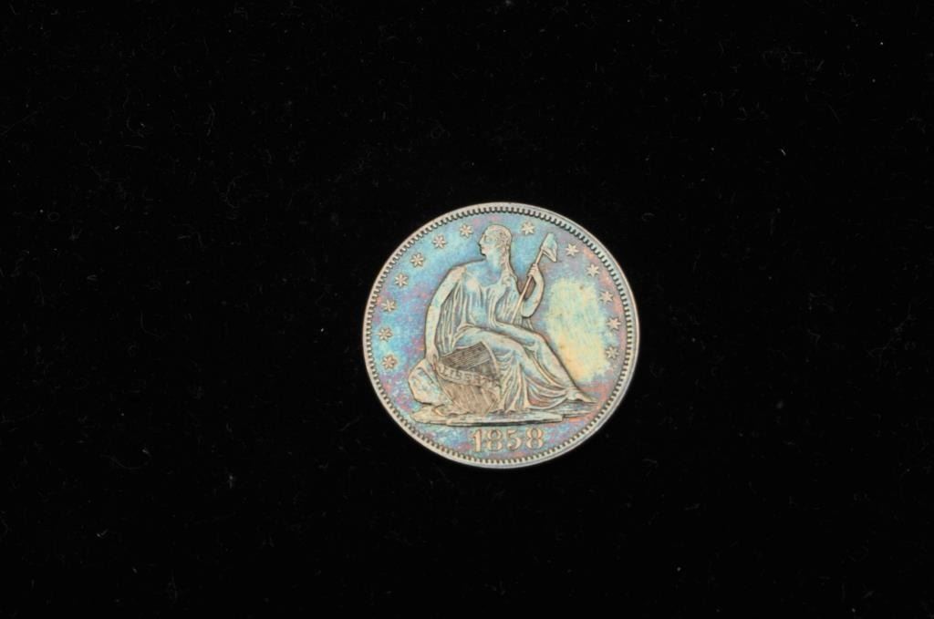 17HD-109 1858 HALF DOLLAR1858 seated liberty half dollar. AU-55 plus (Sleeper). Blue toned. Not professionally graded. Est.: $300-$600++1858 seated liberty half dollar. AU-55 plus (Sleeper). Blue toned. Not professionally graded. Est.: $300-$600++