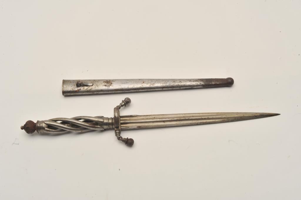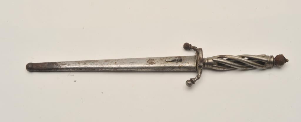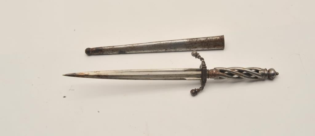18AR-81 PIERCED HILT DAGGERPierced hilt dagger, 18th to 19th Century, approximately 10” overall with a 6.5” blade and metal sheath; overall good condition with some surface rust on the grip, pommel and blade tip from long storage; some scatteredspots of storage rust also on sheath. Est.: $400-$800.Pierced hilt dagger, 18th to 19th Century, approximately 10” overall with a 6.5” blade and metal sheath; overall good condition with some surface rust on the grip, pommel and blade tip from long storage; some scatteredspots of storage rust also on sheath. Est.: $400-$800.
