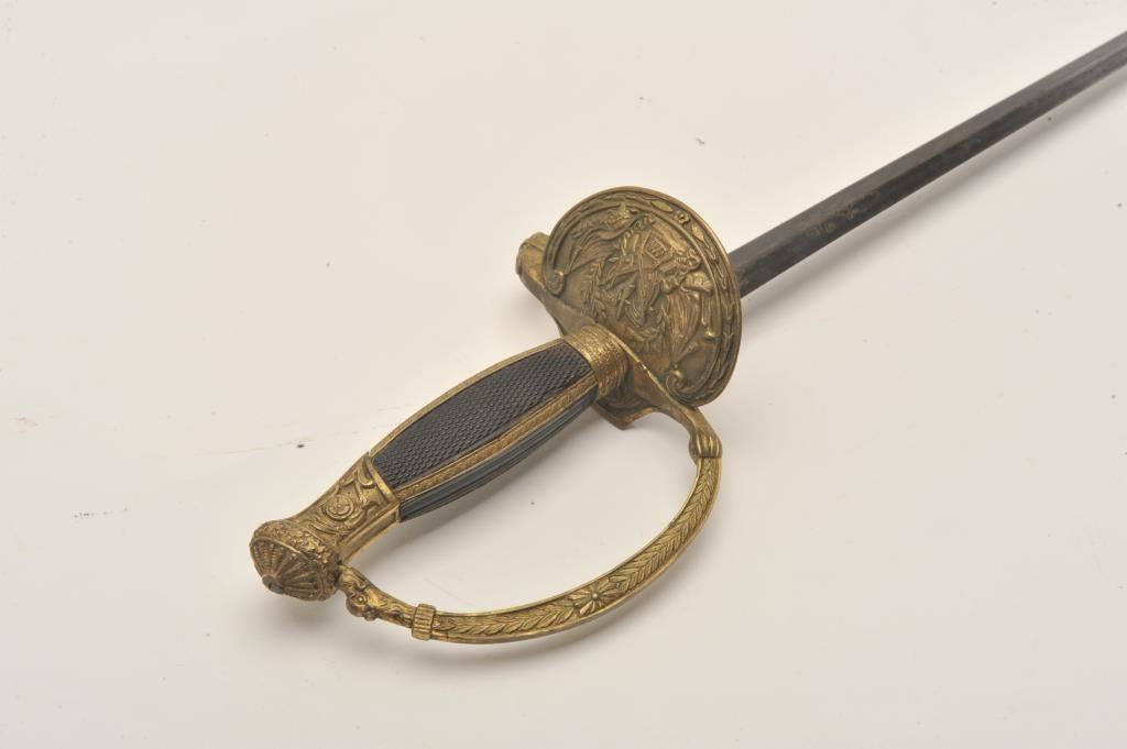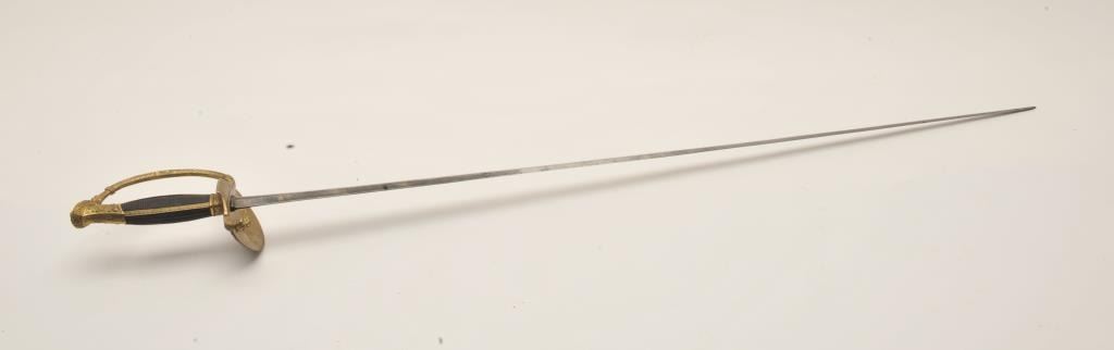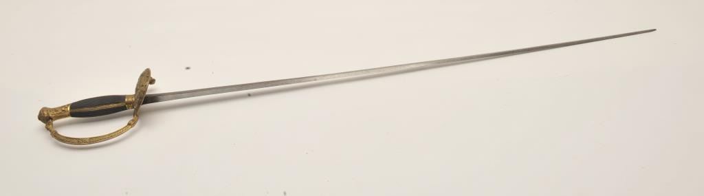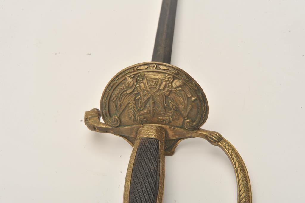 18AR-78 COURT SWORDCourt sword (no scabbard) with etched blade, fancy brass guard and pommel with checkered inset wood grip; approximately 38” overall with a 33” blade in overall good condition. Est.: $350-$700.Court sword (no scabbard) with etched blade, fancy brass guard and pommel with checkered inset wood grip; approximately 38” overall with a 33” blade in overall good condition. Est.: $350-$700.
