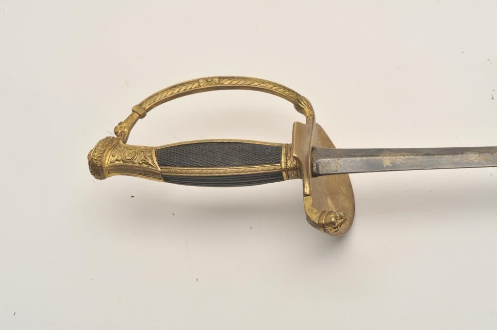 Lot 1005 18AR-78 COURT SWORDCourt sword (no scabbard) with etched blade, fancy brass guard and pommel with c
