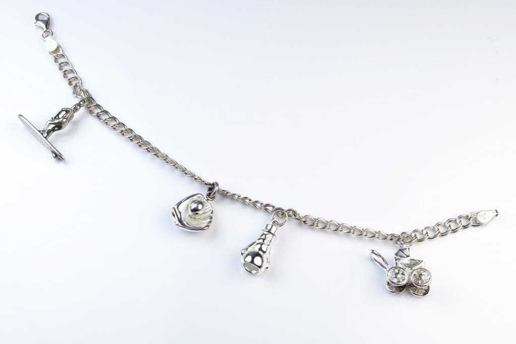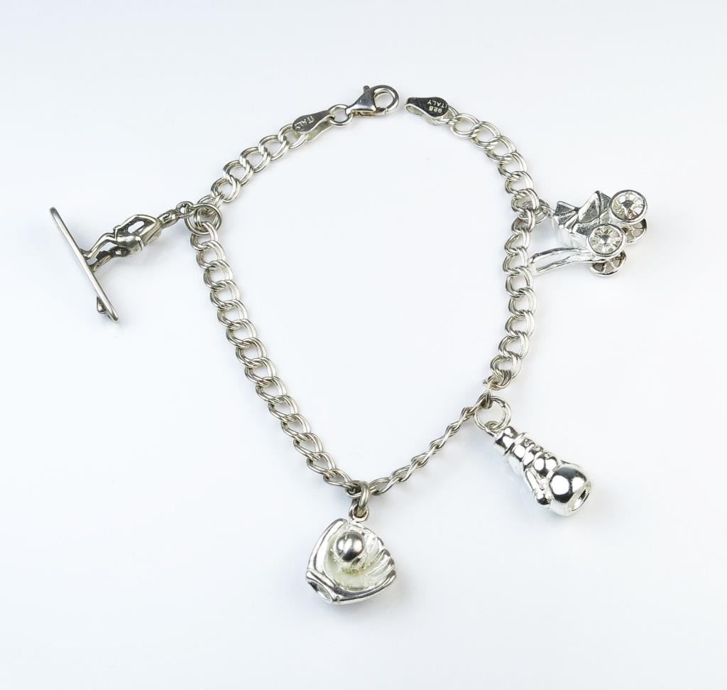185CAI-69 CHARM BRACELETNice Vintage Italian charm bracelet featuring baseball surfer stroller and snowman charms in Sterling silver. Estimates $100-$200 NiceNice Vintage Italian charm bracelet featuring baseball surfer stroller and snowman charms in Sterling silver. Estimates $100-$200 Nice